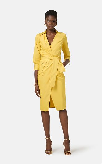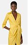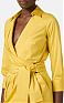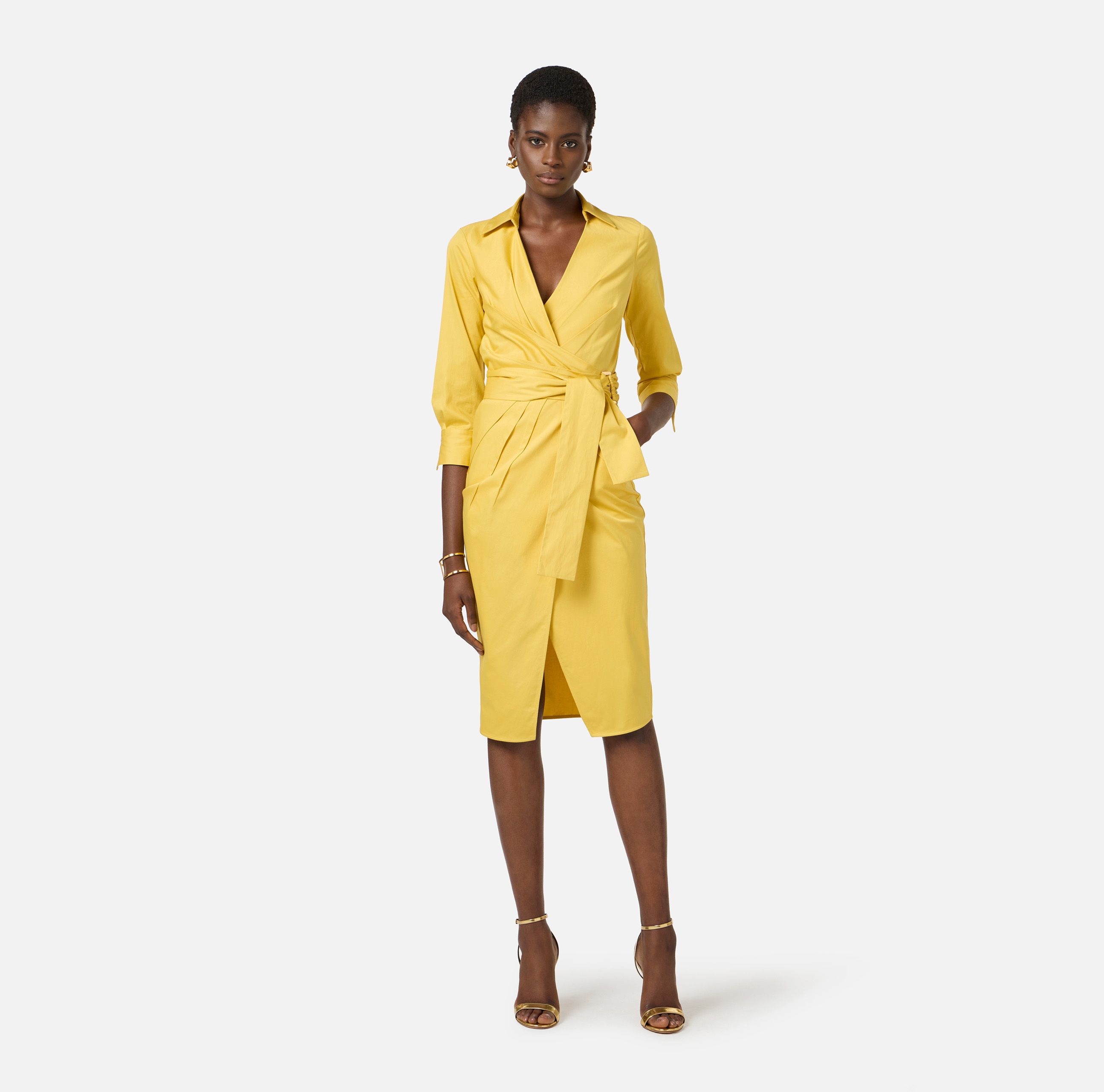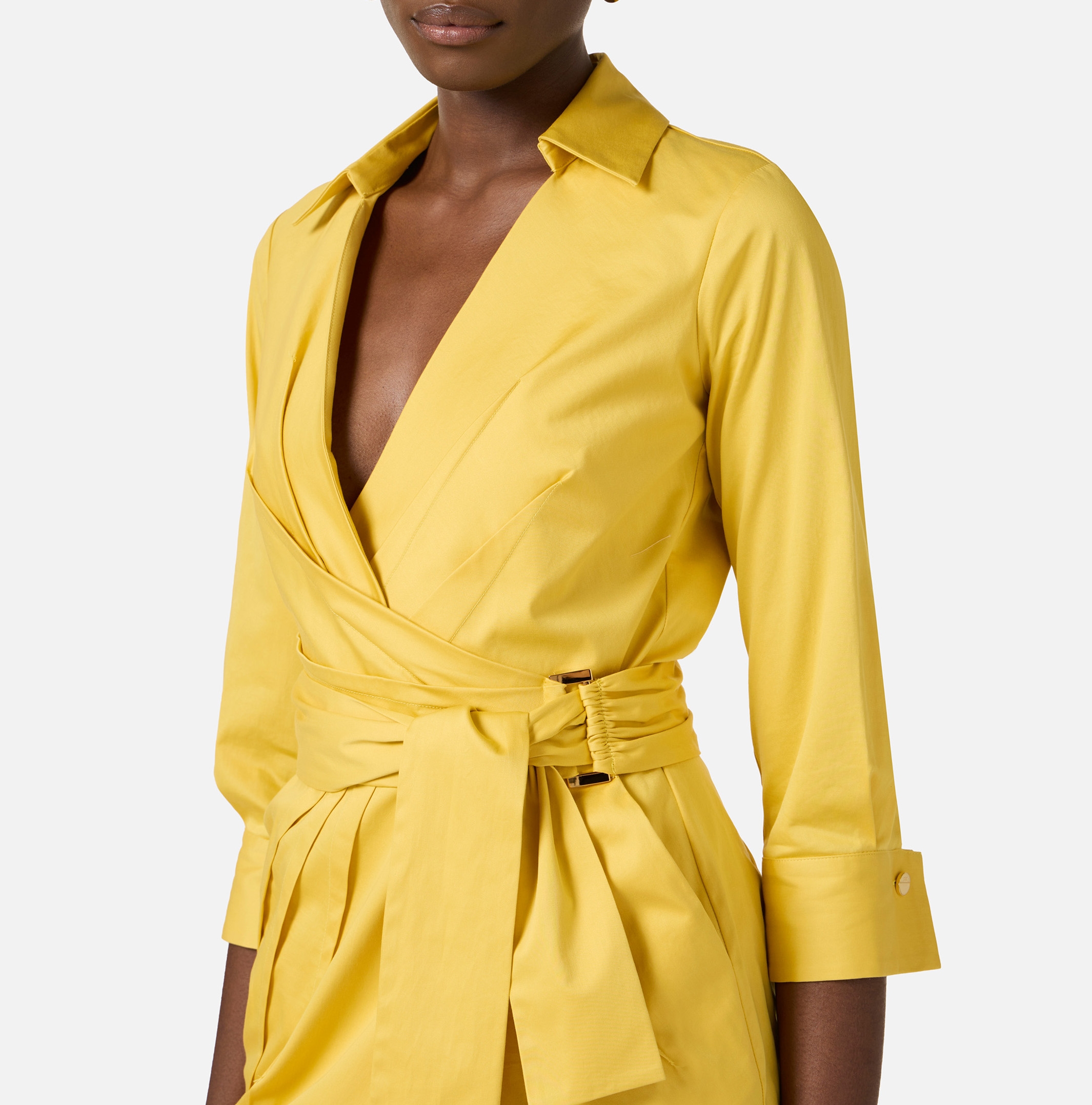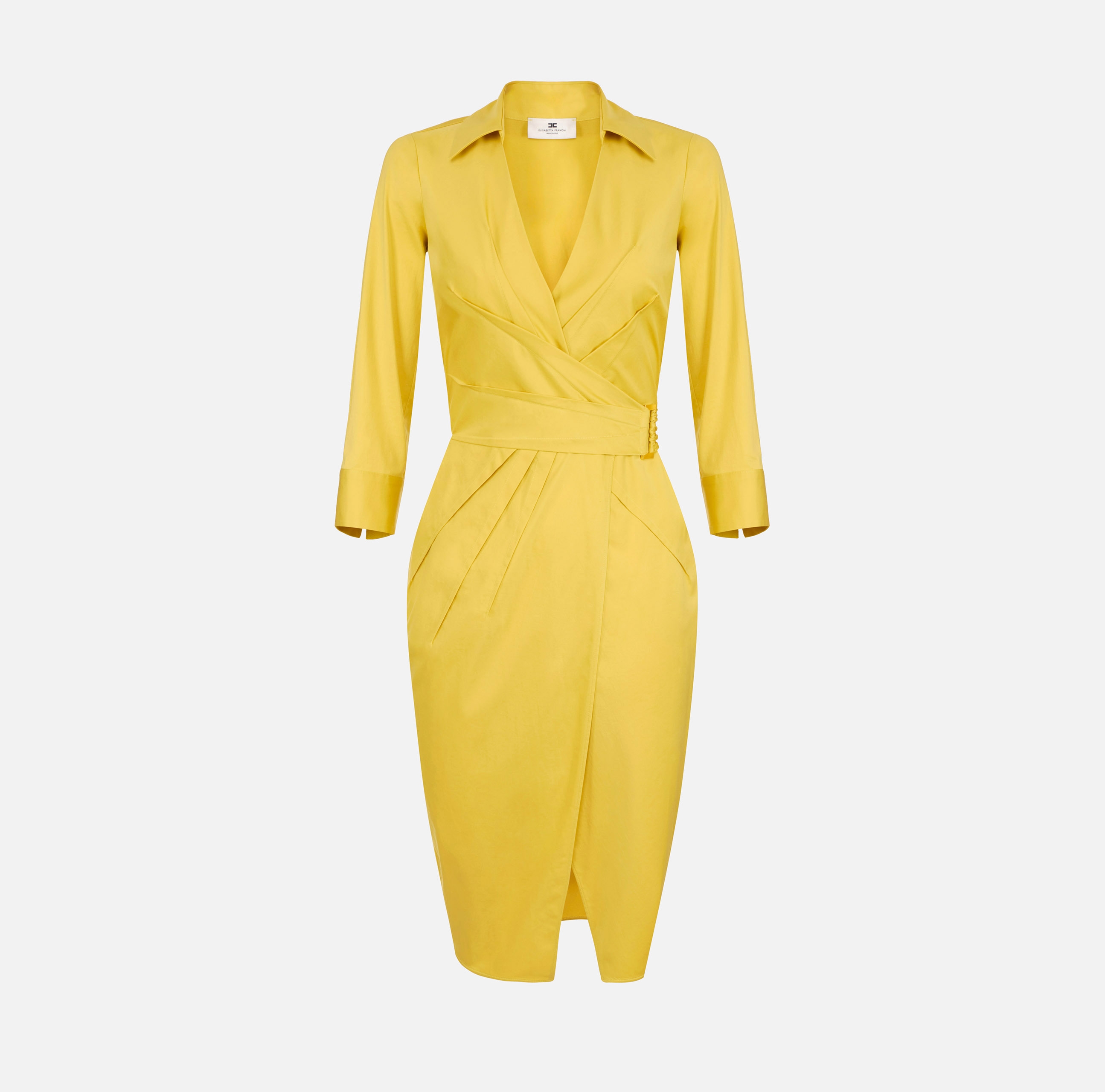 Платье с запа́хом из хлопка стретч. Модель с горловиной внахлёст, рубашечным воротником, рукавами ¾ и манжетами с запонками. Застроченные защипы, вывернутые наружу, образуют складки, нового сезона Элизабетта Франчи весна-лето 2026