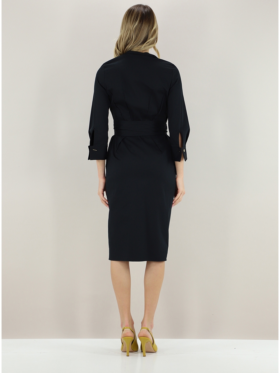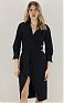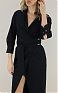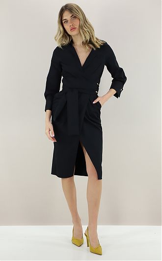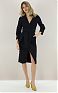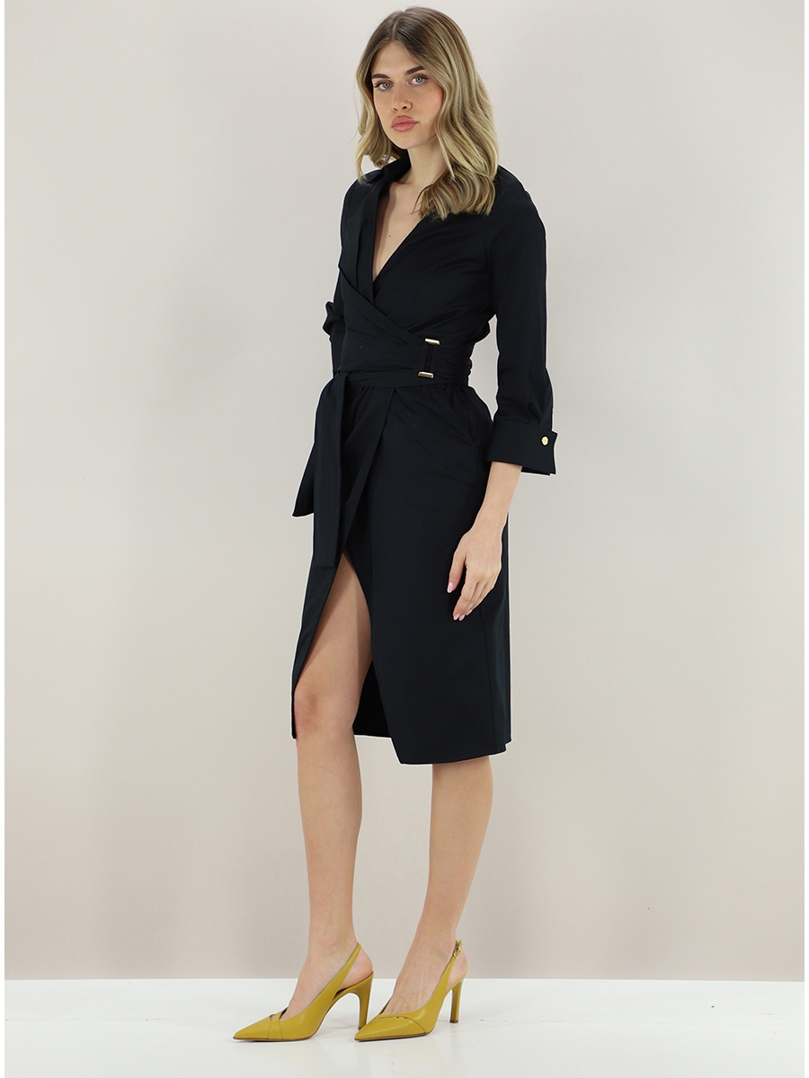 Платье с запа́хом из хлопка стретч. Модель с горловиной внахлёст, рубашечным воротником, рукавами ¾ и манжетами с запонками. Застроченные защипы, вывернутые наружу, образуют складки,  нового сезона Элизабетта Франчи весна-лето 2026