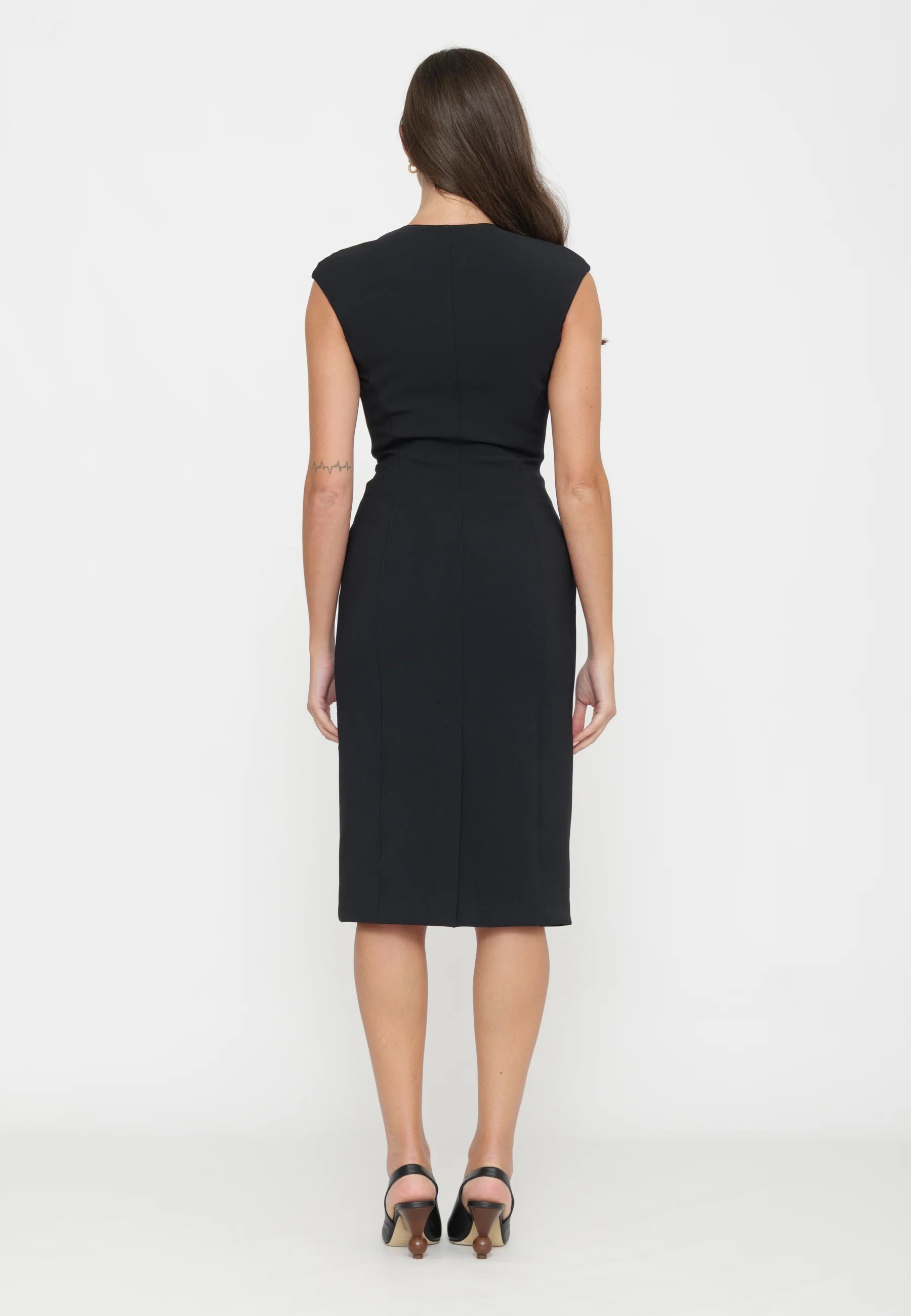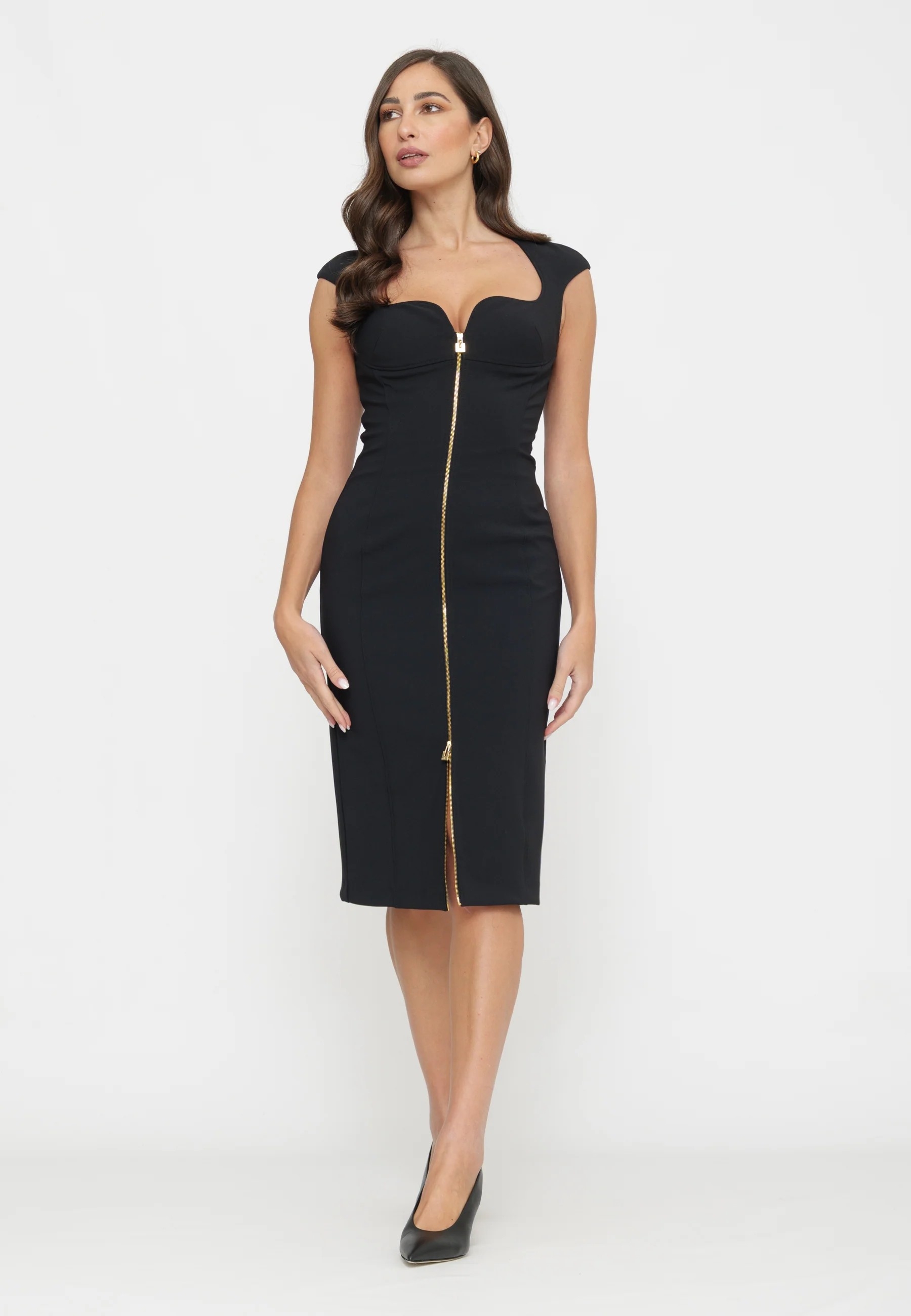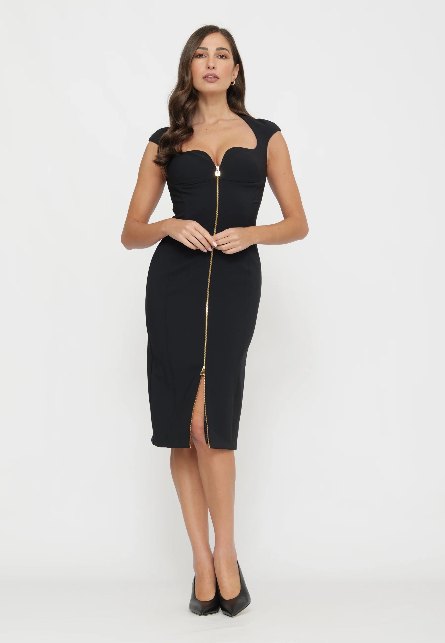 Облегающее платье-футляр из двойного крепа стретч. Модель оформлена глубоким декольте в форме сердца, короткими рукавами-крылышками нового сезона Элизабетта Франчи весна-лето 2026