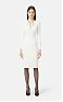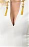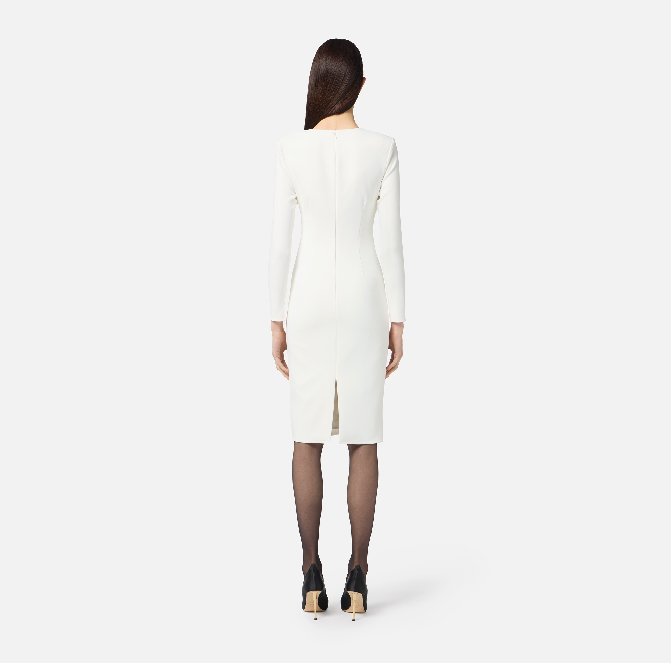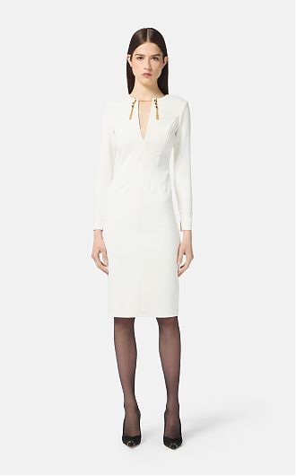 Приталенное платье из лёгкого крепа. Модель оформлена структурированными плечами и круглой горловиной с V-образным вырезом, декорированным запонками с цепочкой и кисточками с текстурой под змеиную кожу, которые можно снять для создания новых стильных образов, нового сезона Элизабетта Франчи осень-зима 2025/26