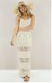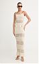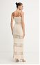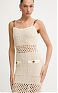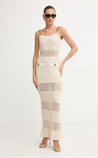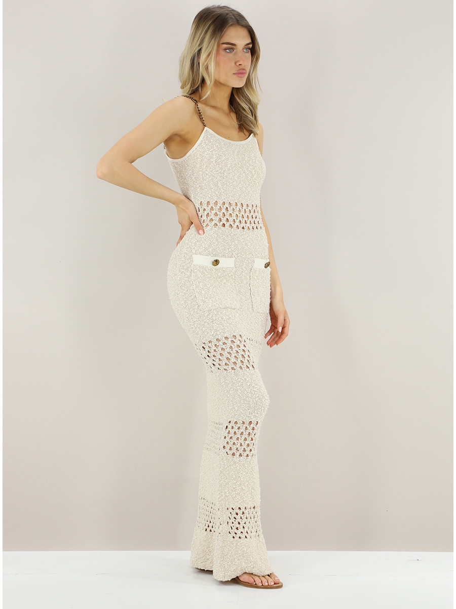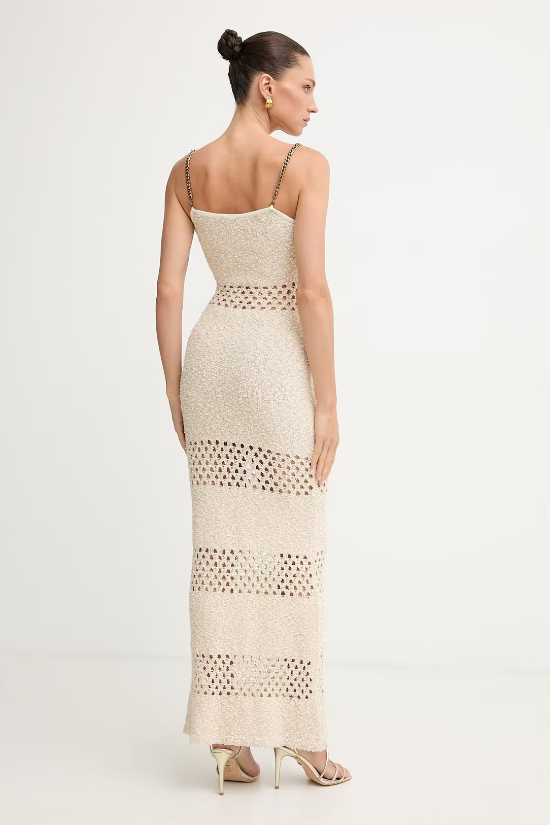 Длинное трикотажное платье. Мягкая отделка букле с добавлением блестящего люрекса чередуется с ажурными вставками для создания разнообразия текстур. Роскошные бретели выполнены в виде цепочки, одна из них украшена подвеской в форме медальона. Дизайн завершают золотистые пуговицы с винтажным эффектом, нового сезона Элизабетта Франчи весна-лето 2026