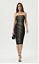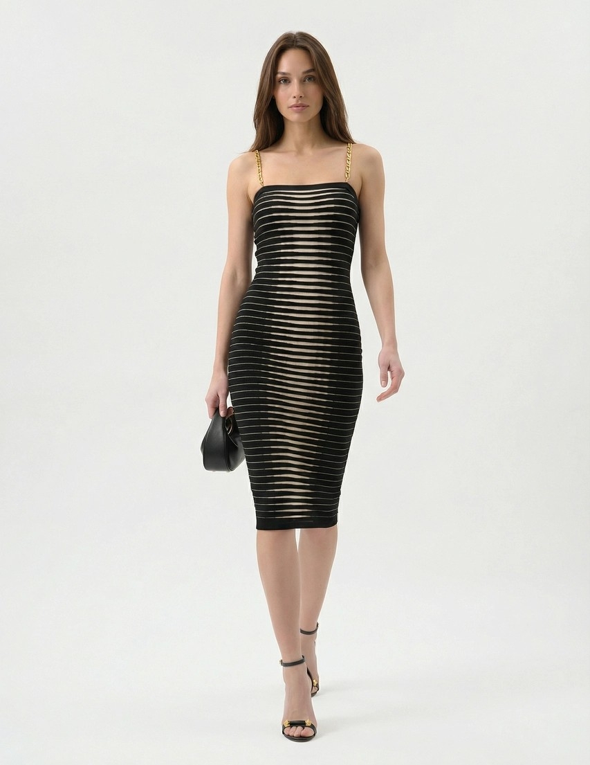 Трикотажное платье-футляр. Жаккардовый узор воссоздаёт полосатый рисунок. Неожиданную нотку в дизайн модели вносят роскошные бретельки из золотистой цепочки с логотипом, которые можно снять для создания новых образов, нового сезона Элизабетта Франчи весна-лето 2026.