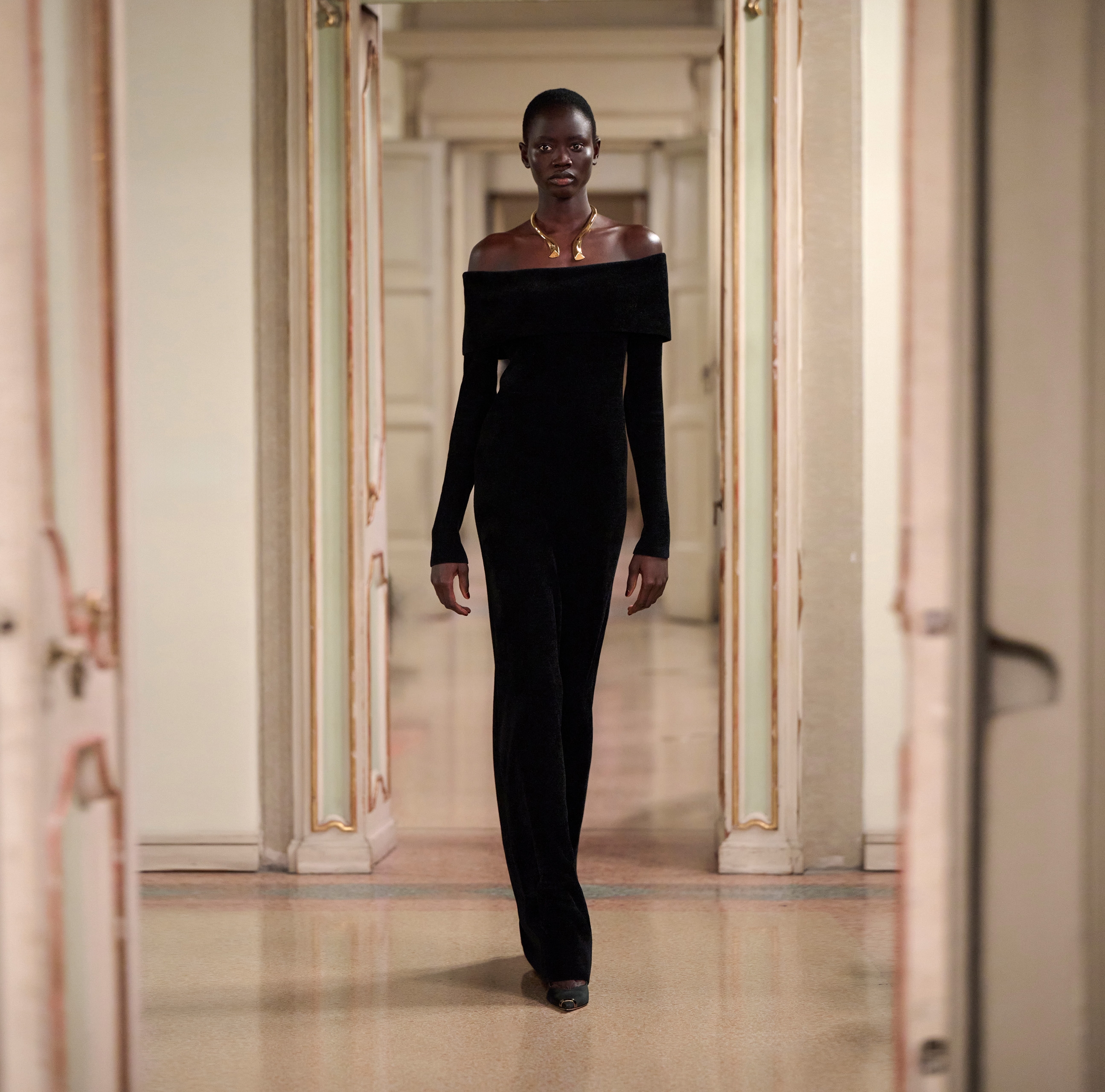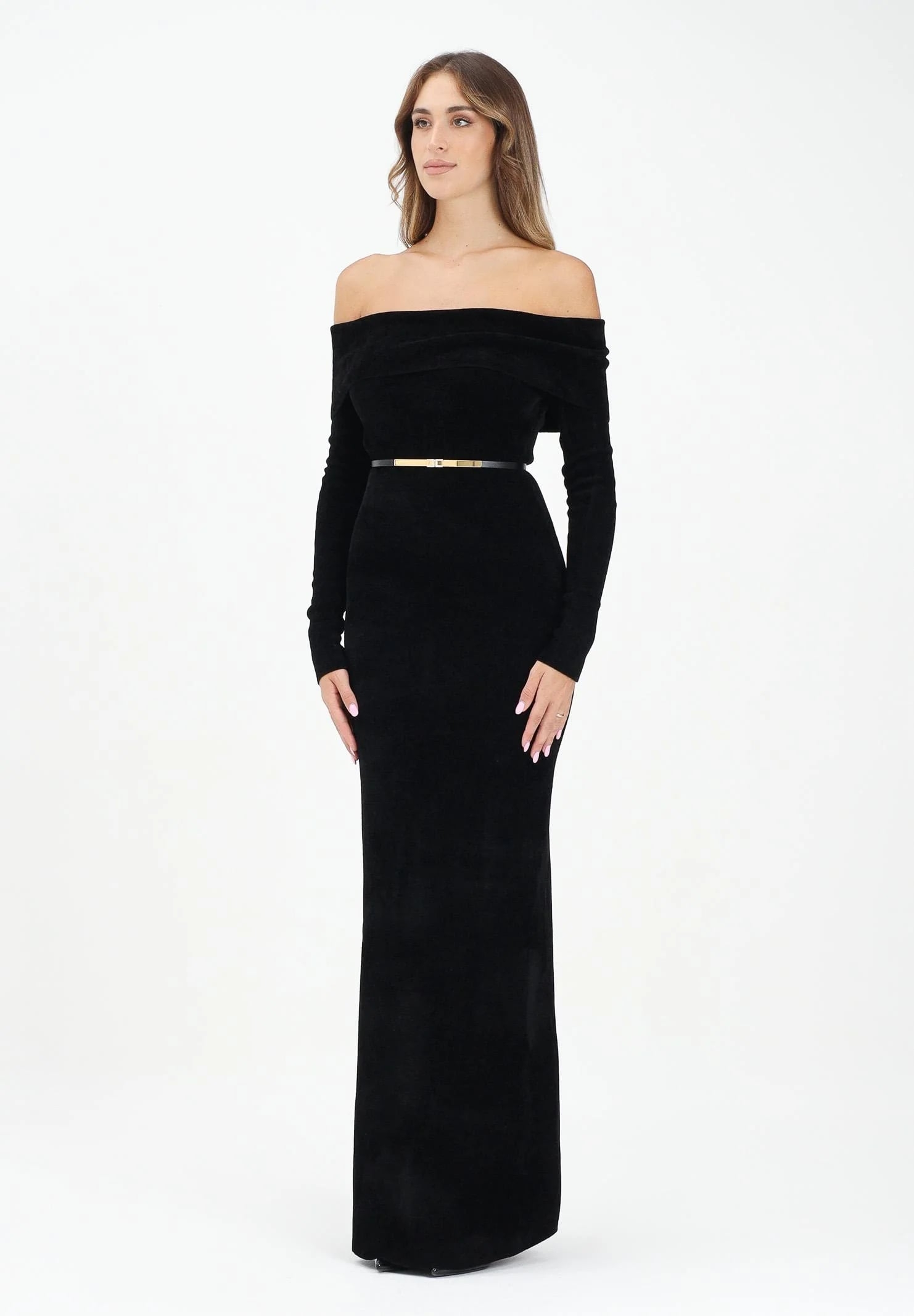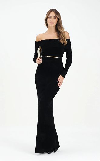 Платье вечернее с поясом и опущенными плечами нового сезона Элизабетта Франчи осень-зима 2025/26