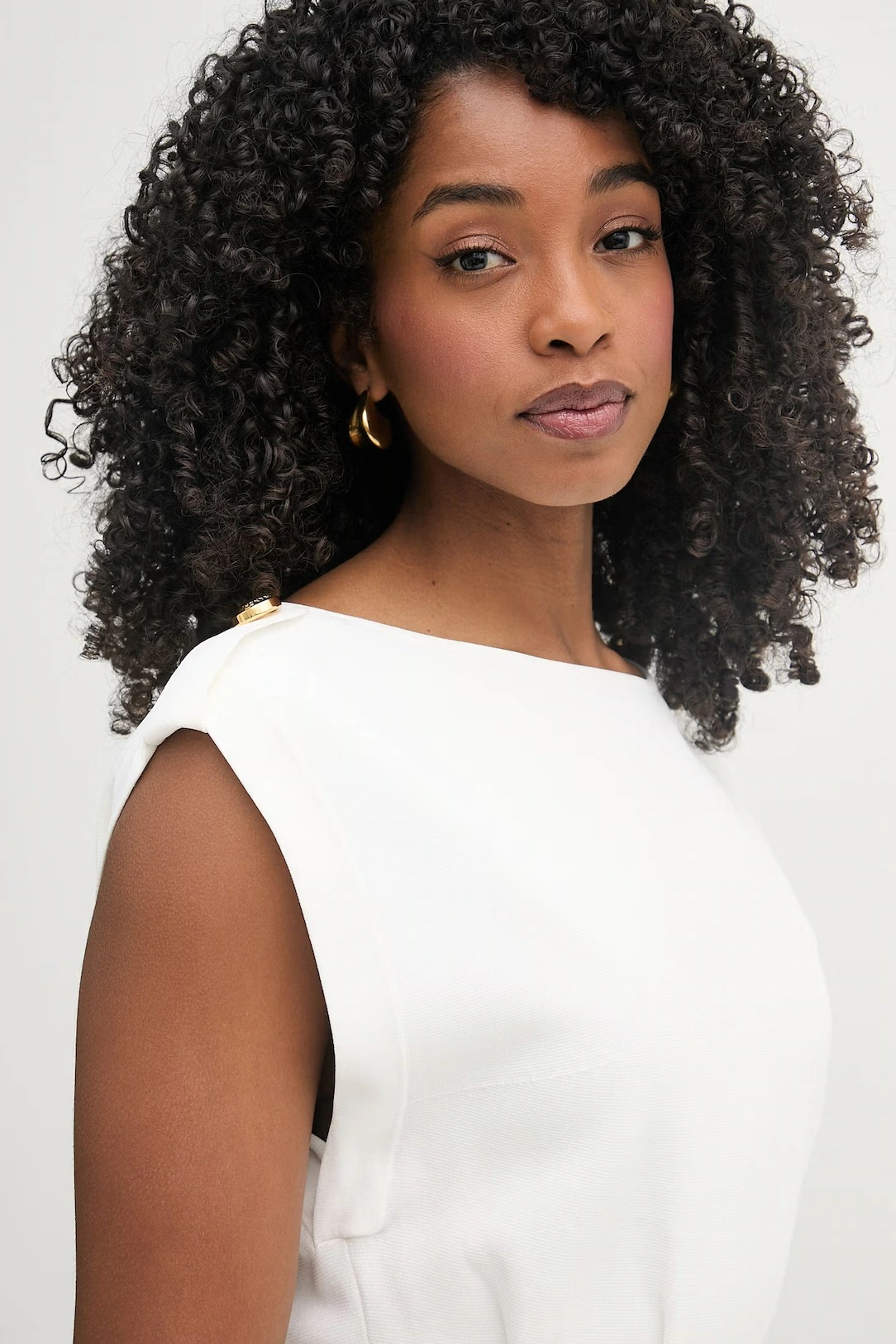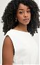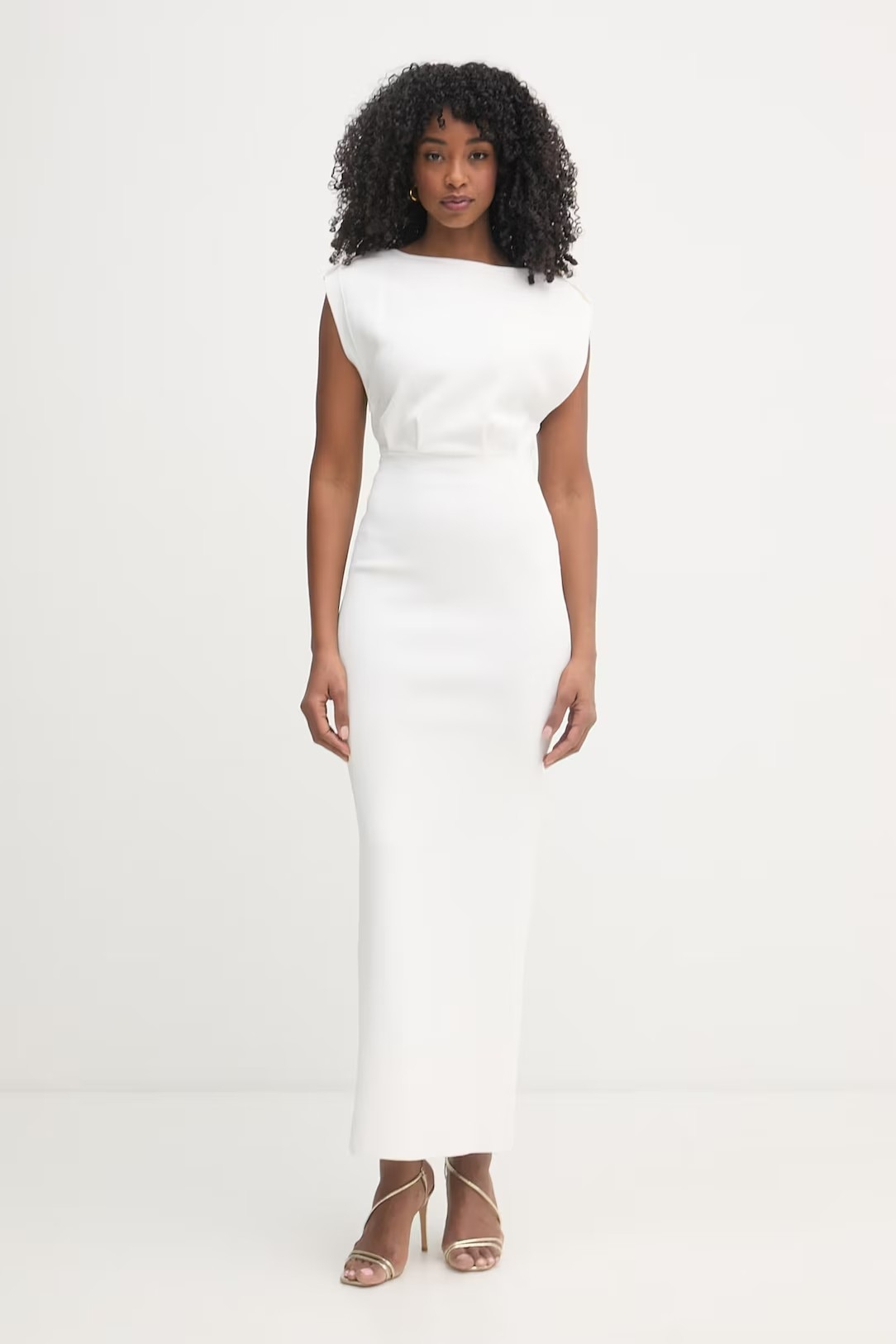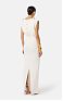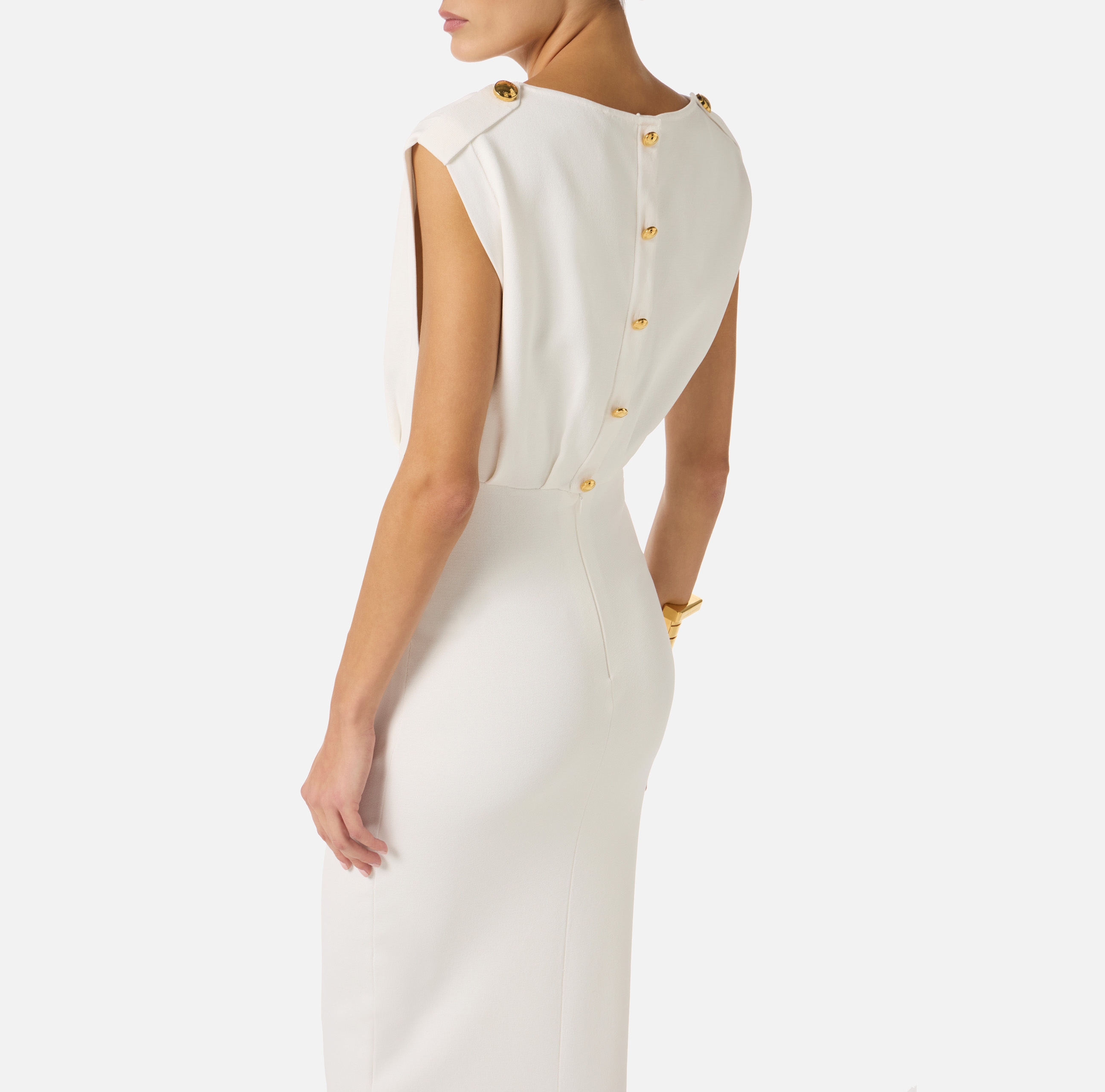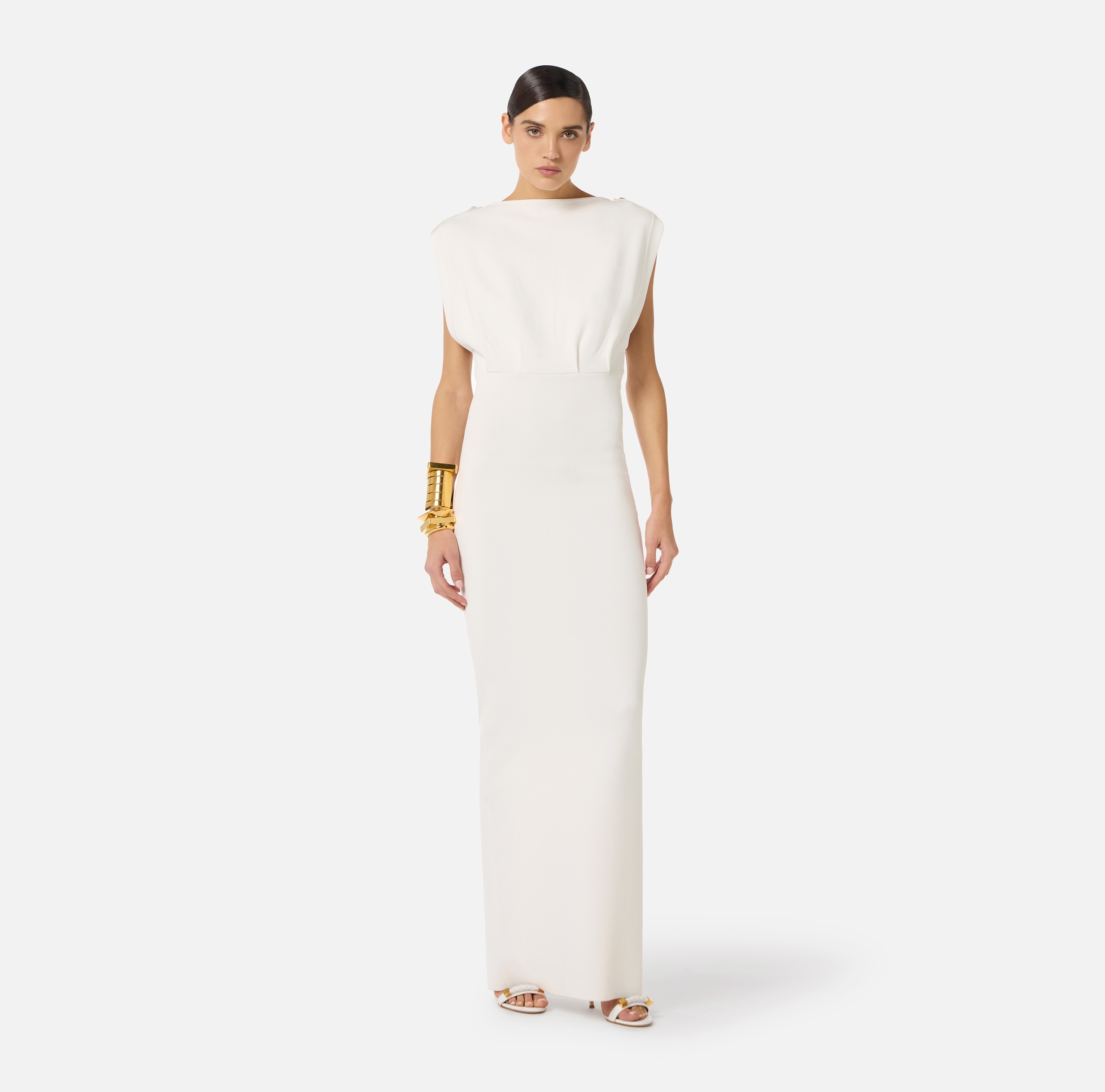 Приталенное вечернее платье без рукавов характеризуется прямым кроем и погонами на плечах. Сзади расположены вырез на спинке и центральный разрез на юбке. Пуговицы из золотистого металла вносят в изделие блестящий штрих, нового сезона Элизабетта Франчи весна-лето 2026