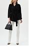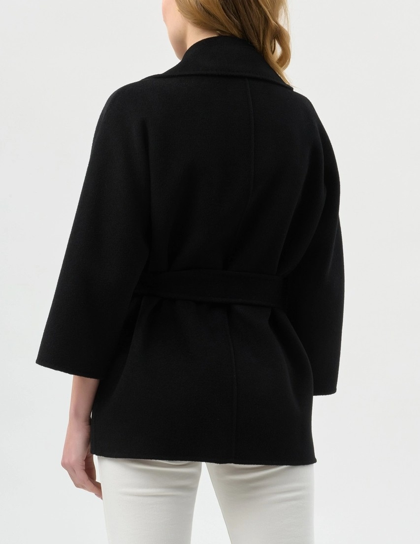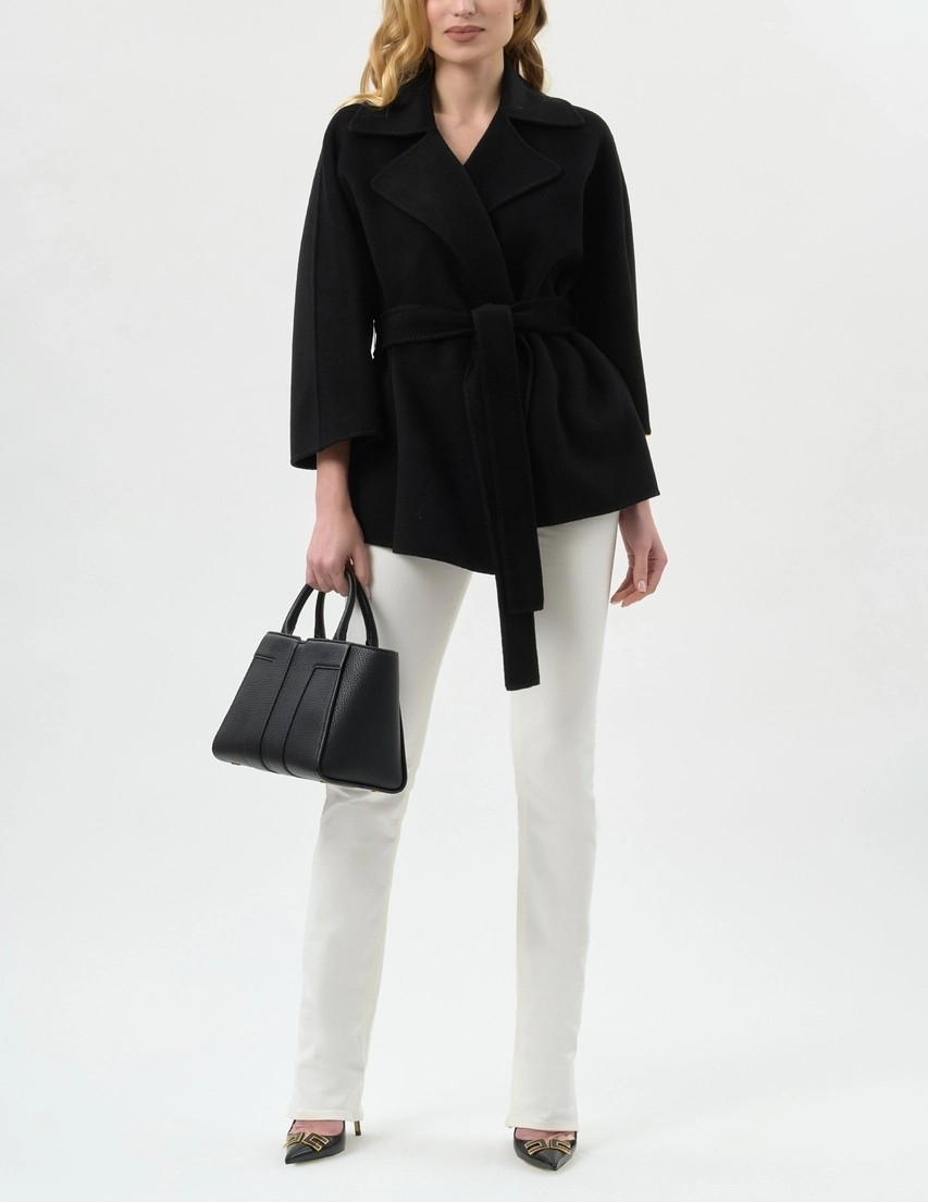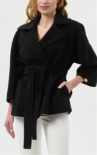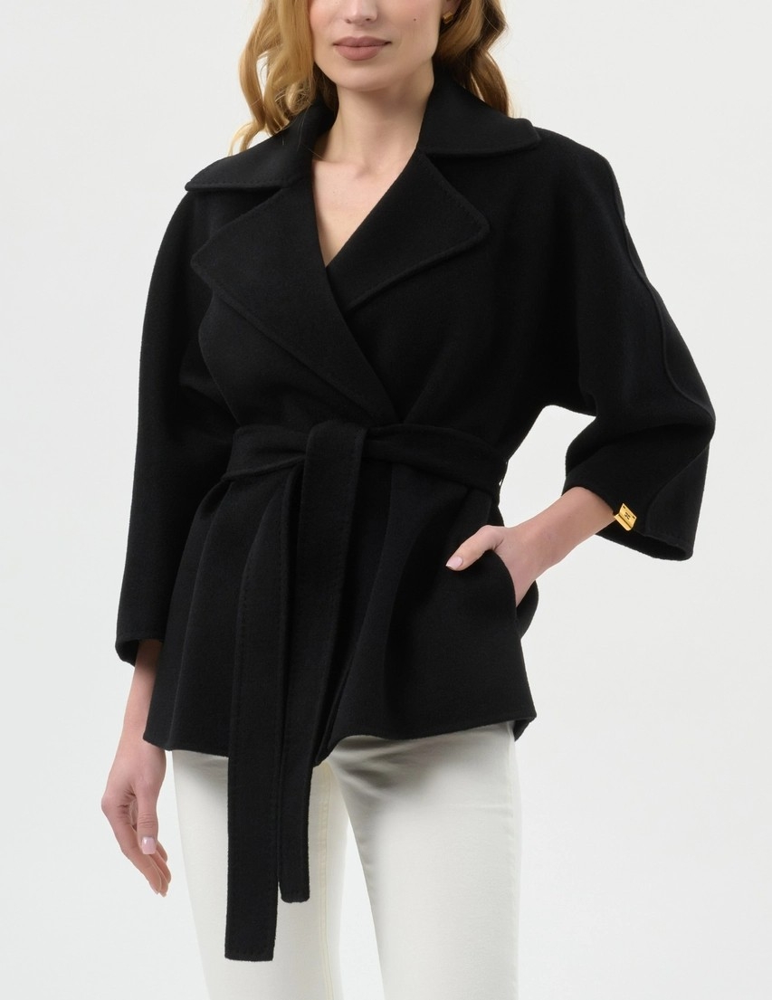 Пальто укороченное с закруглёнными лацканами и рукавами кимоно. Пояс на талии, маленький декор с логотипом на одном из рукавов добавляет в изделие блестящий штрих. Классический силуэт, из нового сезона Элизабетта Франчи весна-лето 2026.