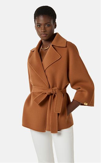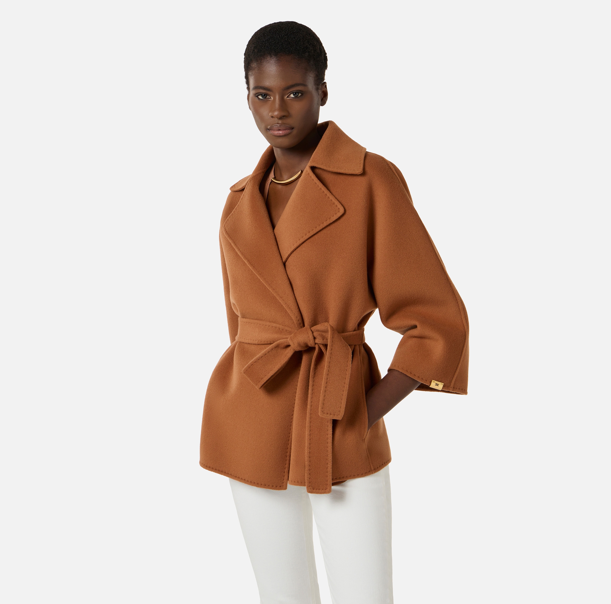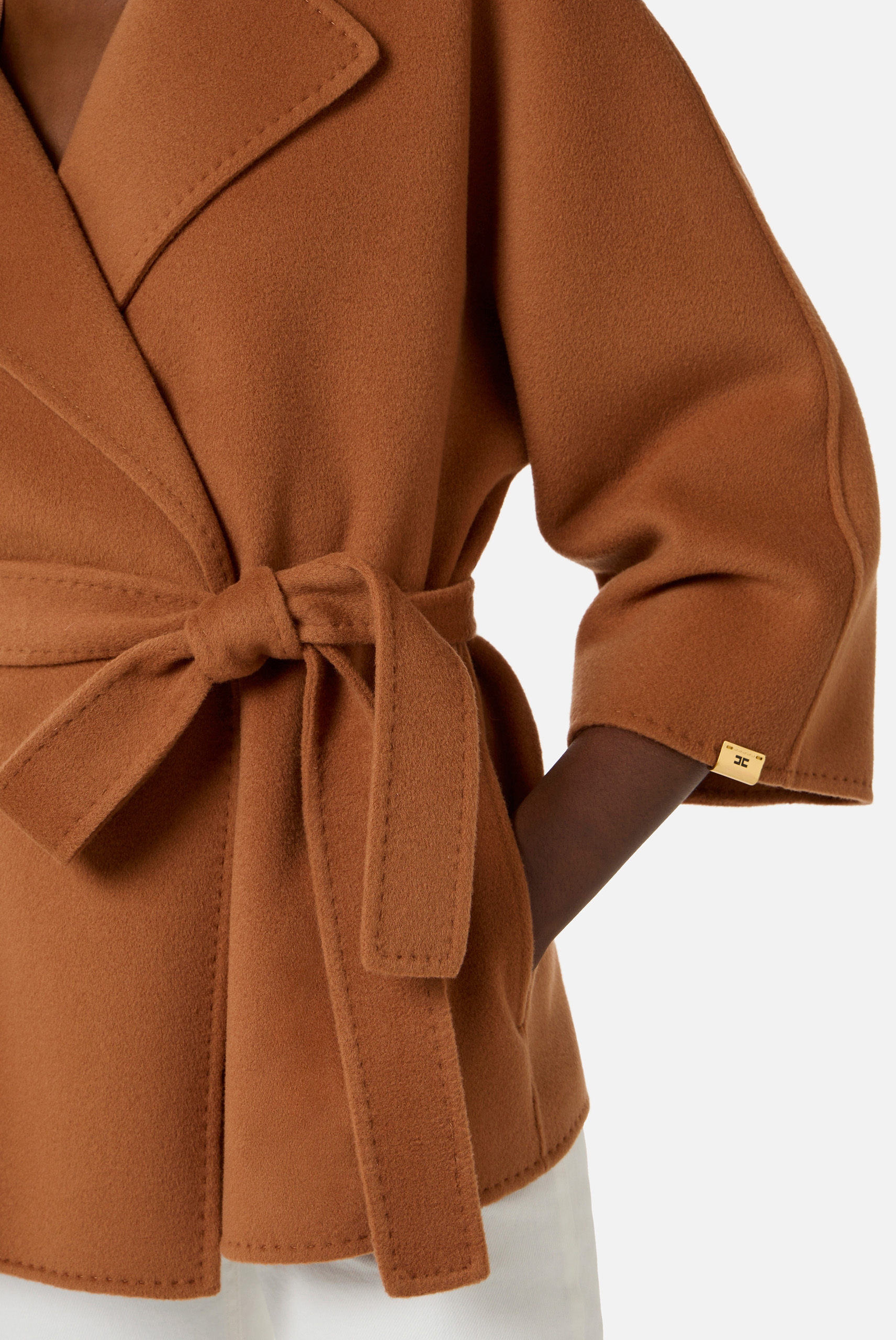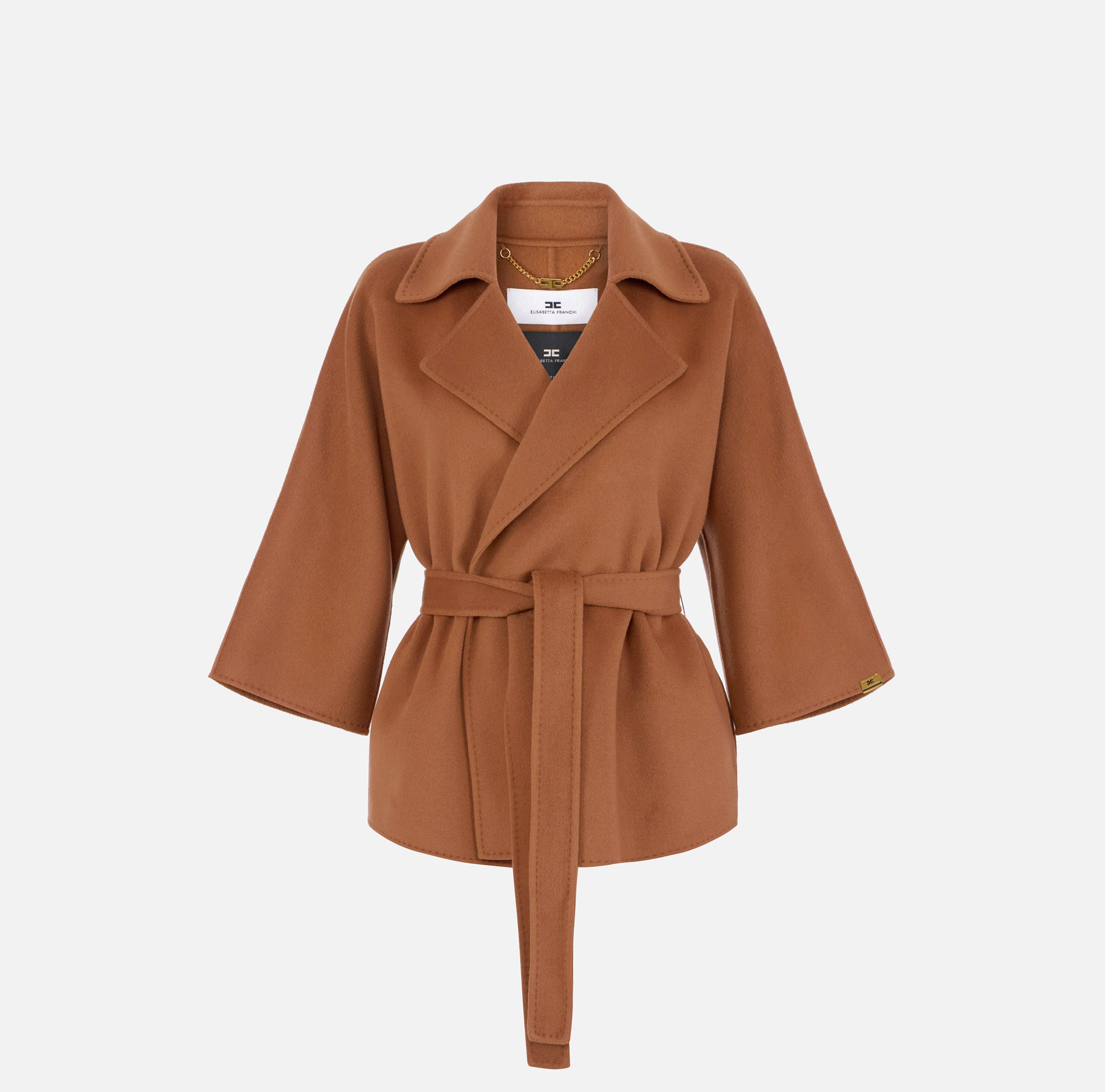 Пальто укороченное с закруглёнными лацканами и рукавами кимоно. Пояс на талии, маленький декор с логотипом на одном из рукавов добавляет в изделие блестящий штрих. Классический силуэт, из нового сезона Элизабетта Франчи весна-лето 2026.