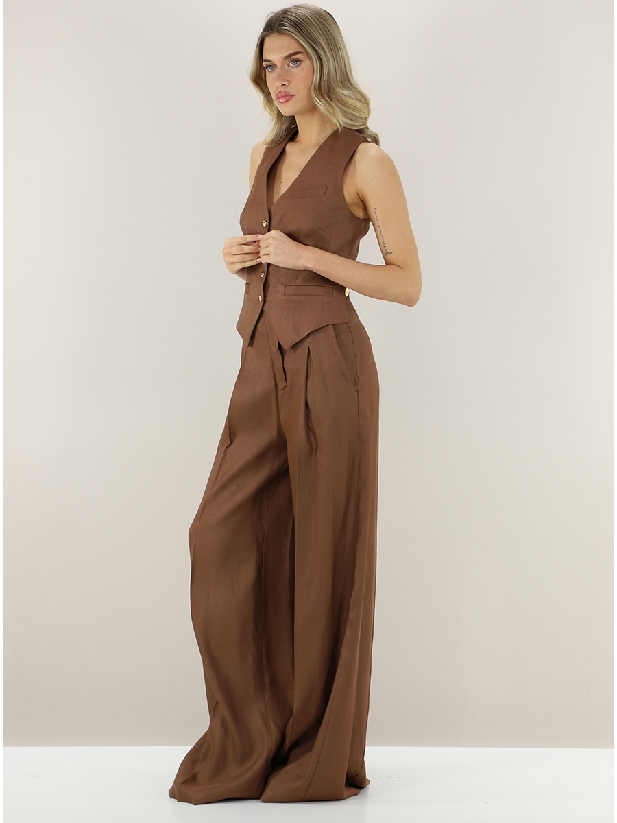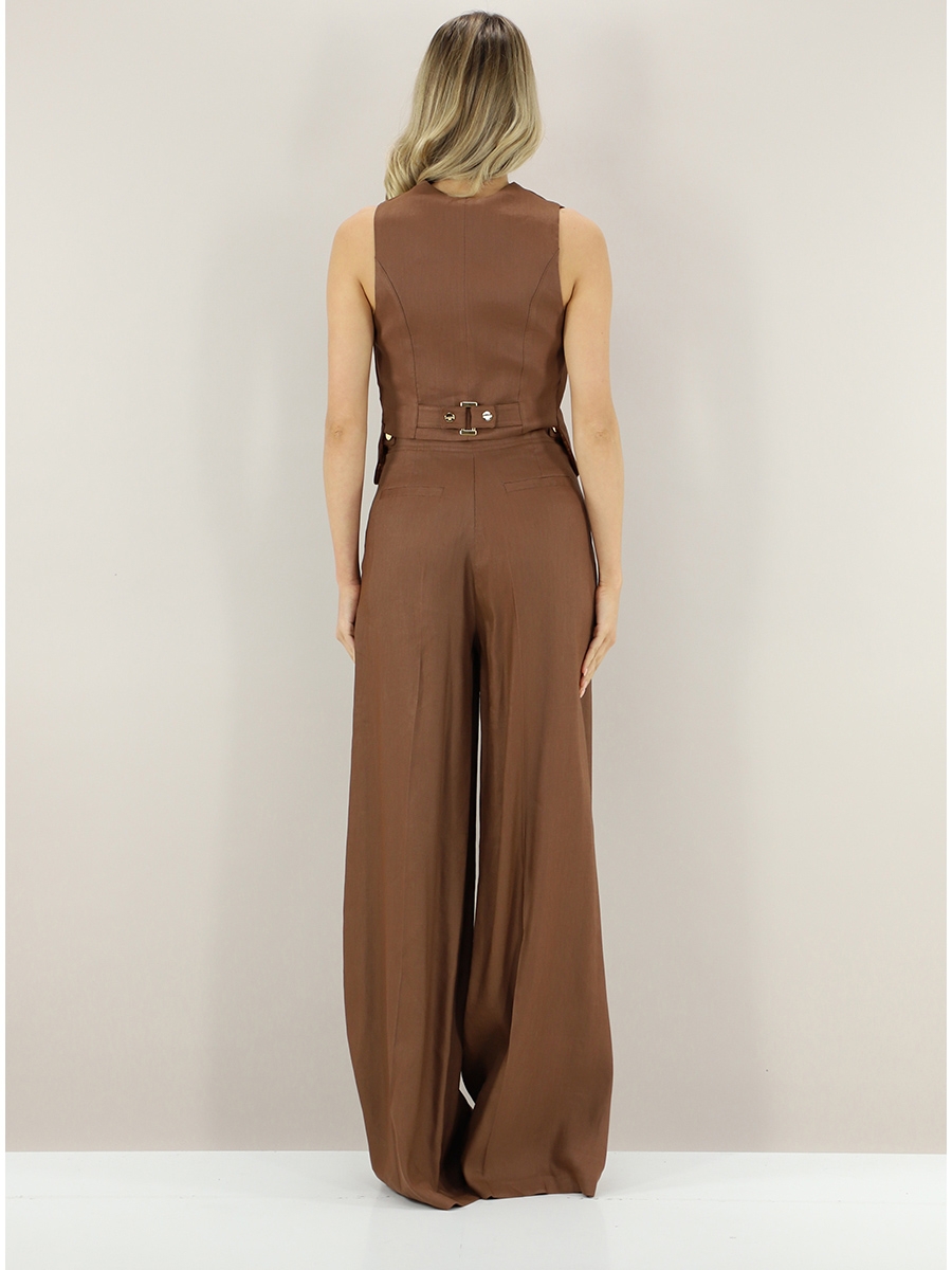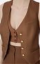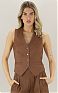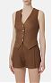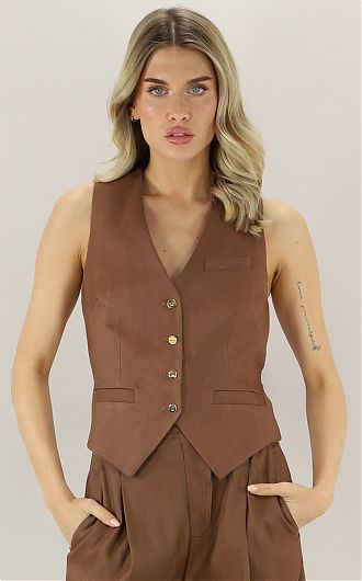 Жилет из льна. Модель характеризуется асимметричными вытачками и двойным жилетом из крепа. Ремешки с кольцом на спинке и пуговицы из золотистого металла с блеском завершают дизайн изделия, нового сезона Элизабетта Франчи весна-лето 2026