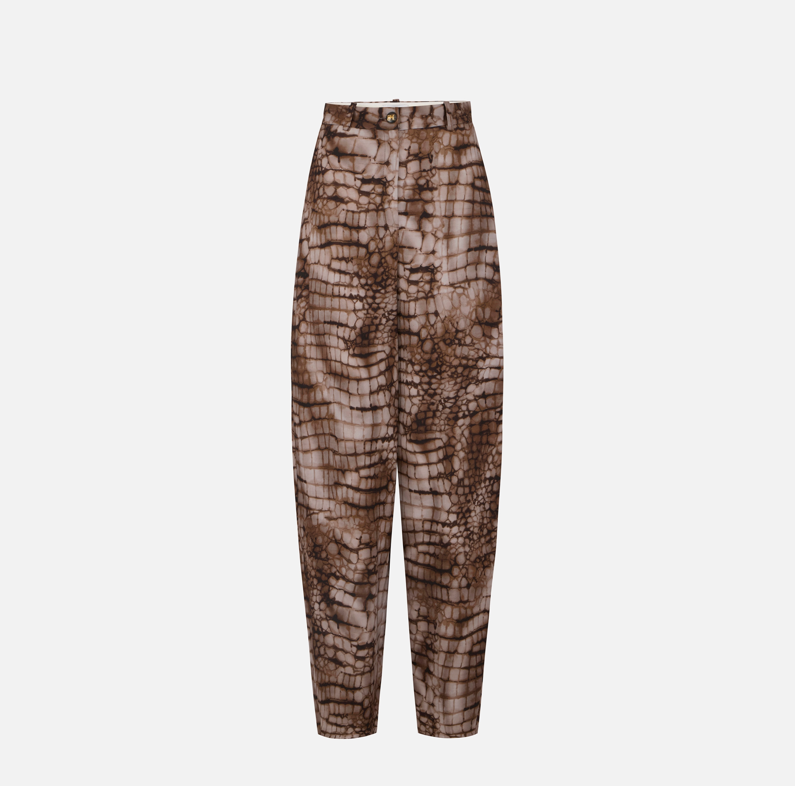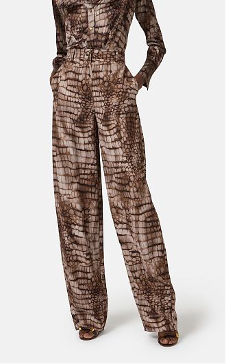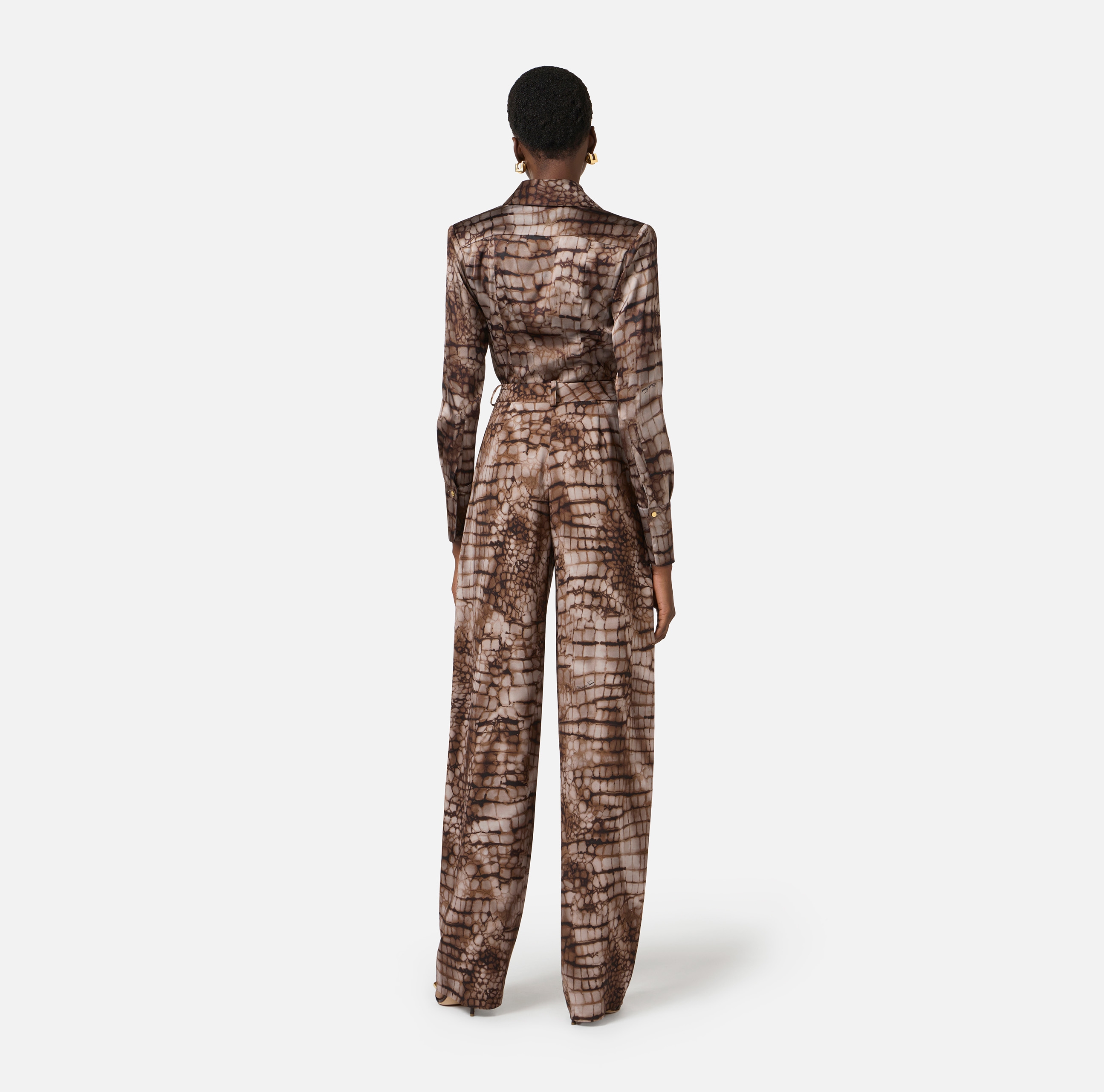 Брюки из лёгкого джерси. Изюминку в изделие вносит сплошной принт под кожу крокодила. Пуговица с логотипом из золотистого металла добавляет в изделие блестящий штрих, нового сезона Элизабетта Франчи весна-лето 2026