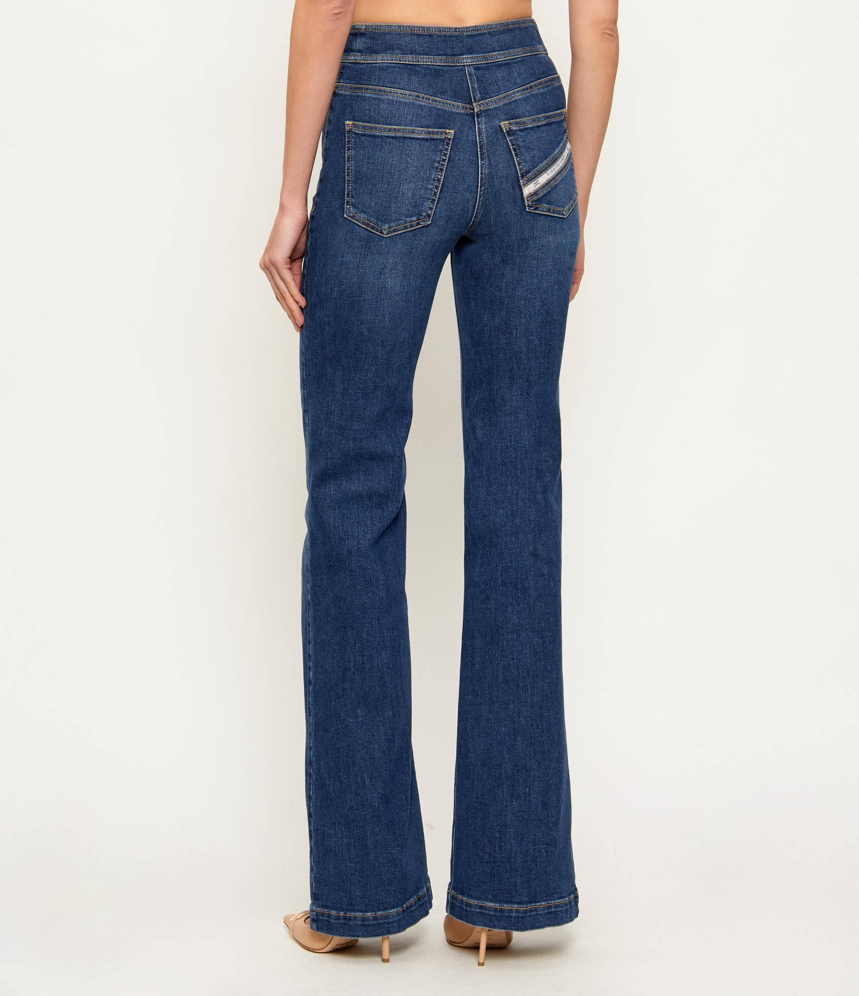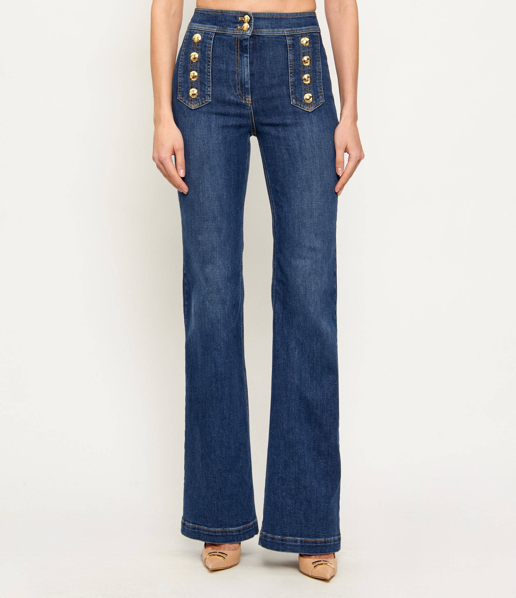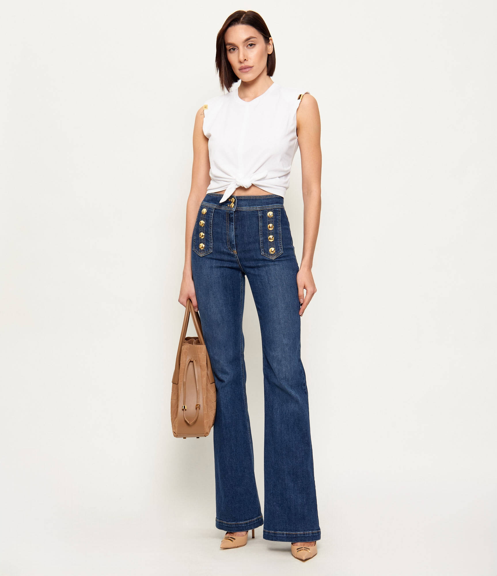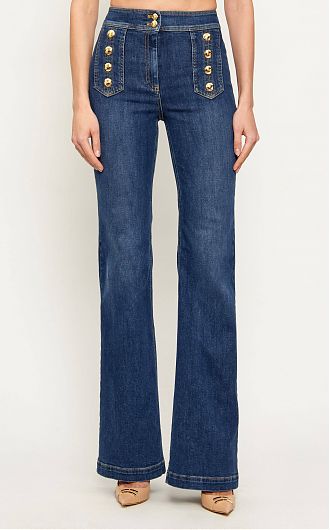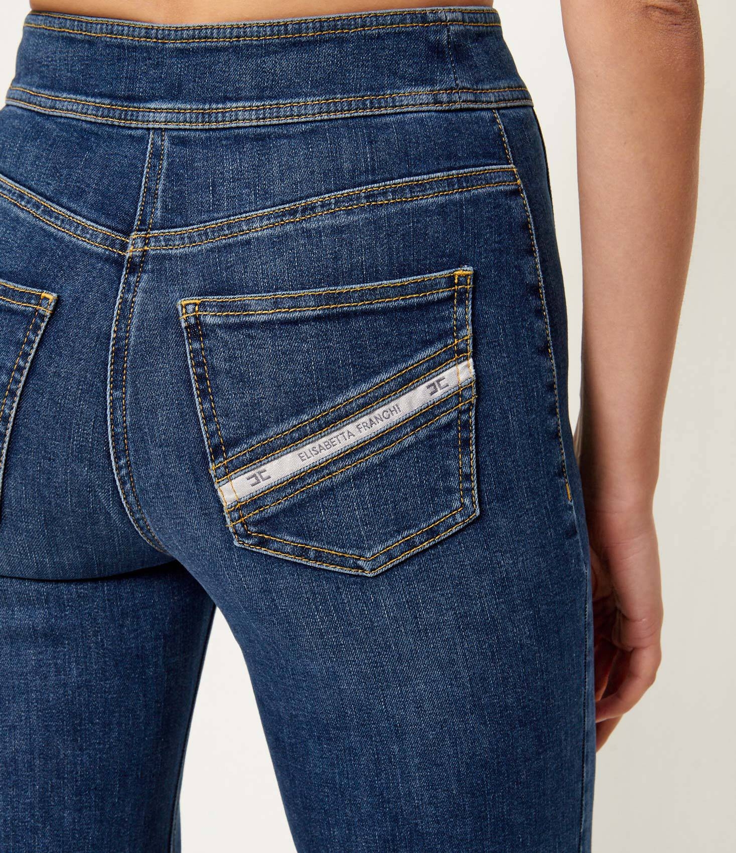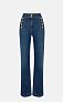 Джинсы с декоративными пуговицами из золотистого металла спереди. Сзади расположены накладные карманы, один из которых украшен диагональной лентой с логотипом. Стандартная посадка, нового сезона Элизабетта Франчи весна-лето 2026