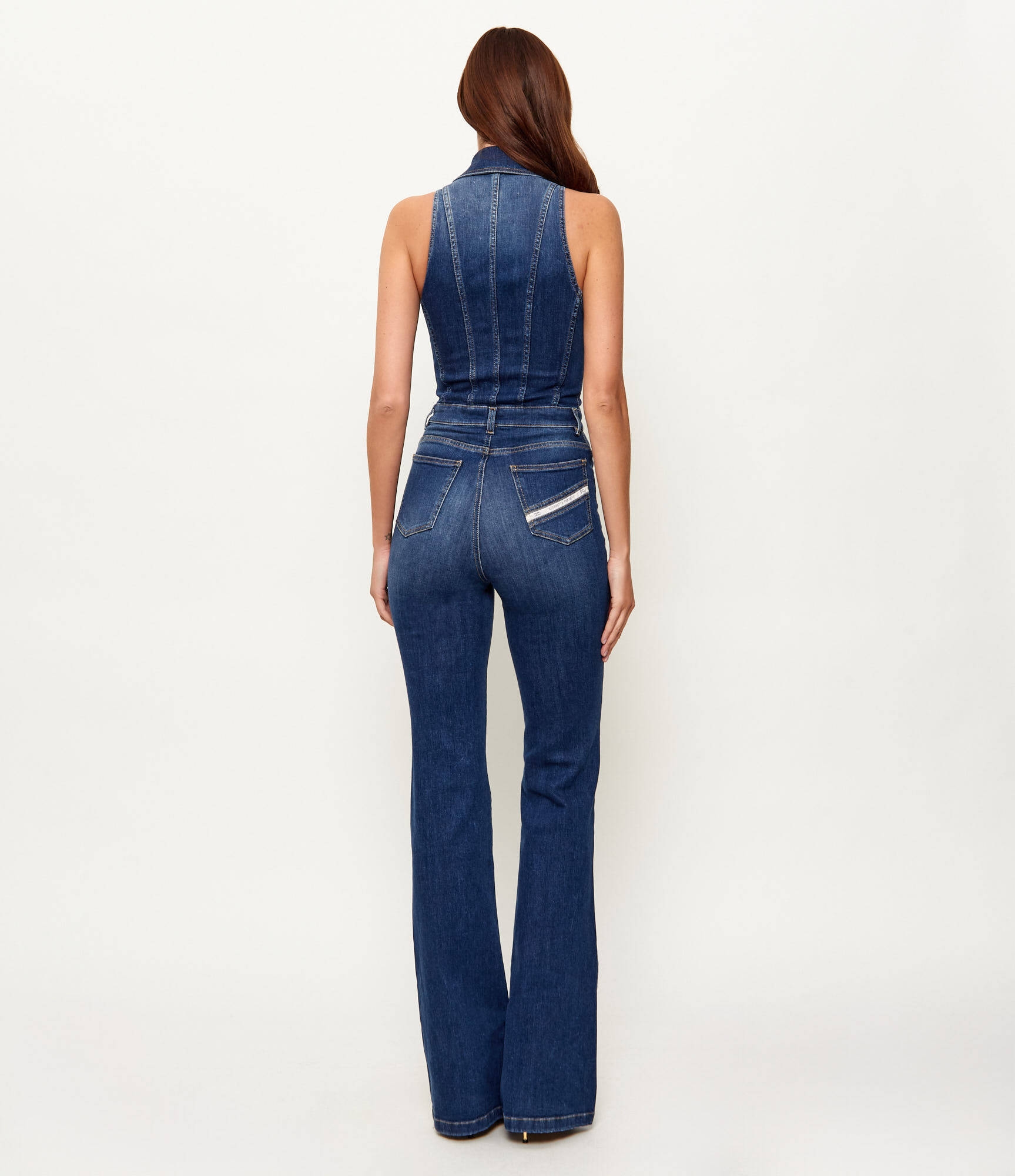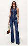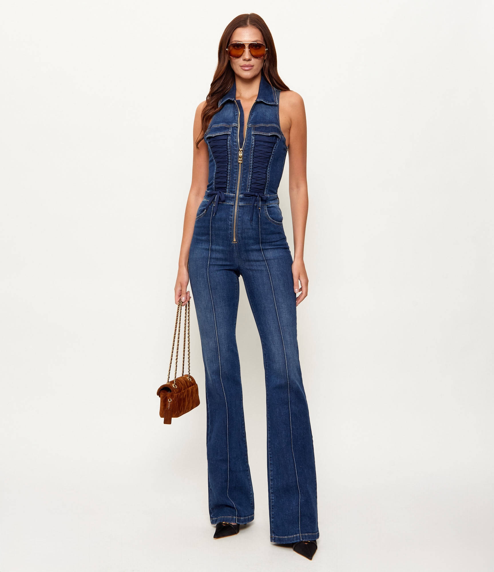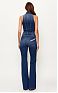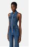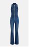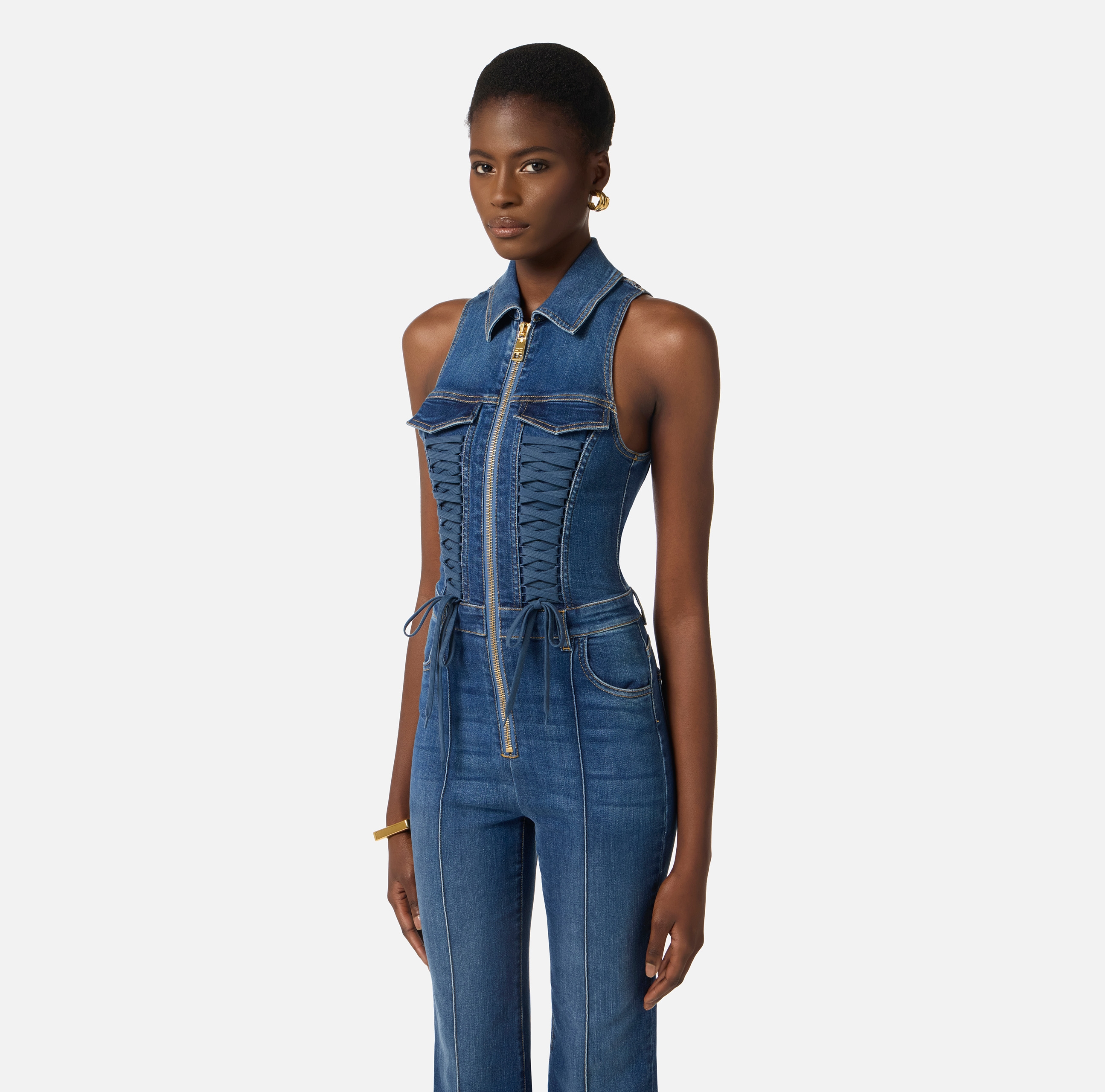 Комбинезон из денима с рубашечным воротником, без рукавов. Модель с высокой посадкой на талии и слегка расклёшенным книзу силуэтом. Шнуровка в корсетном стиле украшает комбинезон спереди, подчёркивая силуэт бюстье. Блестящую нотку добавляет застёжка-молния из золотистого металла. Сзади расположены карманы, один из которых украшен диагональной лентой с логотипом, нового сезона Элизабетта Франчи весна-лето 2026.