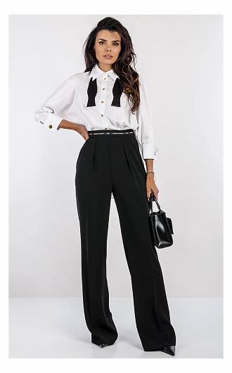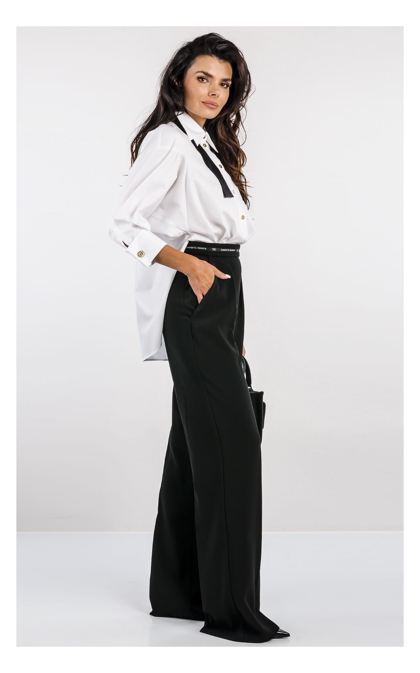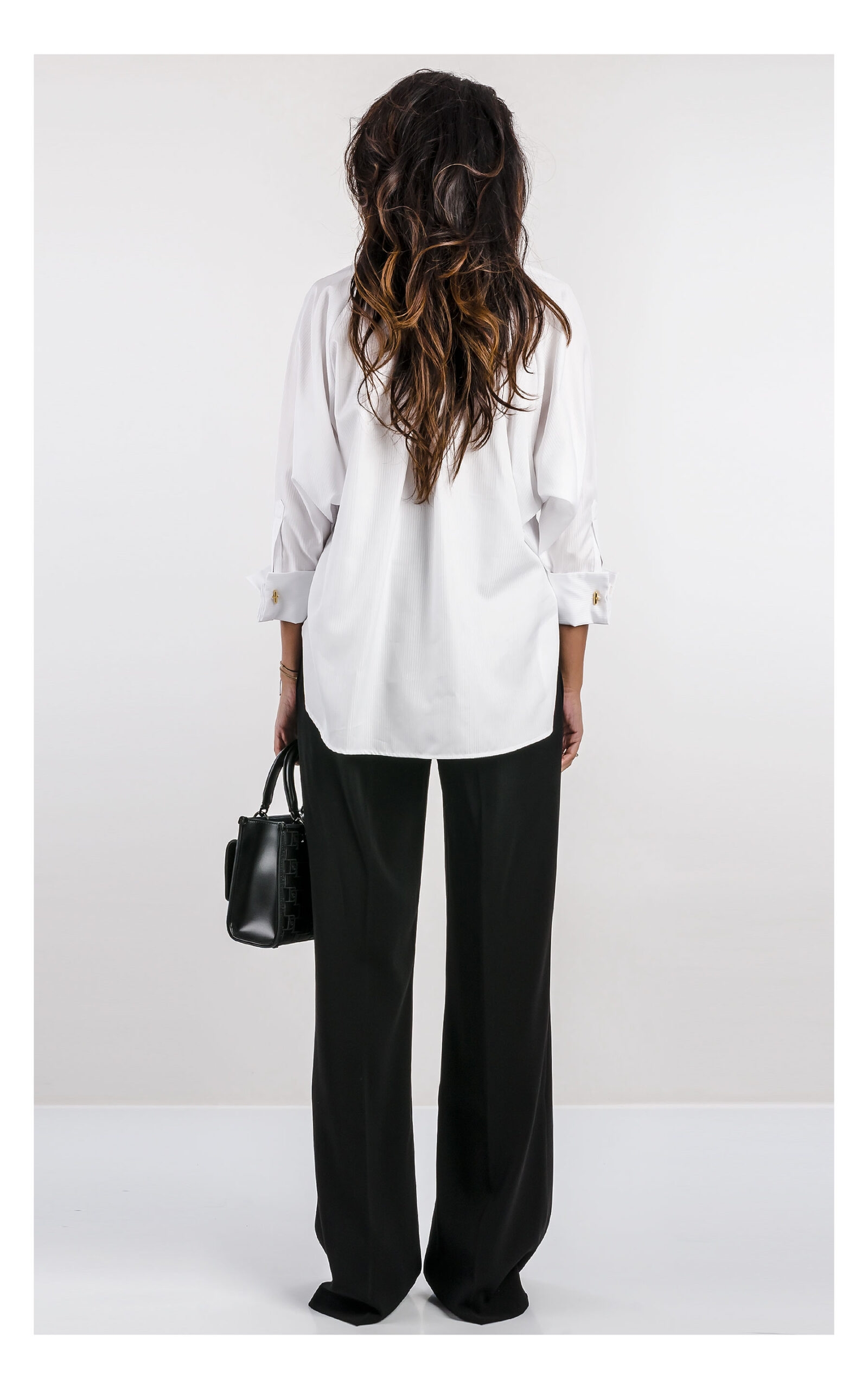 Комбинезон представлен рубашкой из хлопкового поплина в полоску в тон и брючинами из лёгкого крепа. Верх оформлен двойным воротником с развязанной бабочкой и удлинённой спинкой, выглядывающей из брючин. Лента с логотипом подчёркивает линию талии, а пуговицы из золотистого металла добавляют в изделие блестящую нотку, нового сезона Элизабетта Франчи осень-зима 2025/26