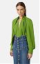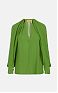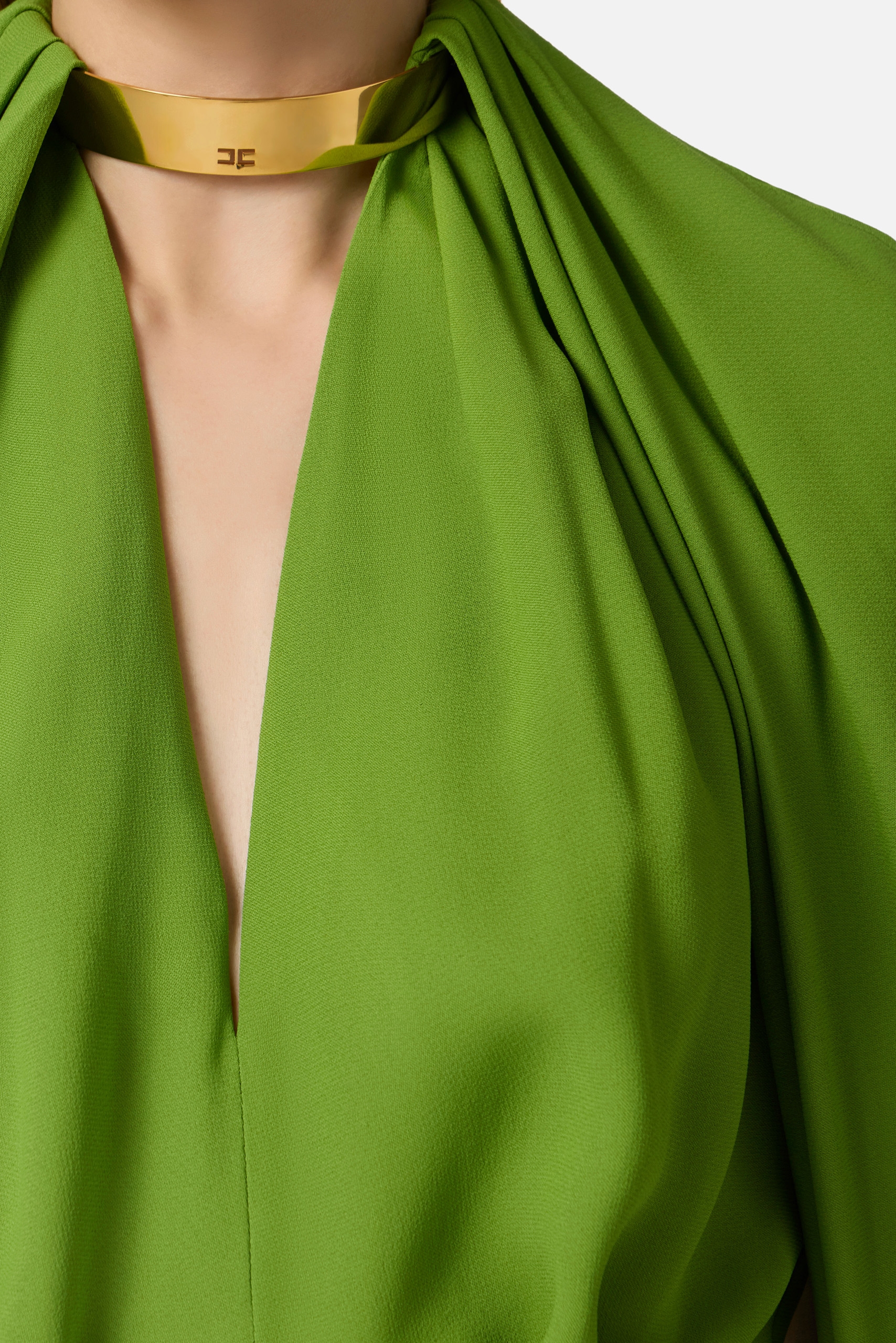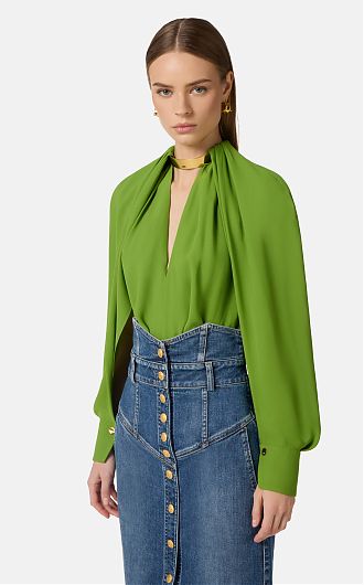 Блузка из вискозного жоржета. Модель характеризуется длинными рукавами с эффектом накидки и разрезом сбоку для изысканного силуэта. Дизайн завершают вставленный в горловину аксессуар из золотистого металла и асимметричные манжеты. Приталенный силуэт, нового сезона Элизабетта Франчи весна-лето 2026