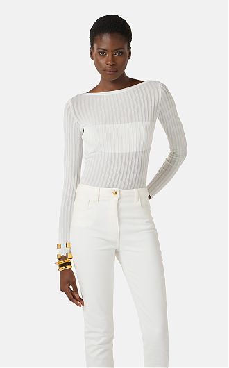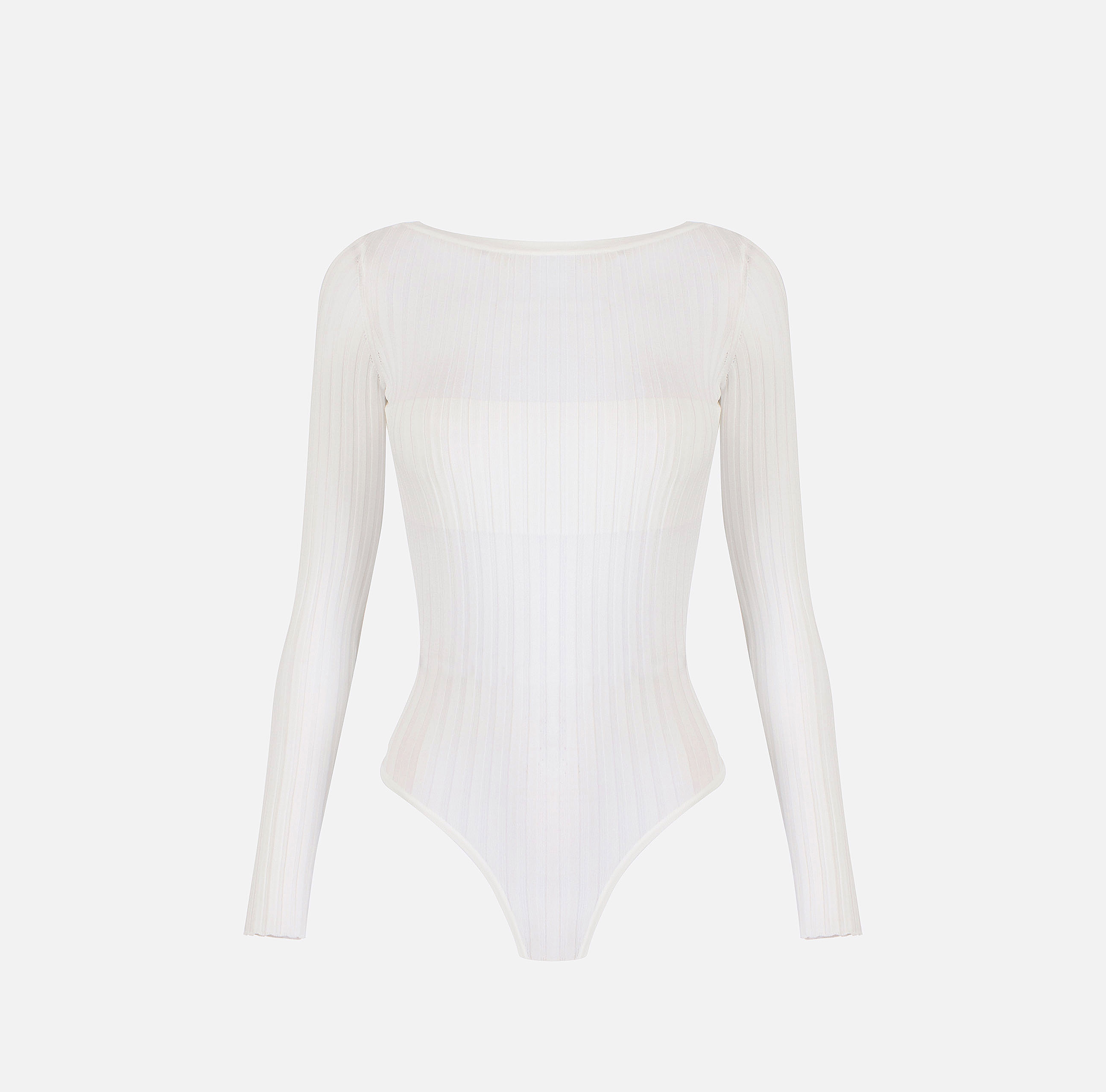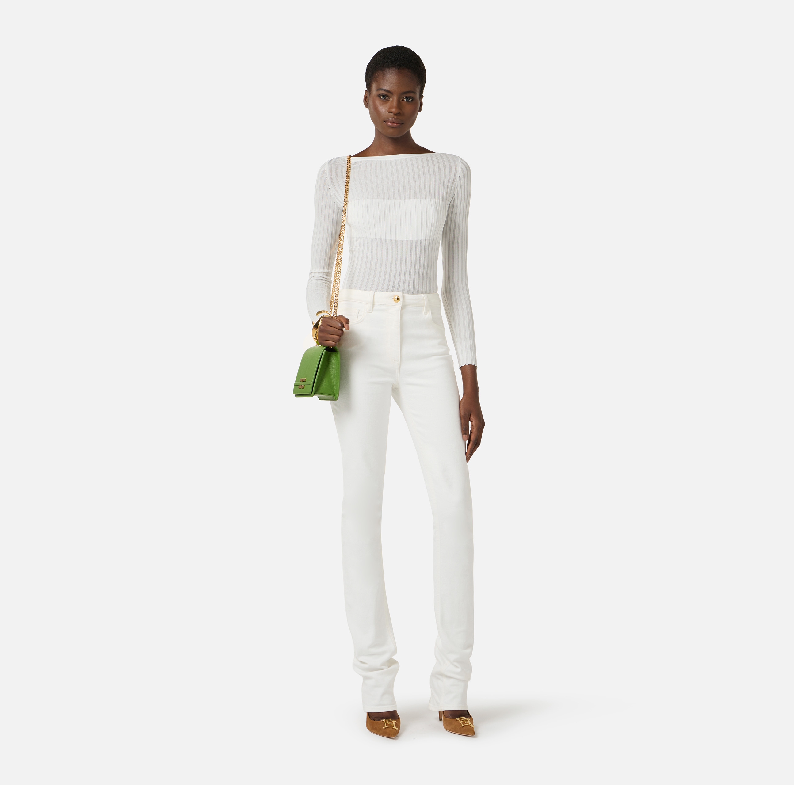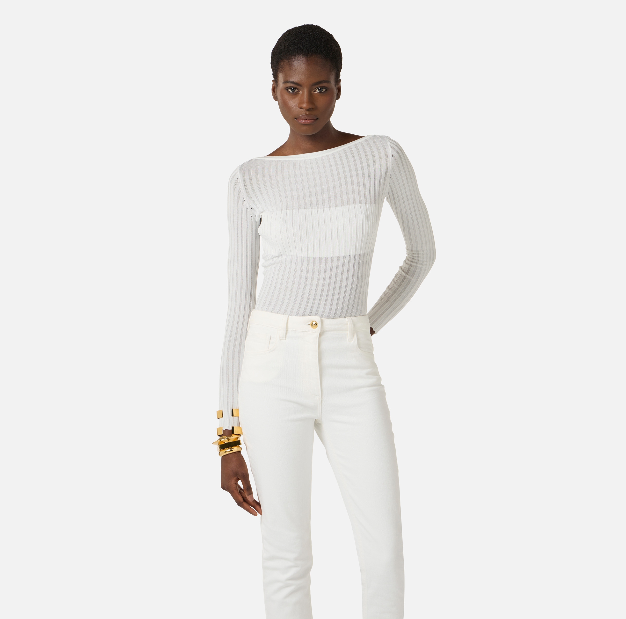 Боди из трикотажа с вырезом «лодочка» и длинными рукавами. Модель в резинку отличается оригинальной отделкой. Расположенный сзади вырез украшен пуговицами из золотистого металла с логотипом, нового сезона Элизабетта Франчи весна-лето 2026