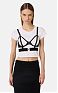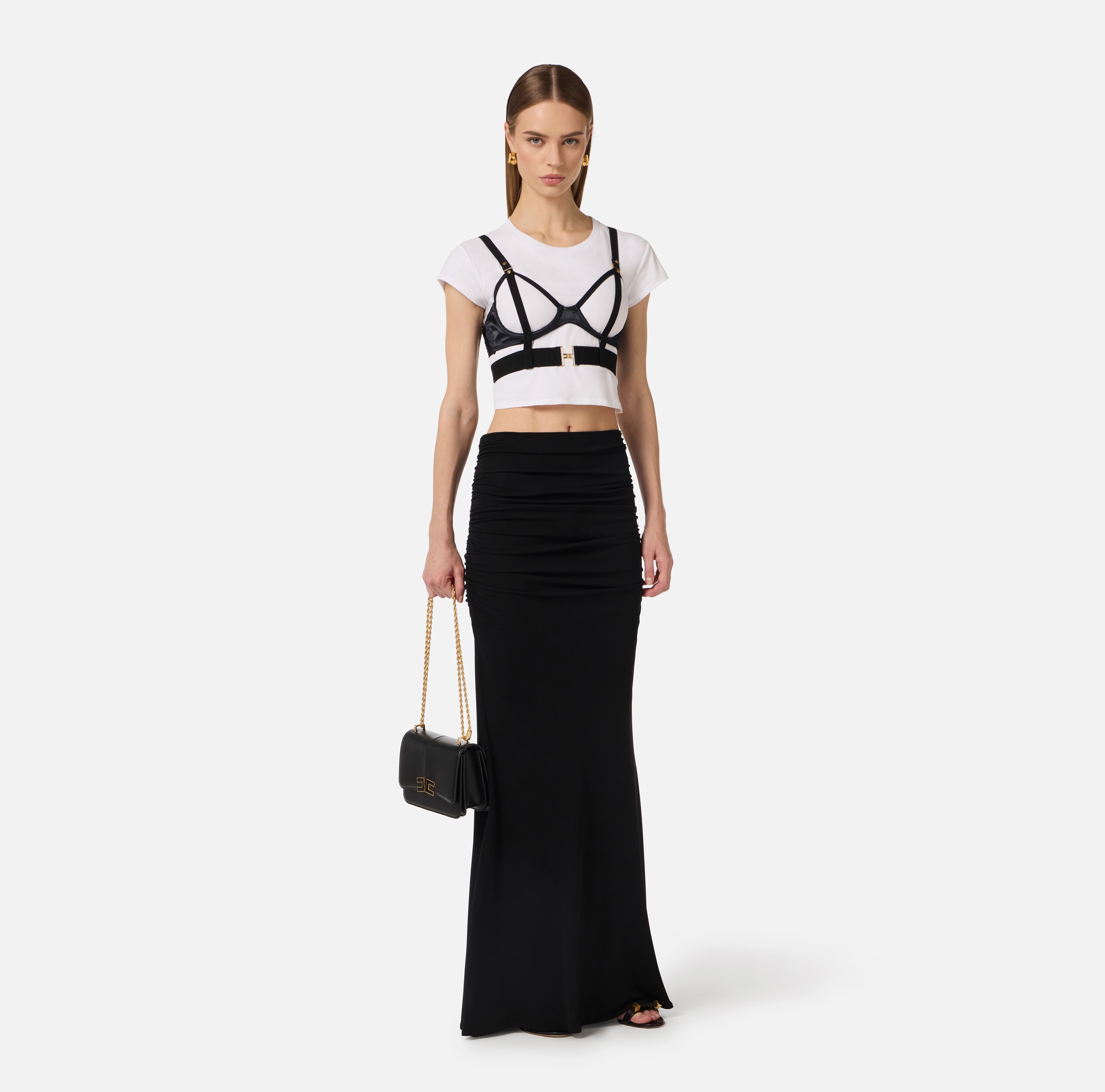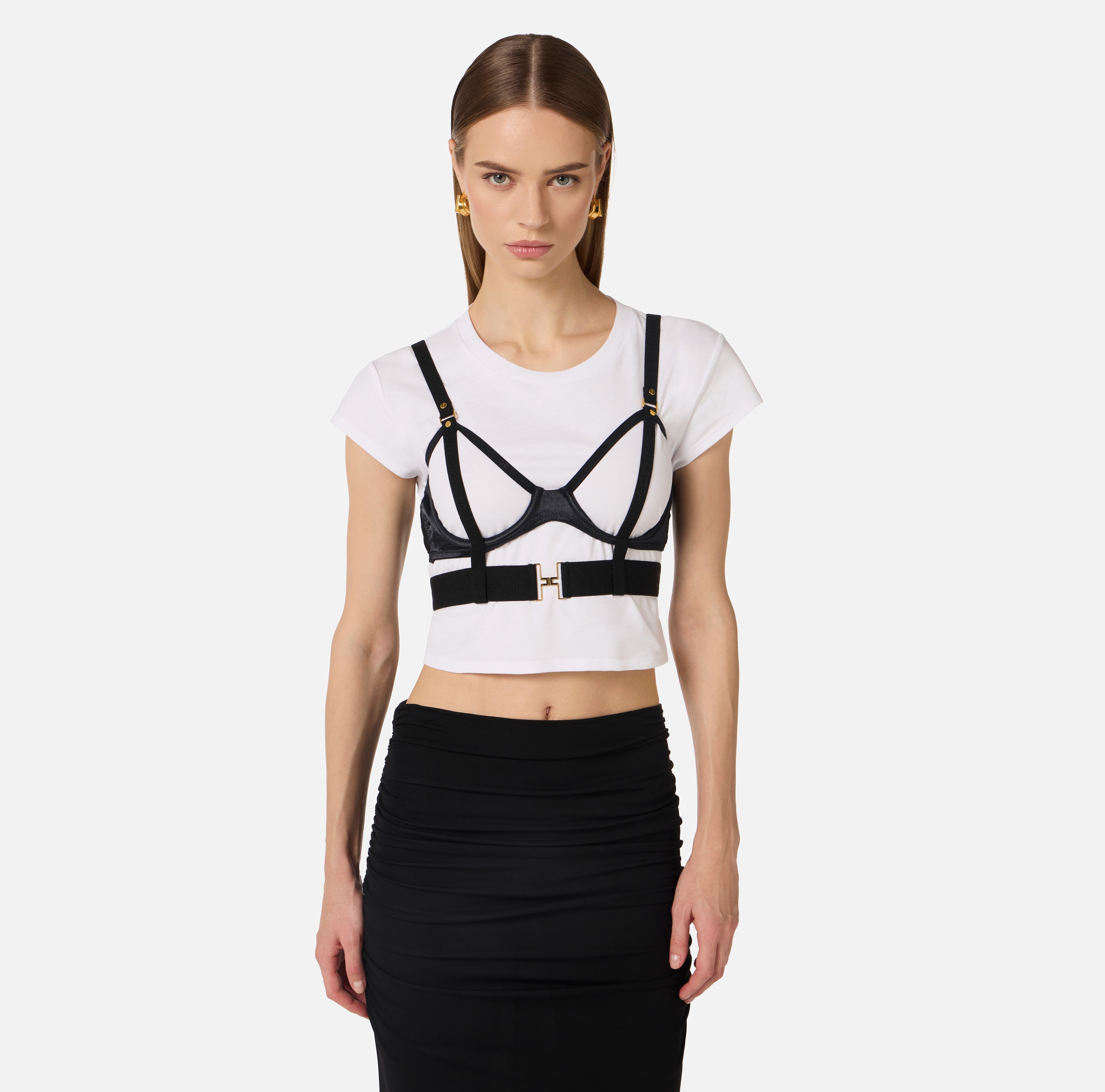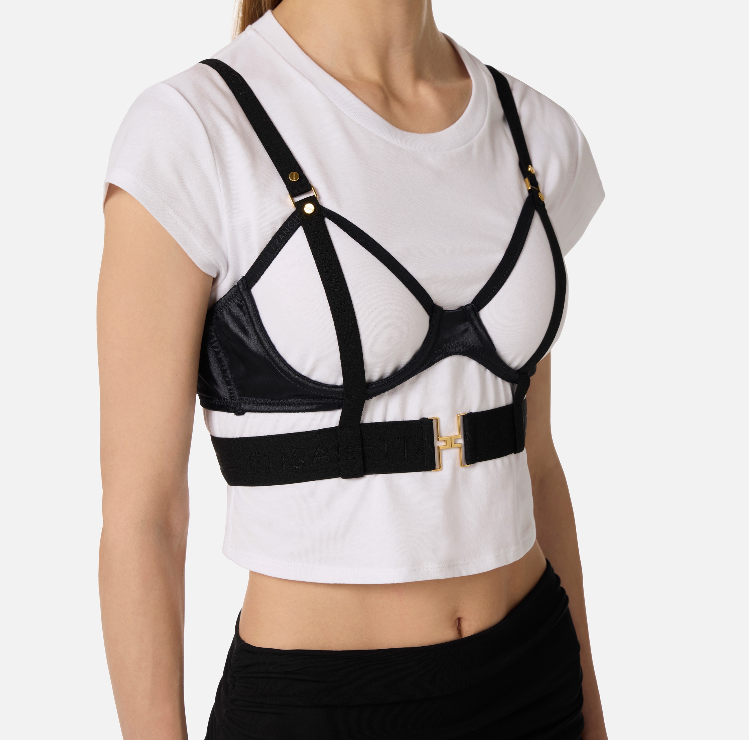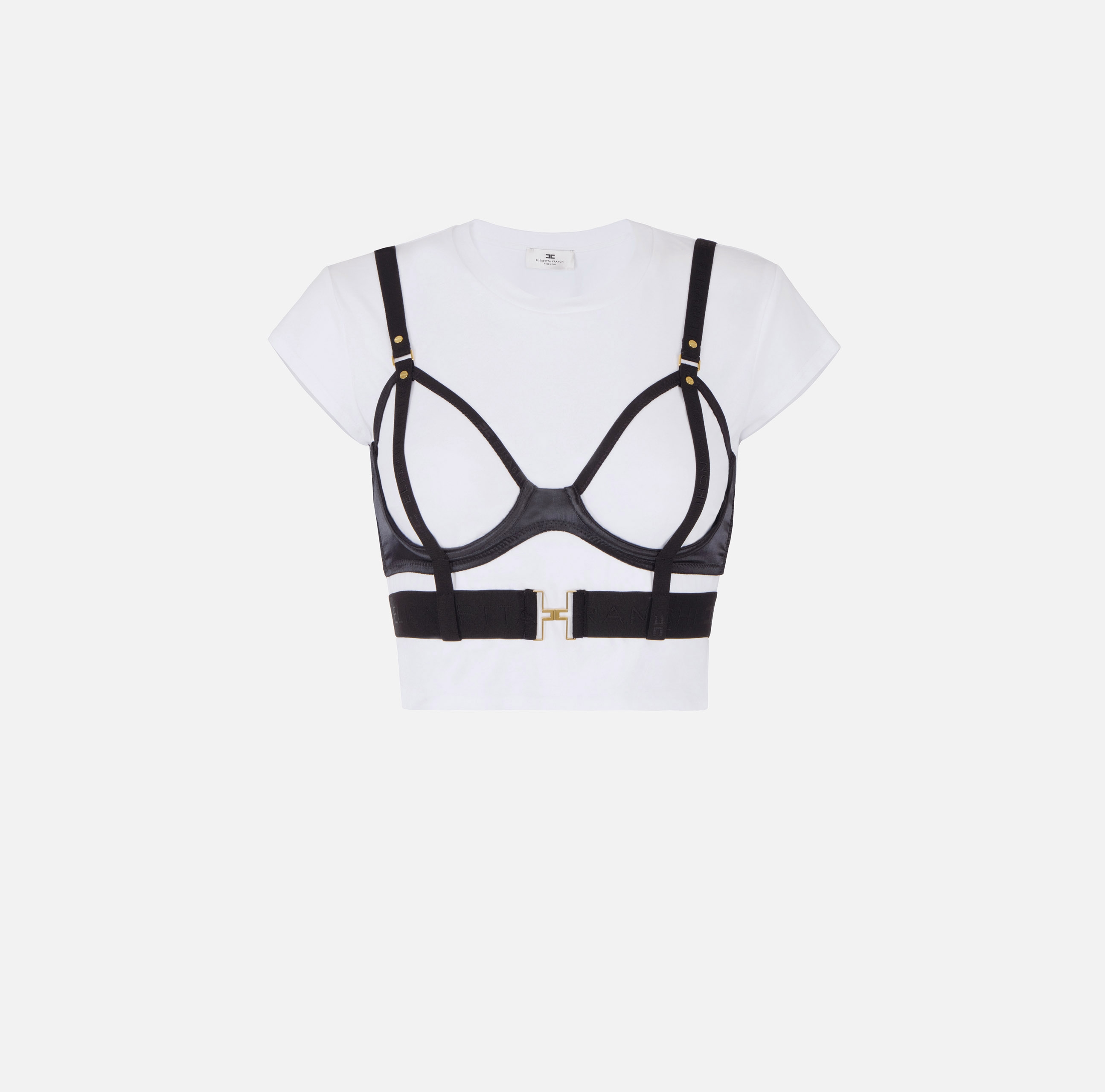 Футболка с короткими рукавами и круглой горловиной. Изюминку в изделие вносит лиф-бюстгальтер из атласа и тюля с ремешком и без чашек. Облегающий силуэт, нового сезона Элизабетта Франчи весна-лето 2026.