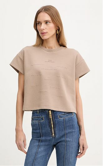 Футболка с короткими рукавами-крылышками и круглой горловиной. Спереди модель украшена прорезиненным рельефным принтом в виде логотипа и надписи в тон с эффектом 3D для придания фактурности деталям. Классический силуэт, нового сезона Элизабетта Франчи весна-лето 2026