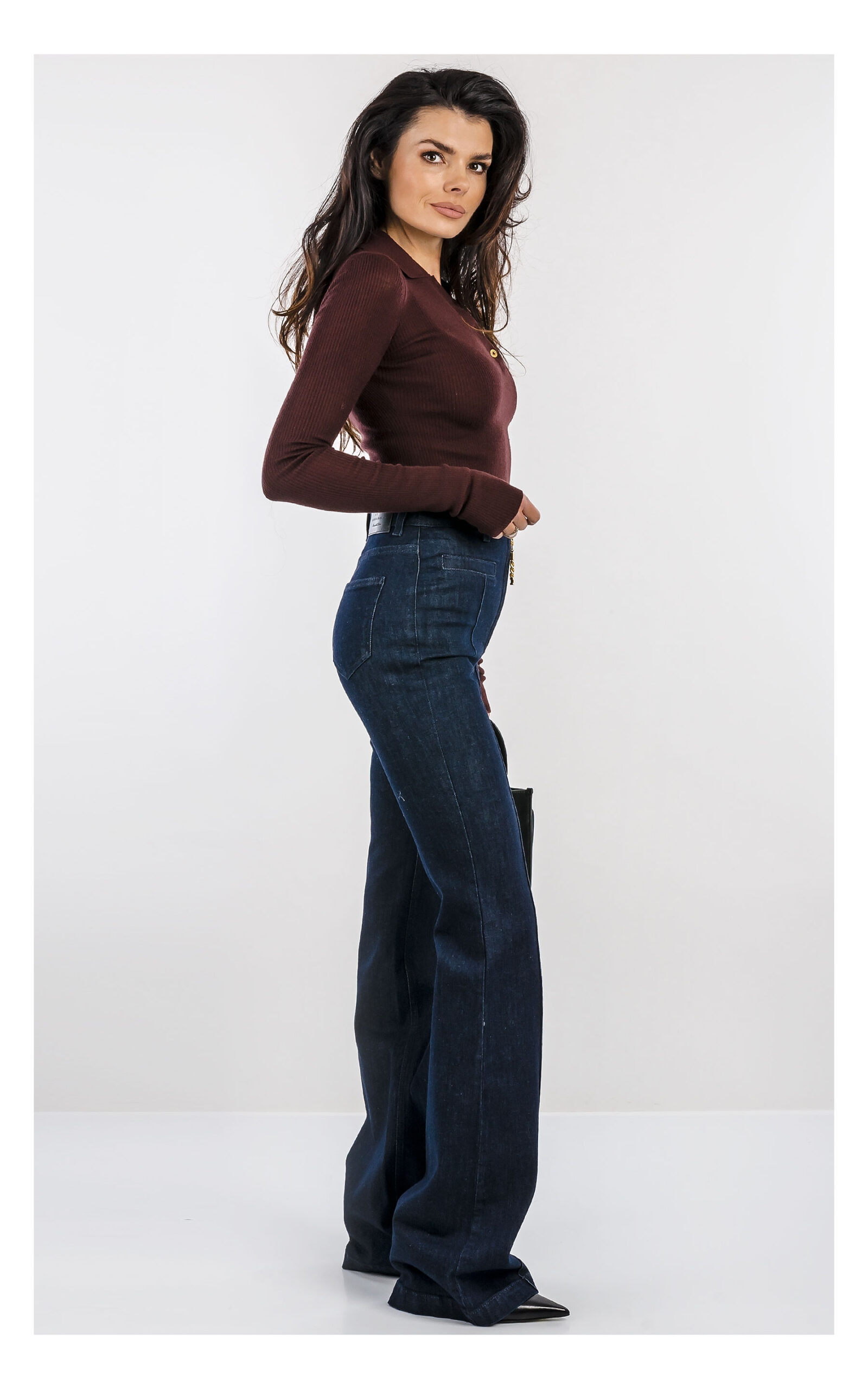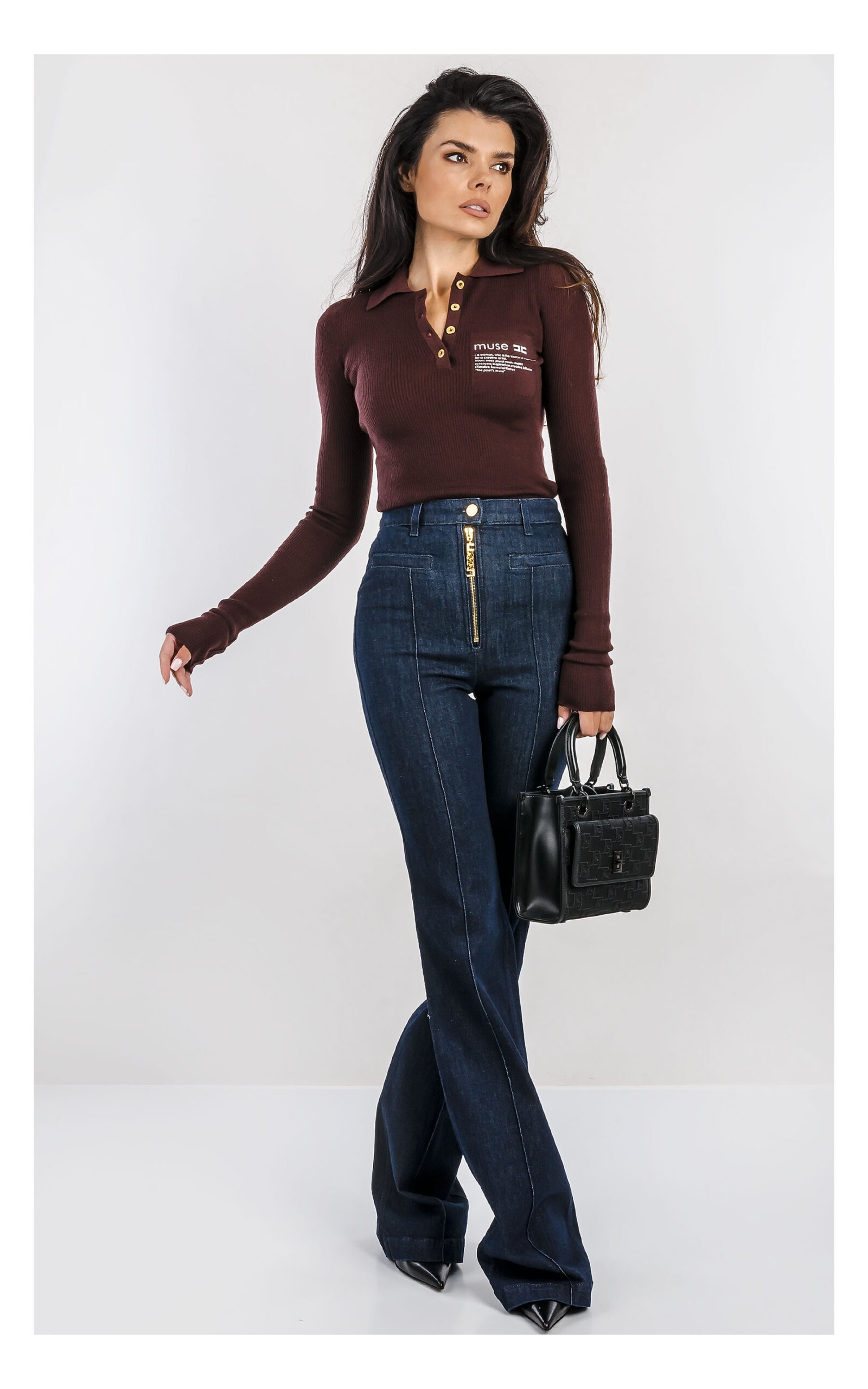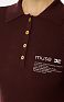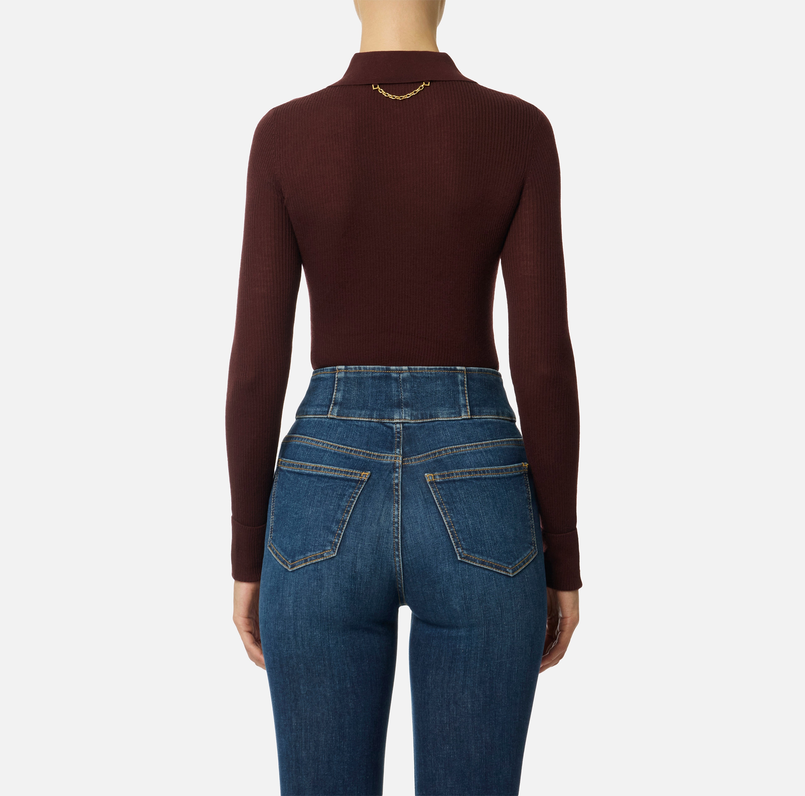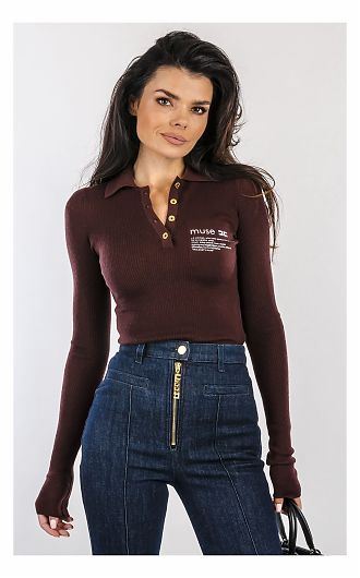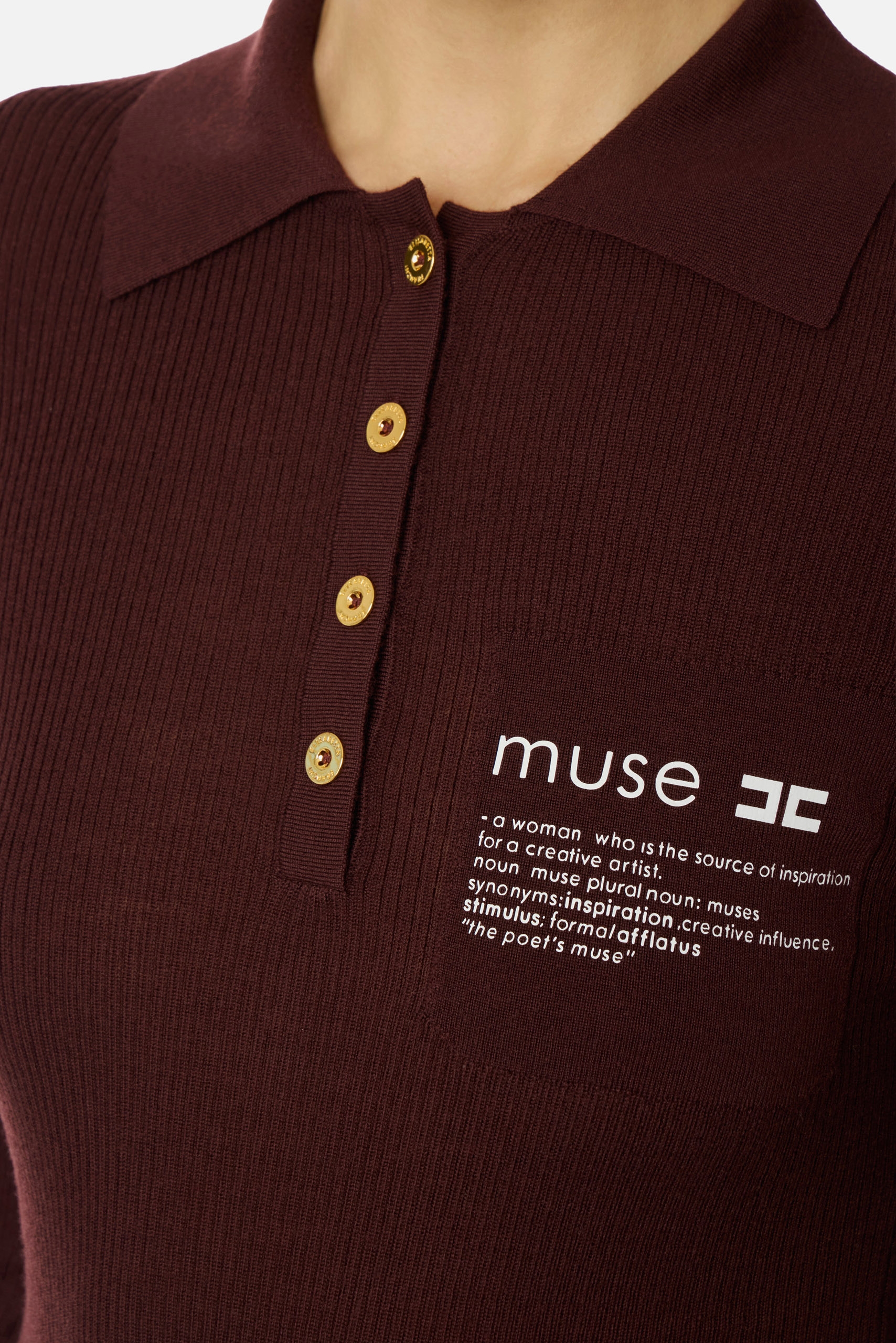 Облегающий джемпер поло из трикотажа. Модель с воротником поло и длинными рукавами с отворотами выполнена в резинку для придания динамичности текстуре. Спереди изделие украшено принтом в виде мотивирующей надписи, а сзади на воротнике — роскошным декором в виде цепочки, нового сезона Элизабетта Франчи осень-зима 2025/26