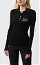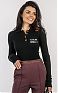 Облегающий джемпер поло из трикотажа. Модель с воротником поло и длинными рукавами с отворотами выполнена в резинку для придания динамичности текстуре. Спереди изделие украшено принтом в виде мотивирующей надписи, а сзади на воротнике — роскошным декором в виде цепочки, нового сезона Элизабетта Франчи осень-зима 2025/26