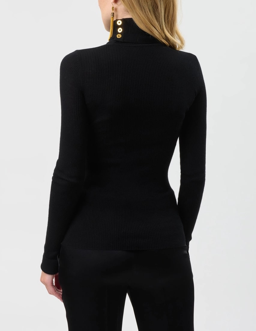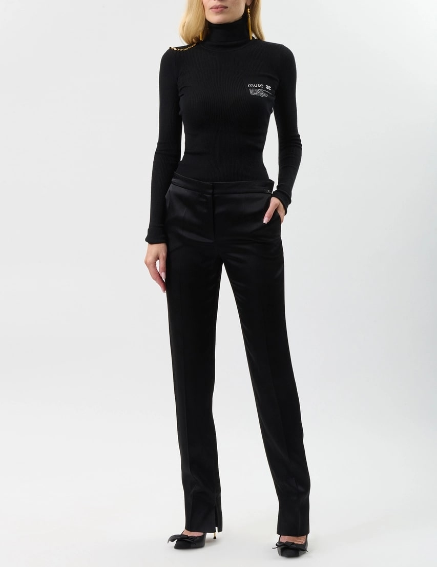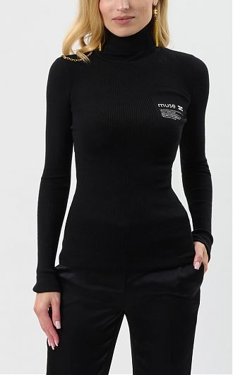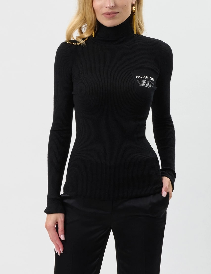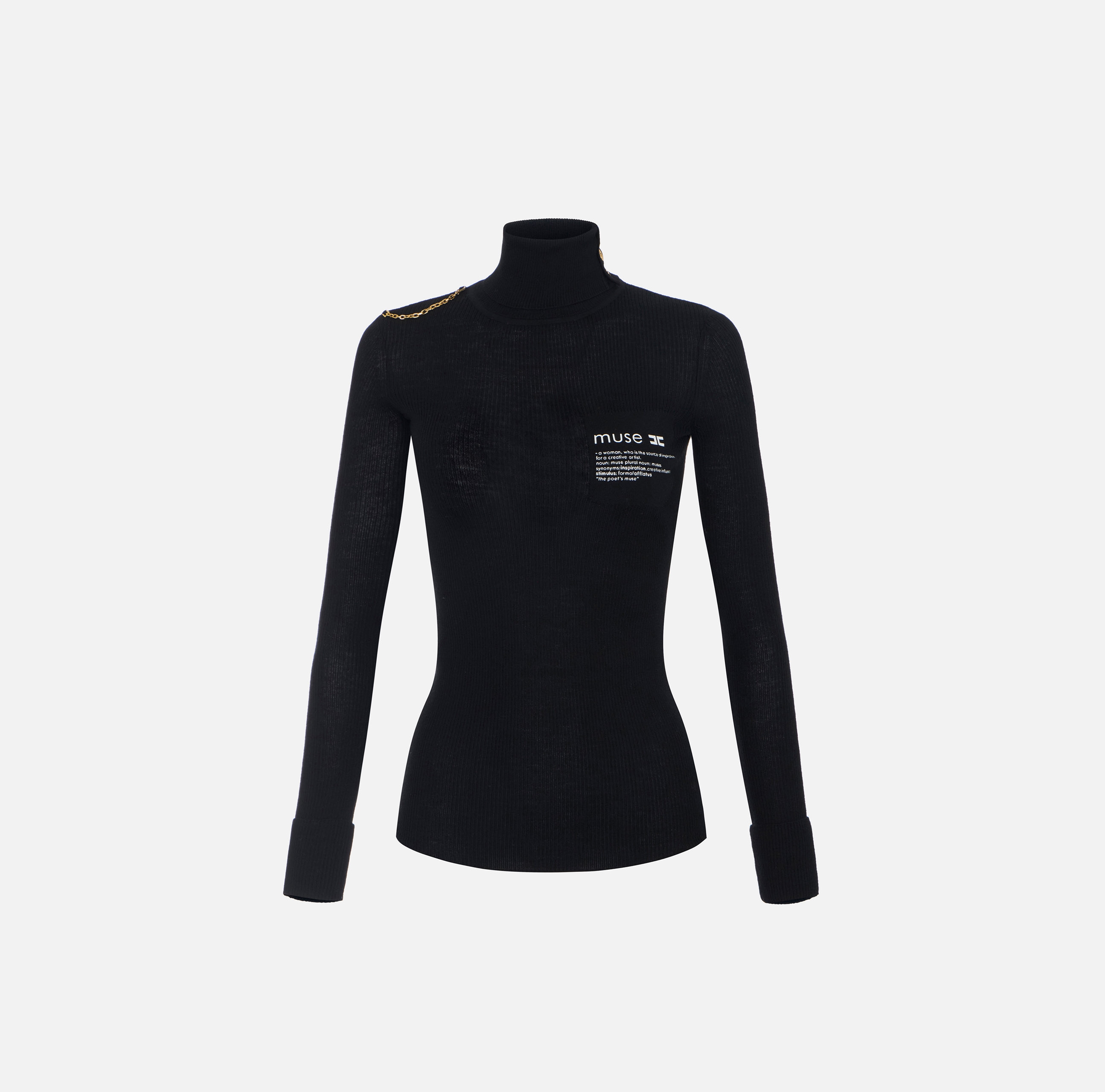 Облегающая водолазка из трикотажа. Идеальный вариант одежды для ношения под пиджаком. Модель оформлена воротником гольф с застёжкой сбоку, пуговицами из золотистого металла и длинными рукавами с отворотами внизу. Изделие украшено принтом в виде мотивирующей надписи спереди и блестящим декором в виде цепочки на плече, нового сезона Элизабетта Франчи осень-зима 2025/26
