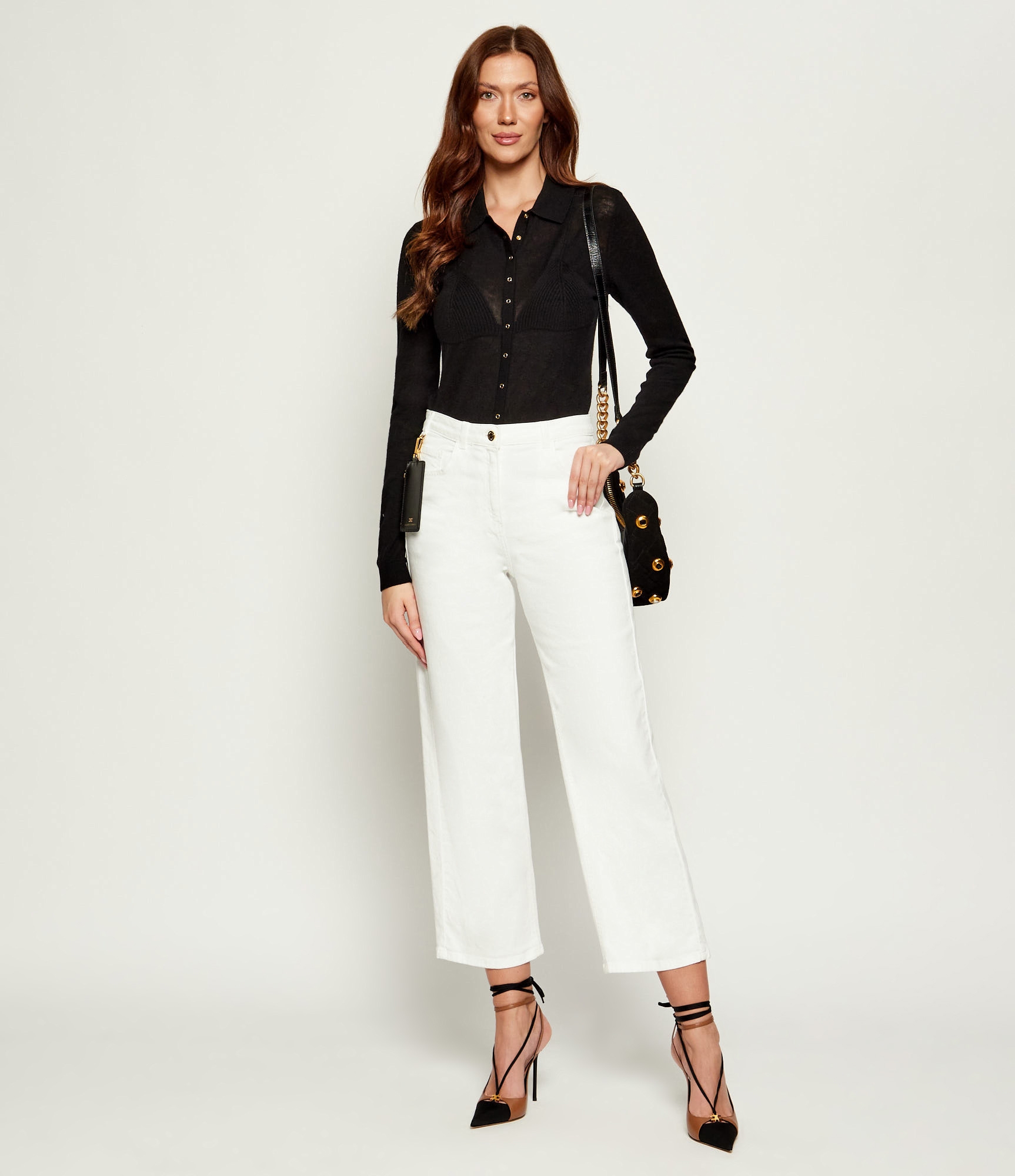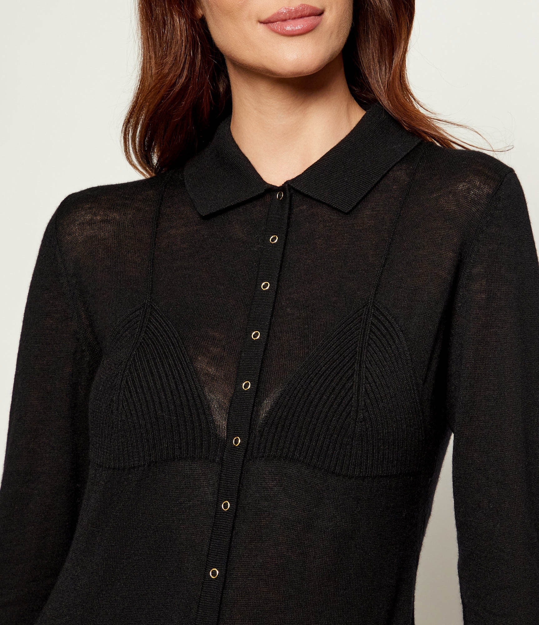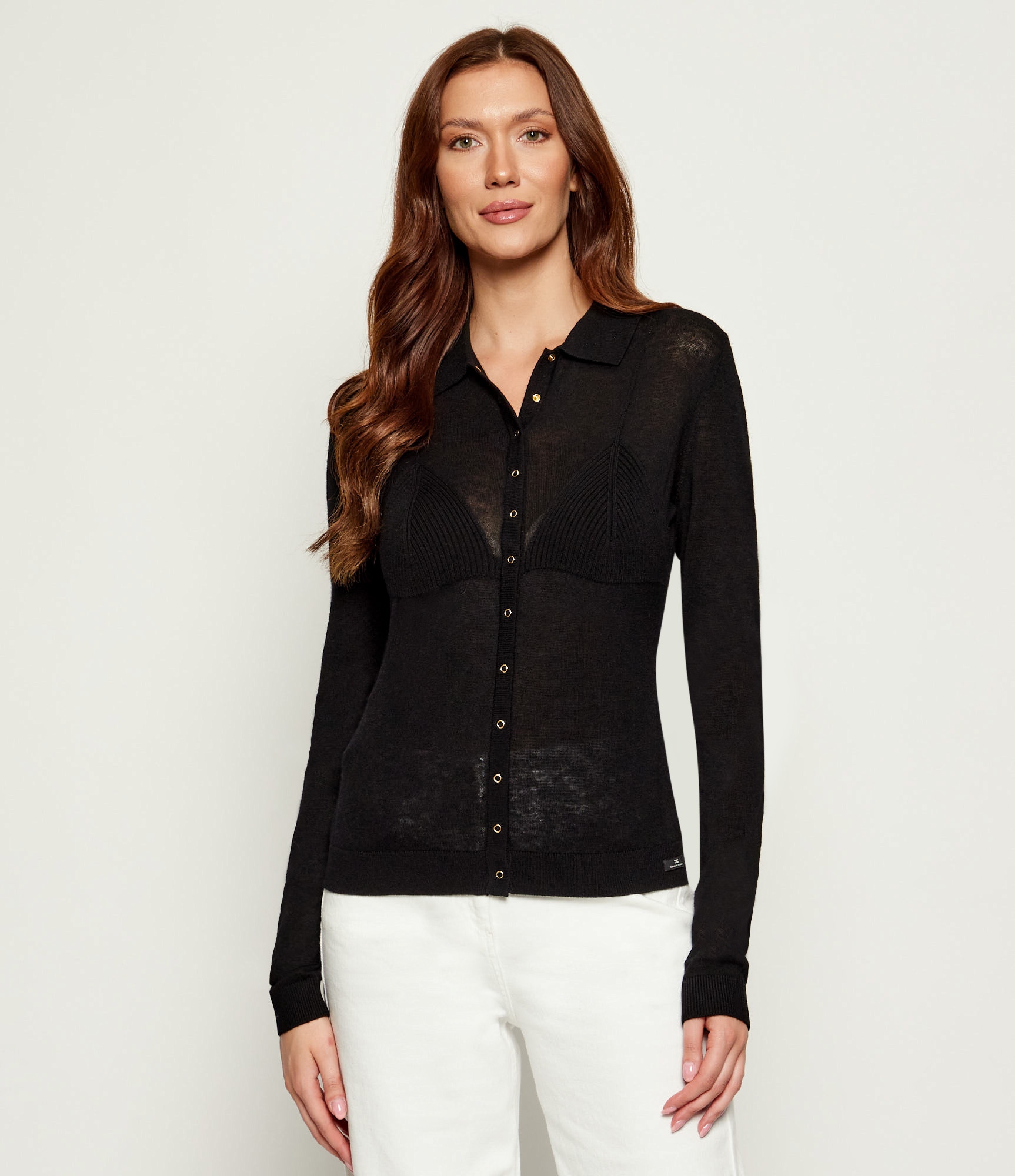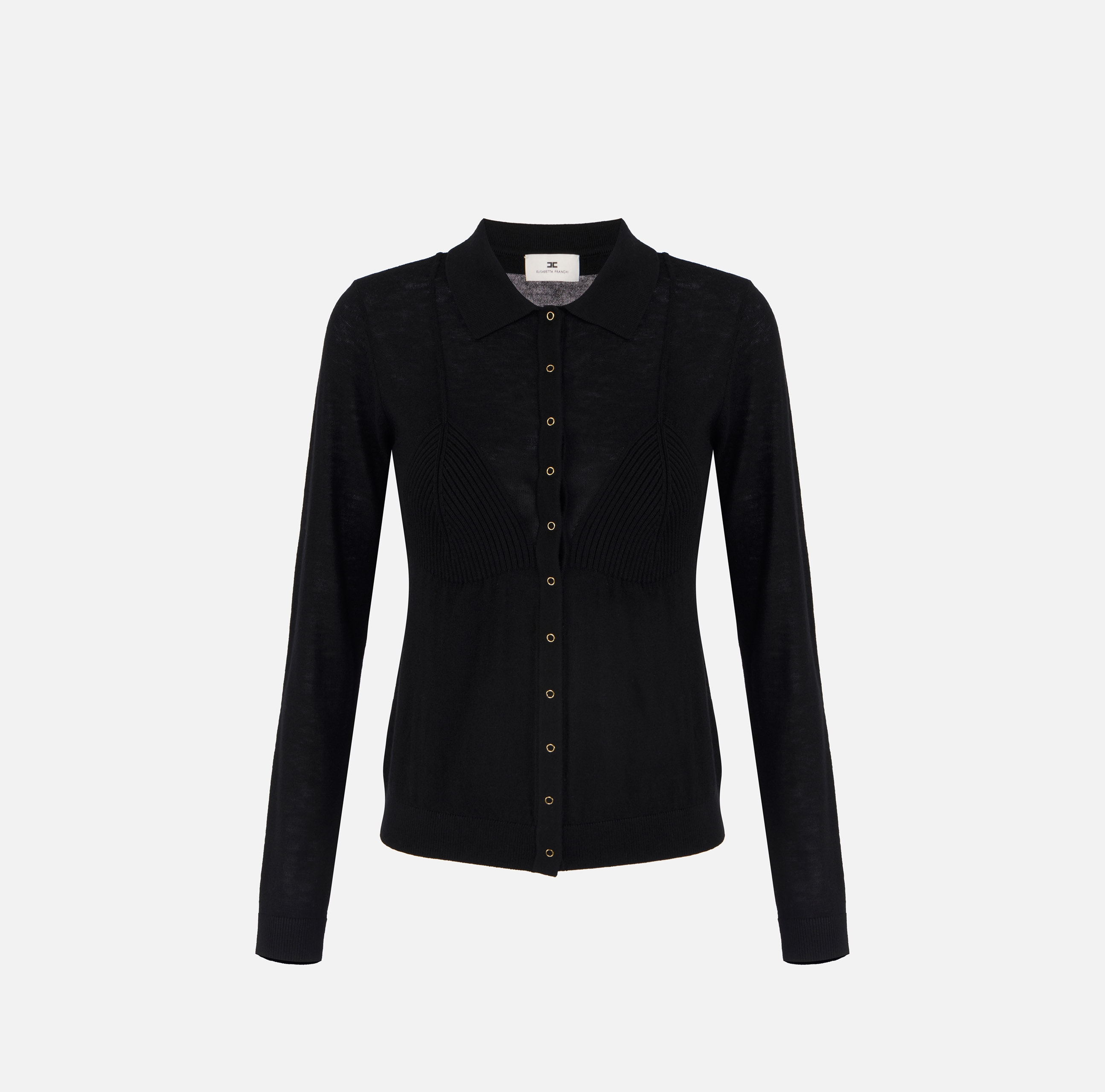 Кофта-кардиган с силуэтом бюстгальтера на груди создаёт изысканный текстурный контраст, нового сезона Элизабетта Франчи осень-зима 2025/26