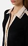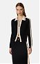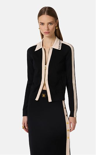 Трикотажный жакет с длинными рукавами. Изюминку в изделие вносят лампасы из глянцевой вискозы и жаккардовый логотип на воротнике. Контрастные цвета подчёркивают графичный дизайн. Блестящую нотку в изделие добавляет застёжка-молния из золотистого металла. Классический силуэт, нового сезона Элизабетта Франчи весна-лето 2026