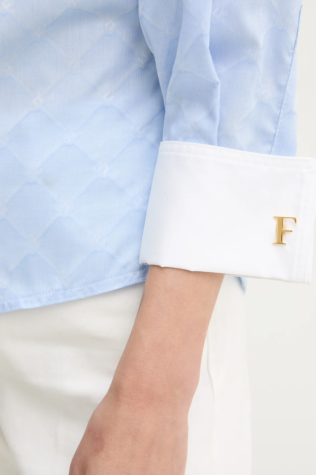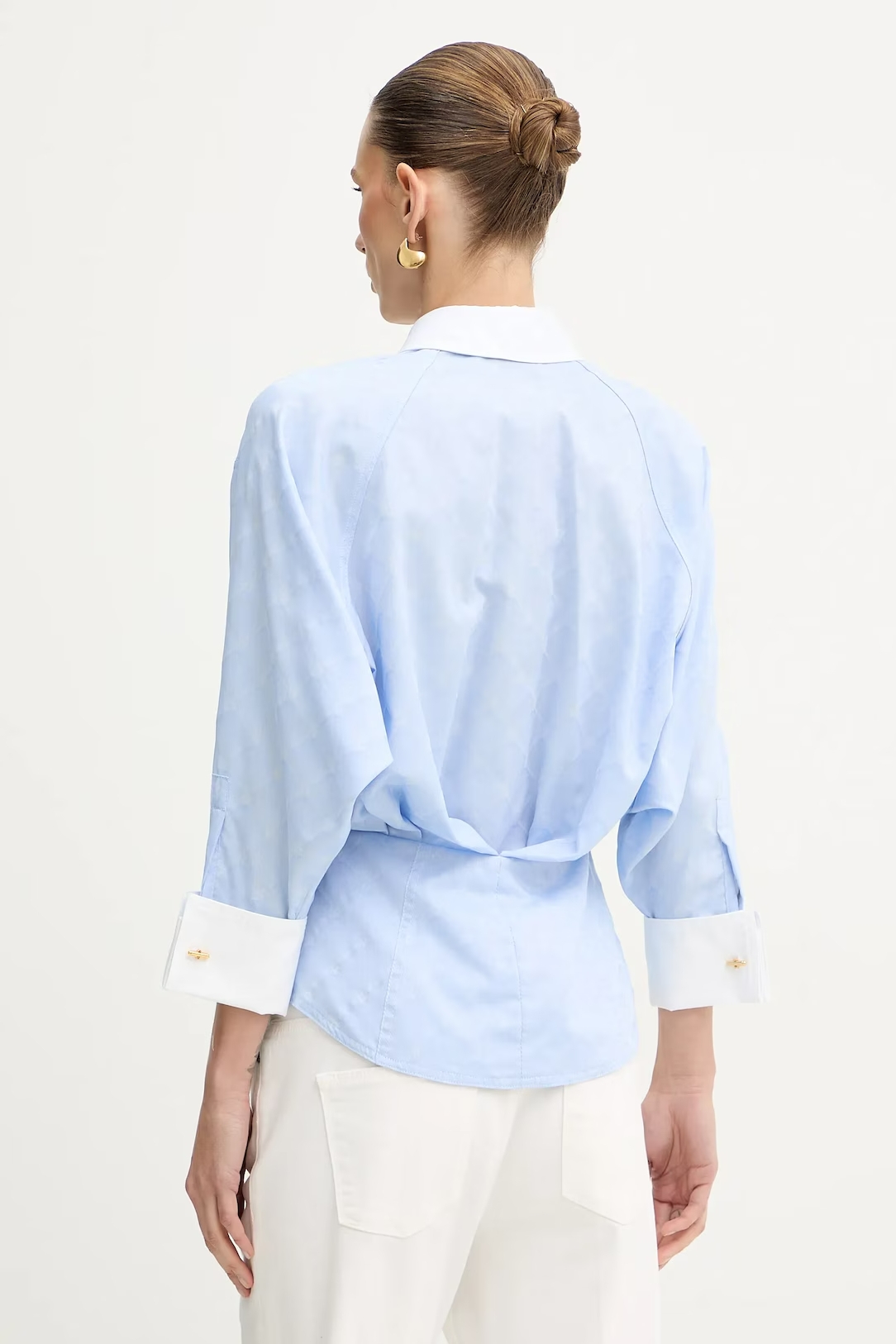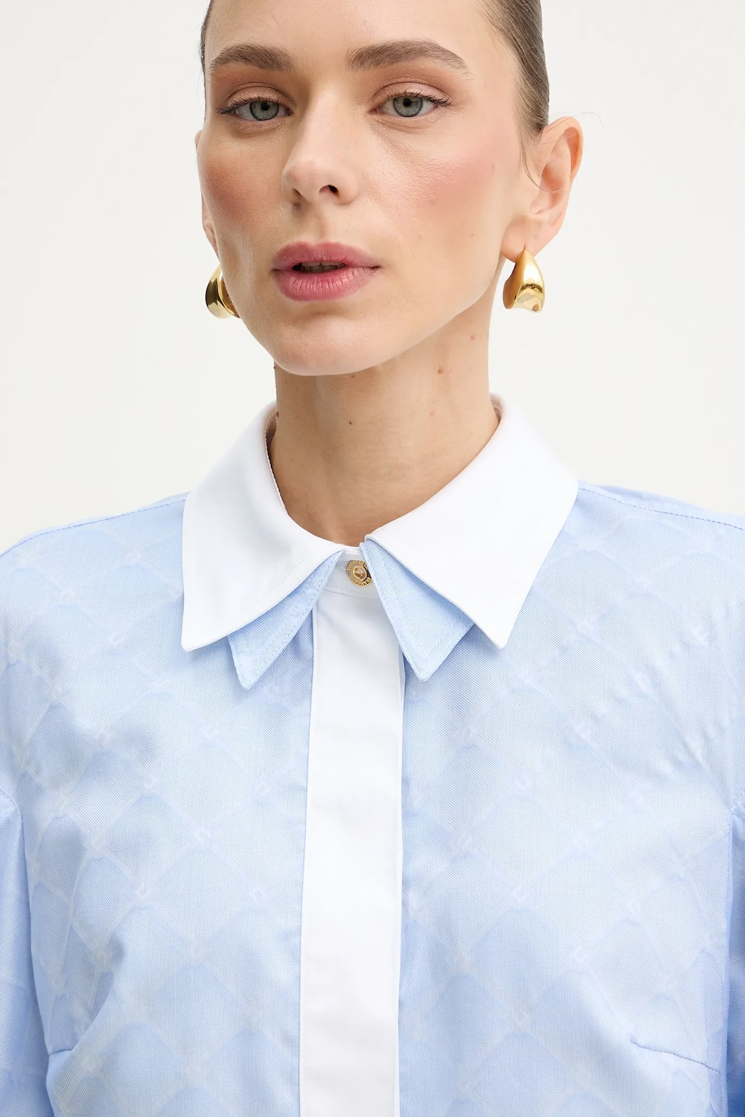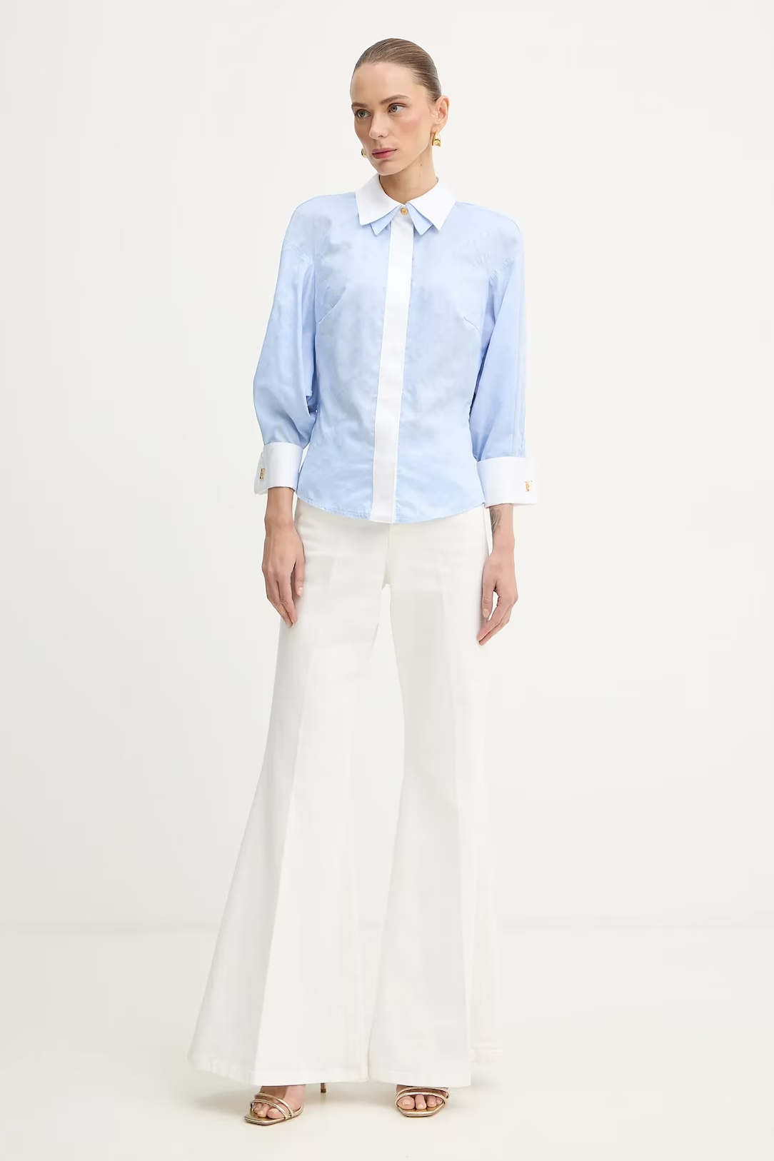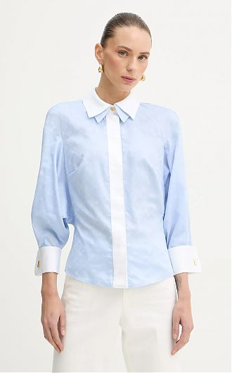 Приталенная рубашка из хлопка. Модель оформлена двойным воротником внахлёст и длинными пышными рукавами. Изюминку добавляет жаккардовый мотив в ромбы. Запонки на манжетах вносят в изделие блестящий штрих, нового сезона Элизабетта Франчи весна-лето 2026