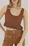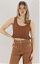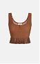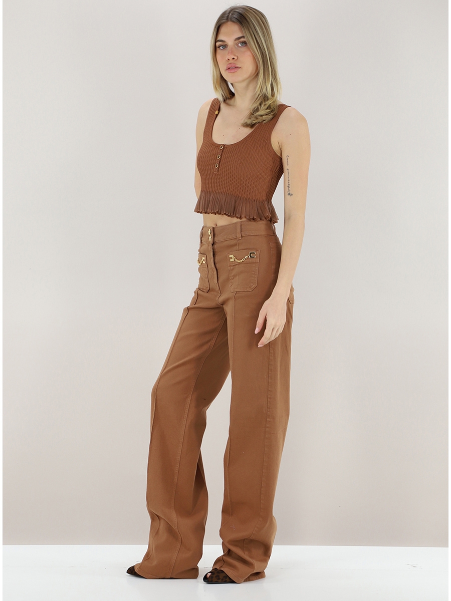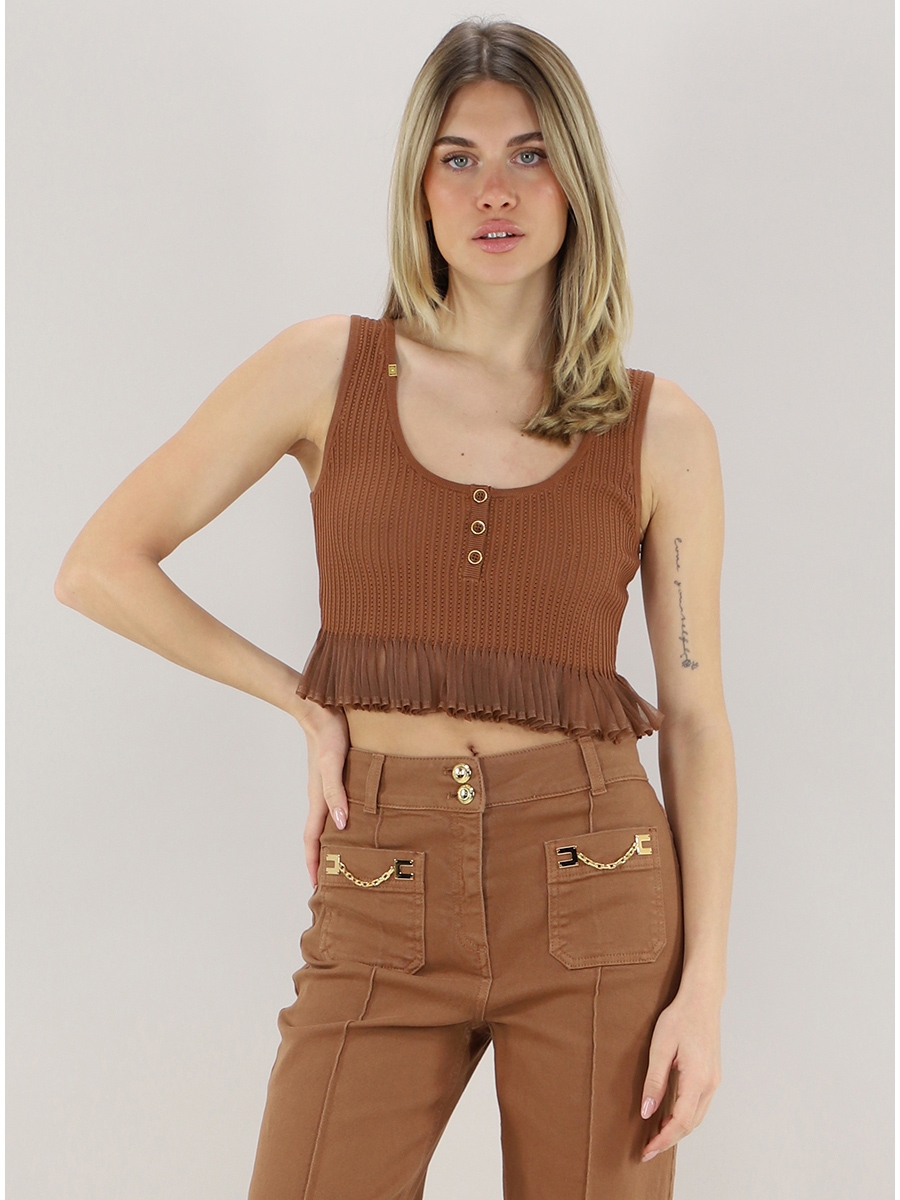 рикотажный топ с глубокой круглой горловиной на пуговицах, без рукавов. Сочетание резинки с ажурной вязкой и плиссированным эффектом внизу создаёт роскошный фактурный контраст и динамичный силуэт, нового сезона Элизабетта Франчи весна-лето 2026