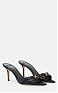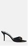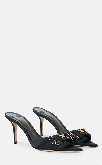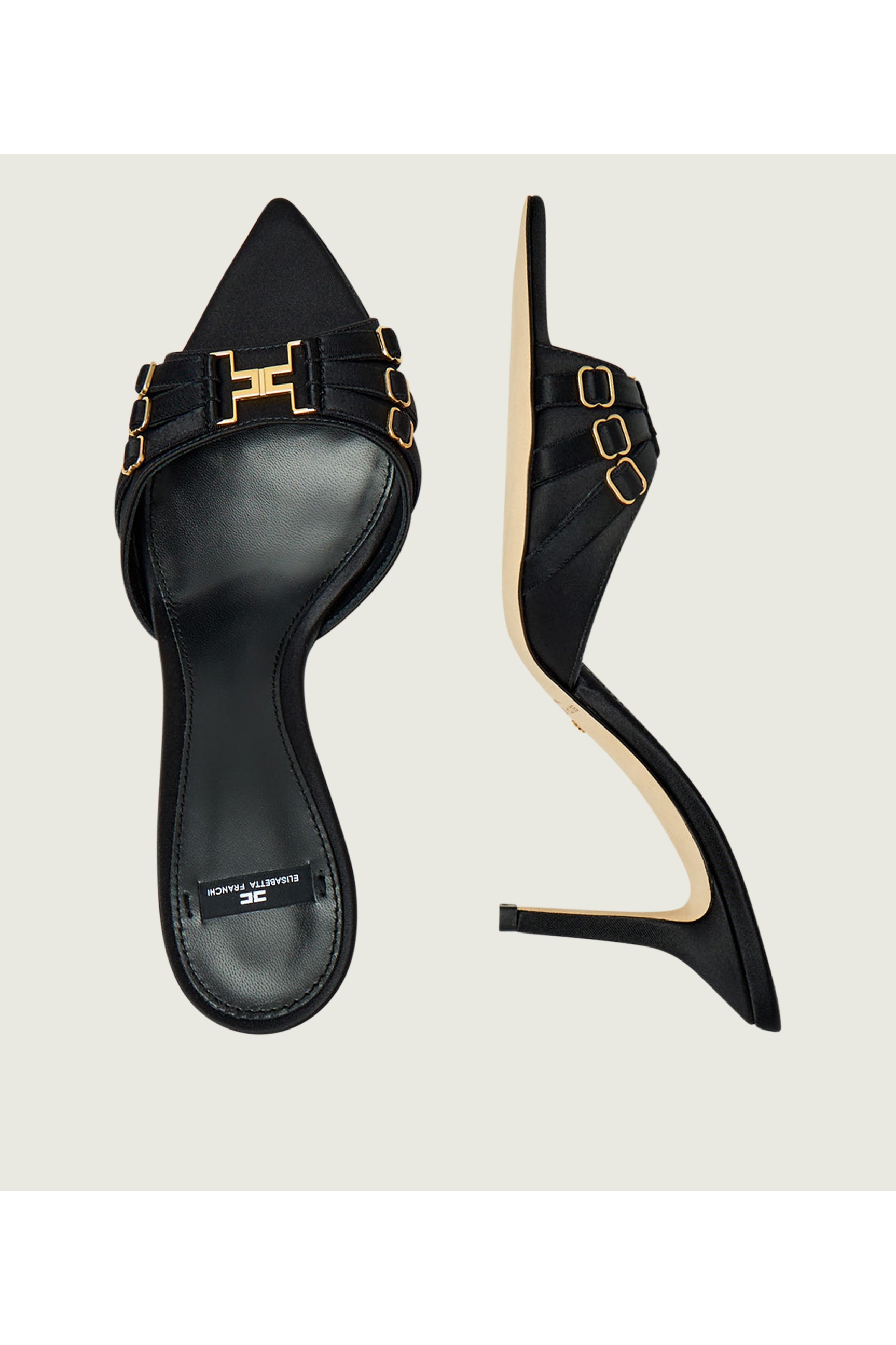 Кожаные мюли с обтянутым атласом верхом. Модель украшена ремешками в корсетном стиле и логотипом из золотистого металла спереди, нового сезона Элизабетта Франчи весна-лето 2025.