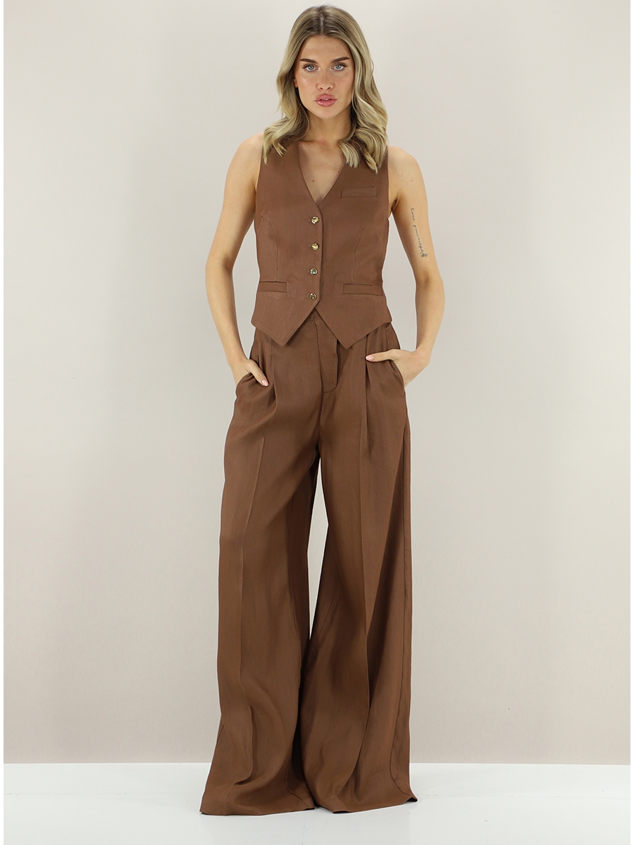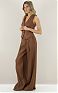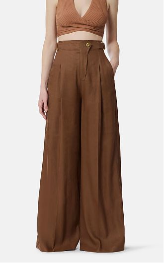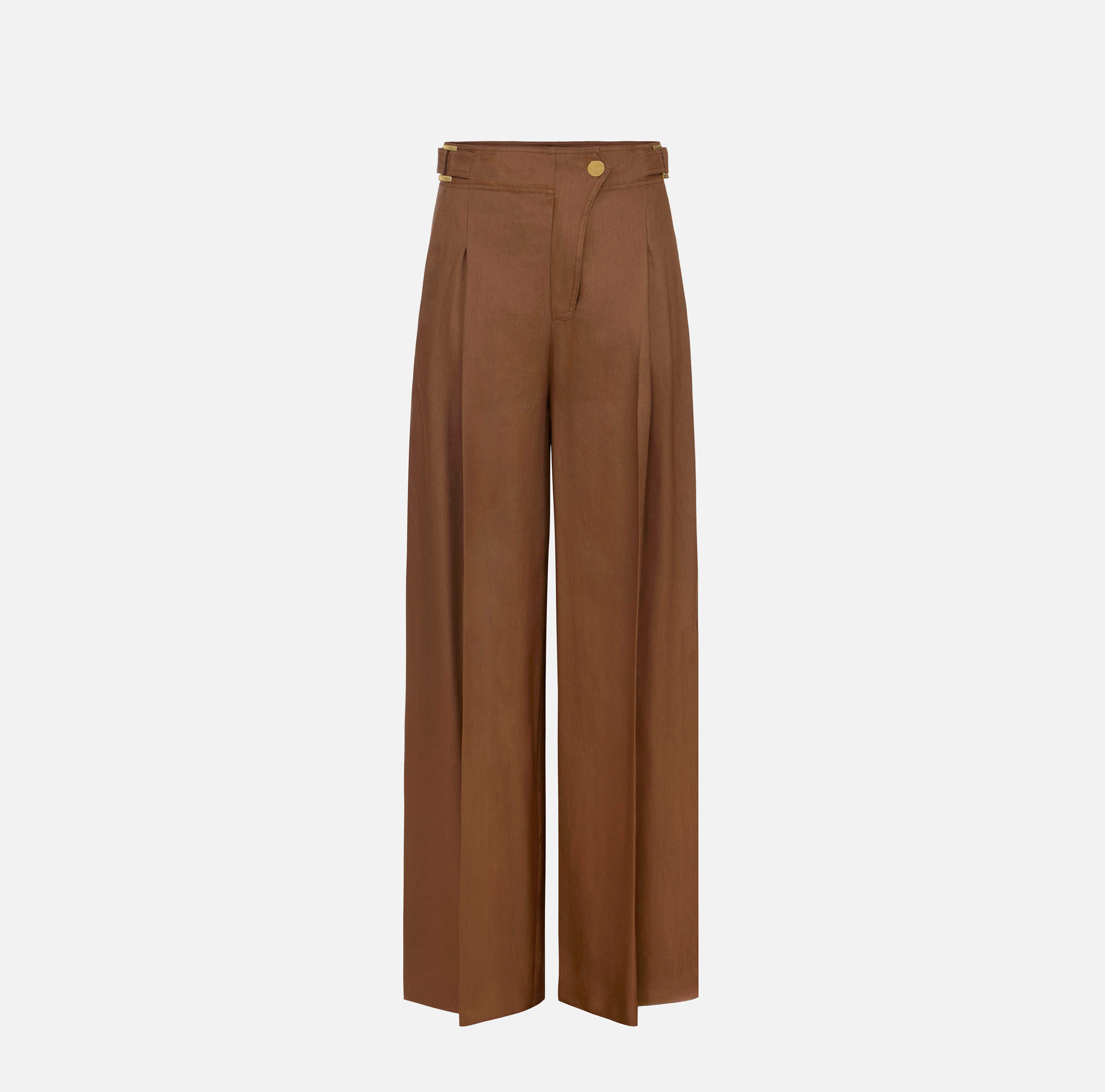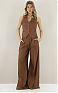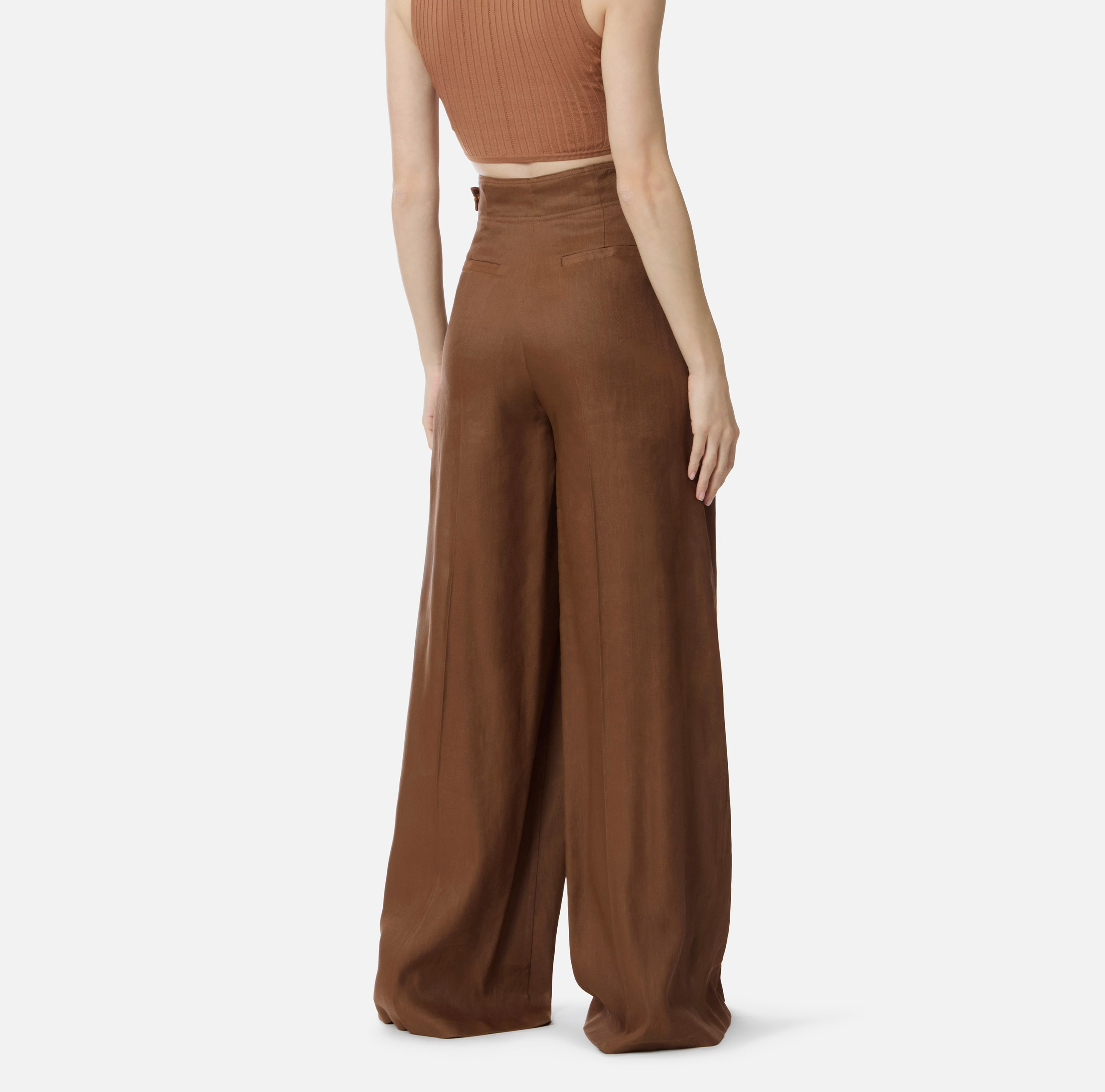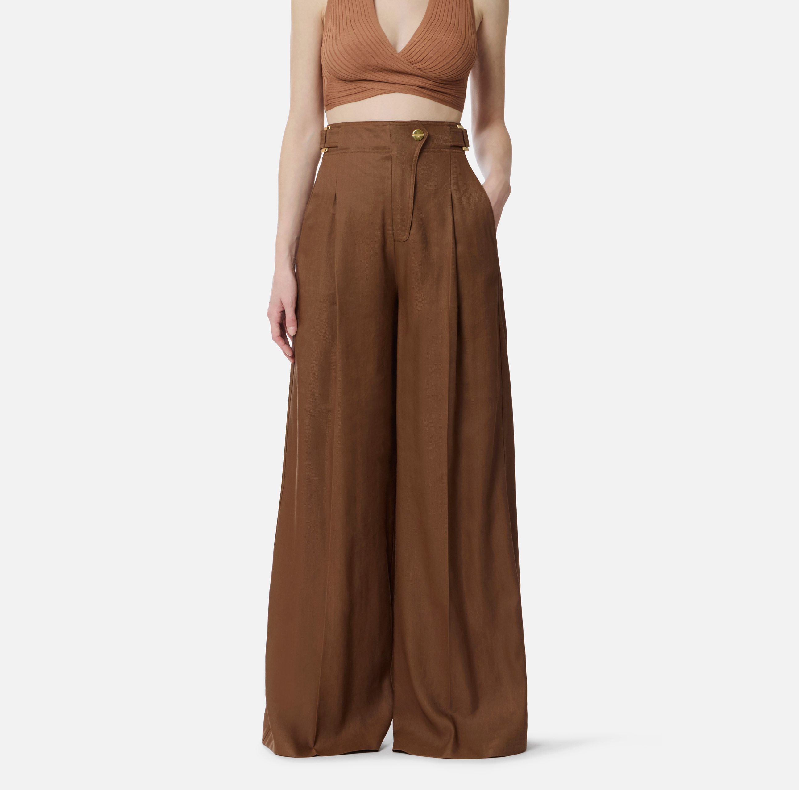 Брюки высокой посадки из льняной ткани. Широкие брючины палаццо дополнены притачным поясом, подчёркнутым ремешками с кольцами из золотистого металла, придающими блестящий штрих. Клапан диагонального кроя вносит в изделие стильный акцент., нового сезона Элизабетта Франчи весна-лето 2026