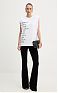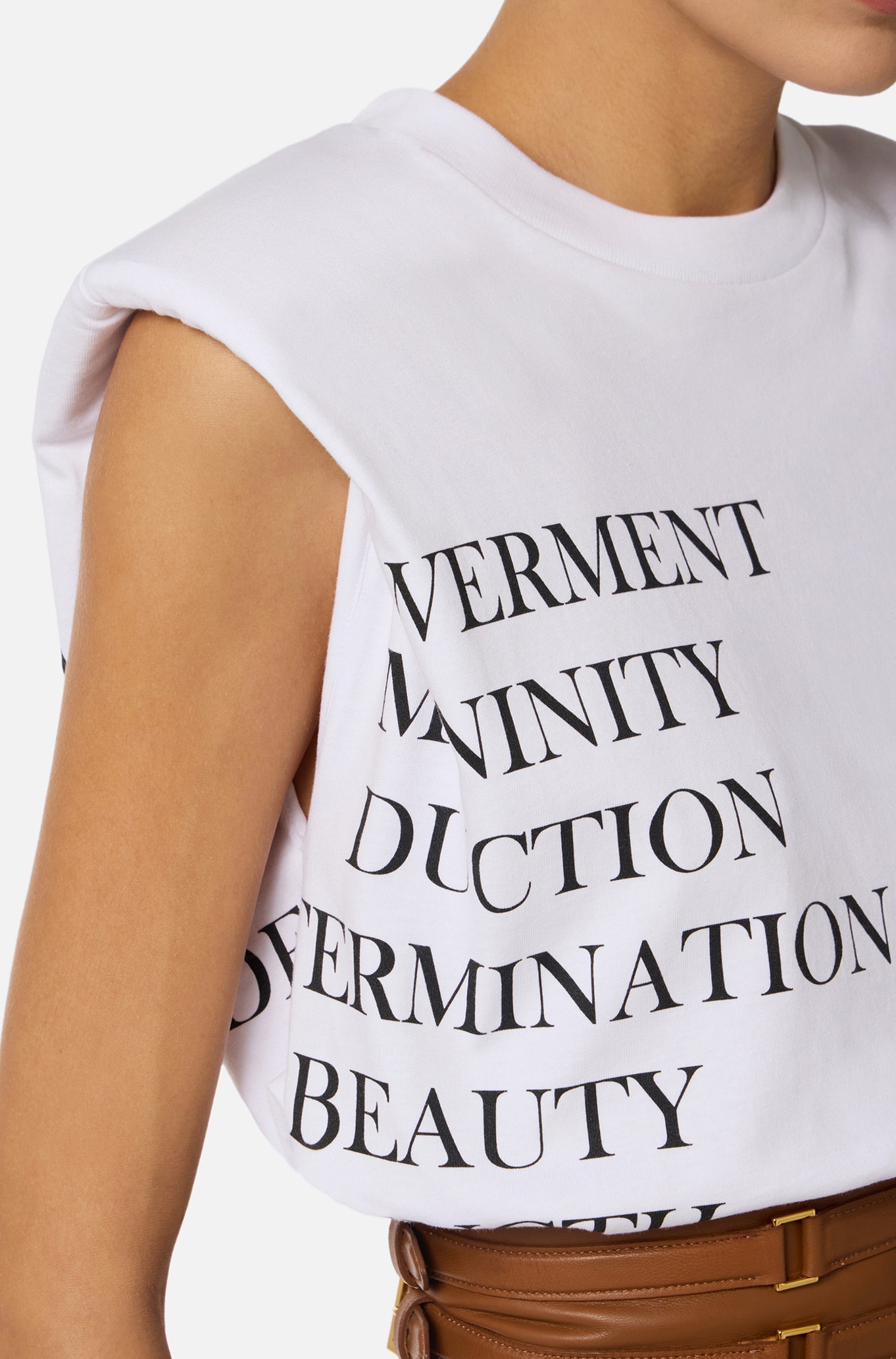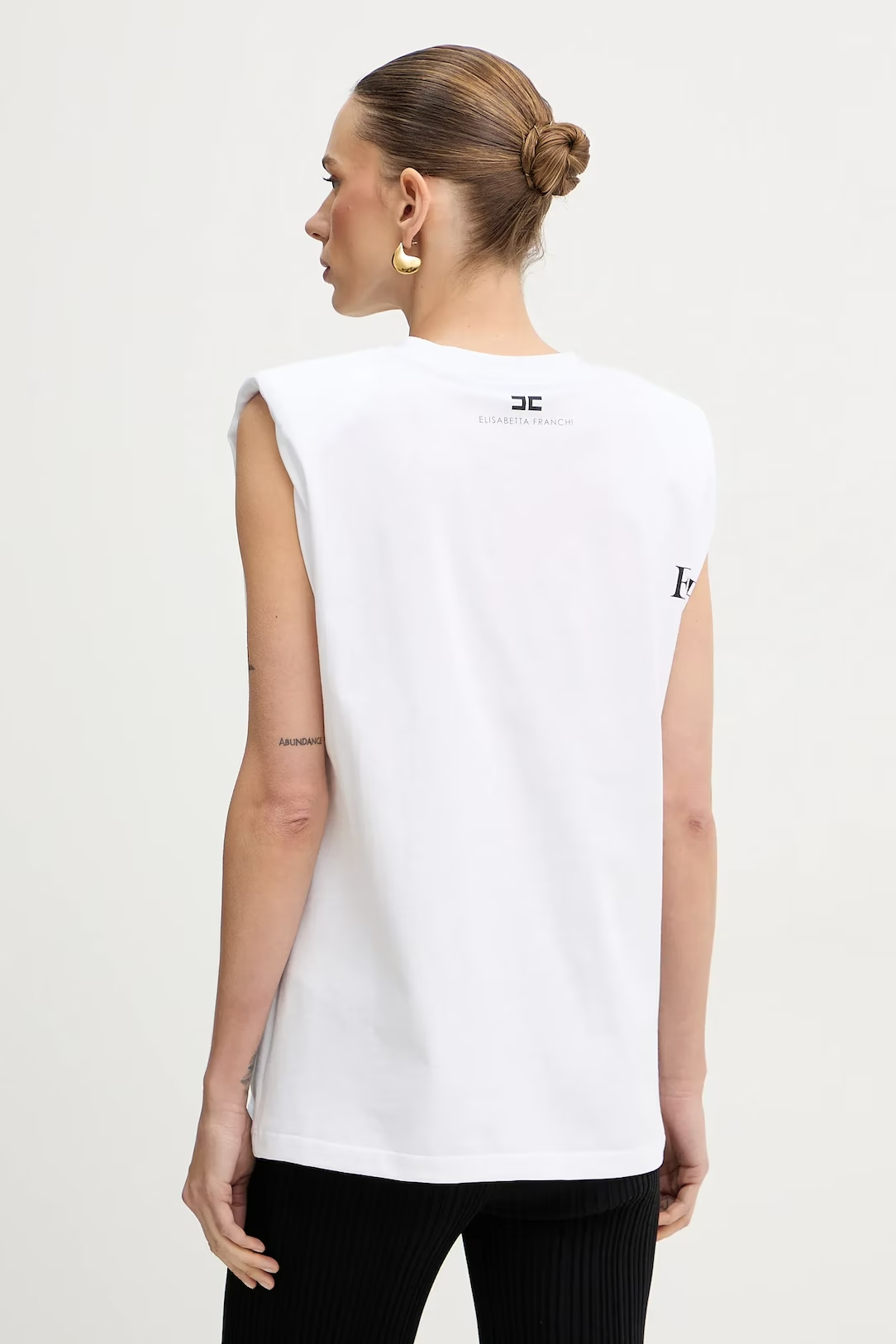 Футболка со структурированными плечами и круглой горловиной, без рукавов. Центральное место занимает расположенный спереди принт-леттеринг, выполненный в контрастном цвете для создания мощного графического эффекта. Классический силуэт, нового сезона Элизабетта Франчи весна-лето 2026