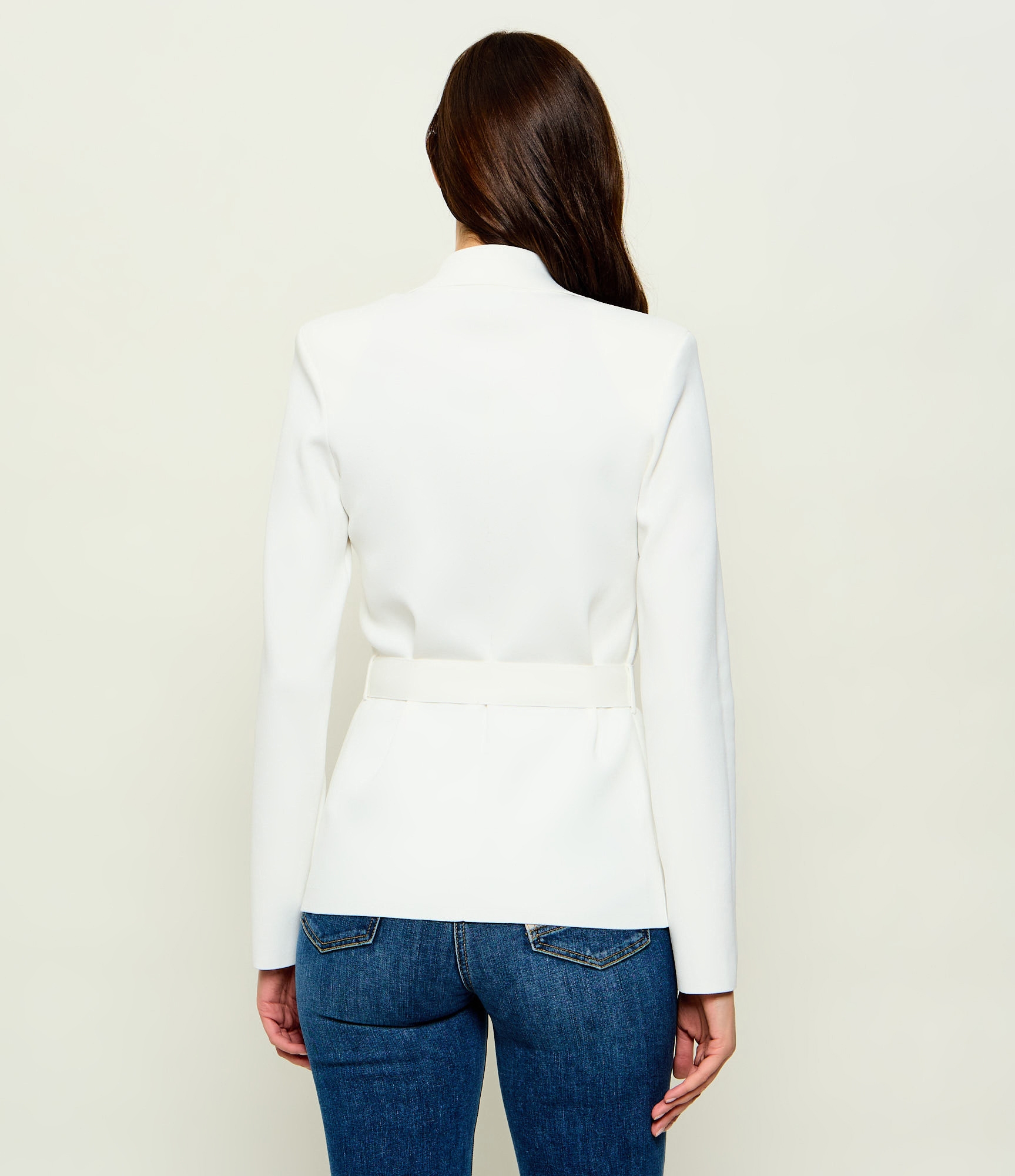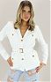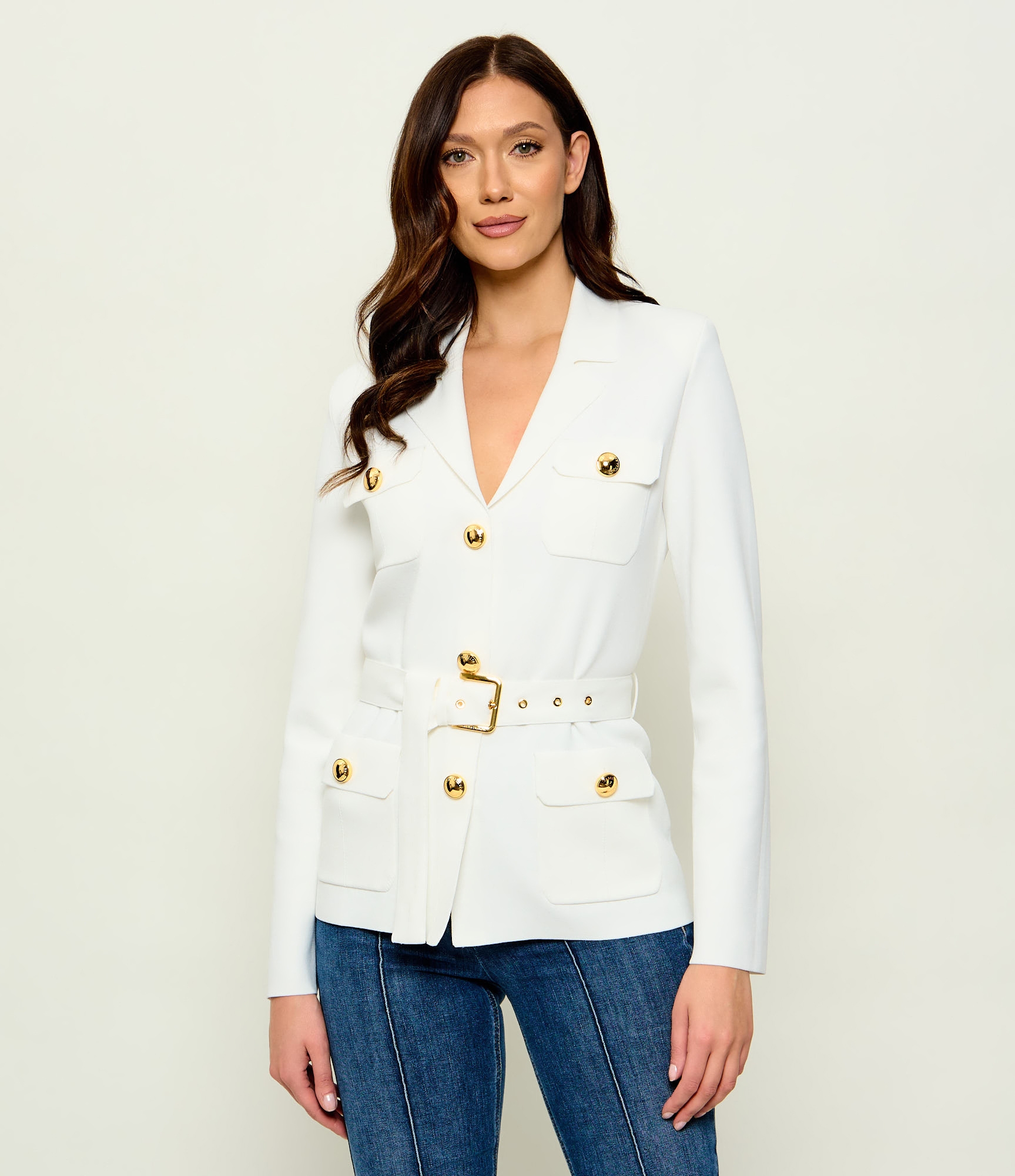 Пиджак из плотного трикотажного полотна. Дизайн изделия, навеянного стилем сафари, завершают накладные карманы с клапаном и блестящие пуговицы из золотистого металла. Ремень со шпеньковой пряжкой подчёркивает линию талии, делая силуэт более универсальным, нового сезона Элизабетта Франчи весна-лето 2026