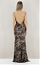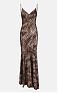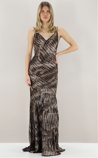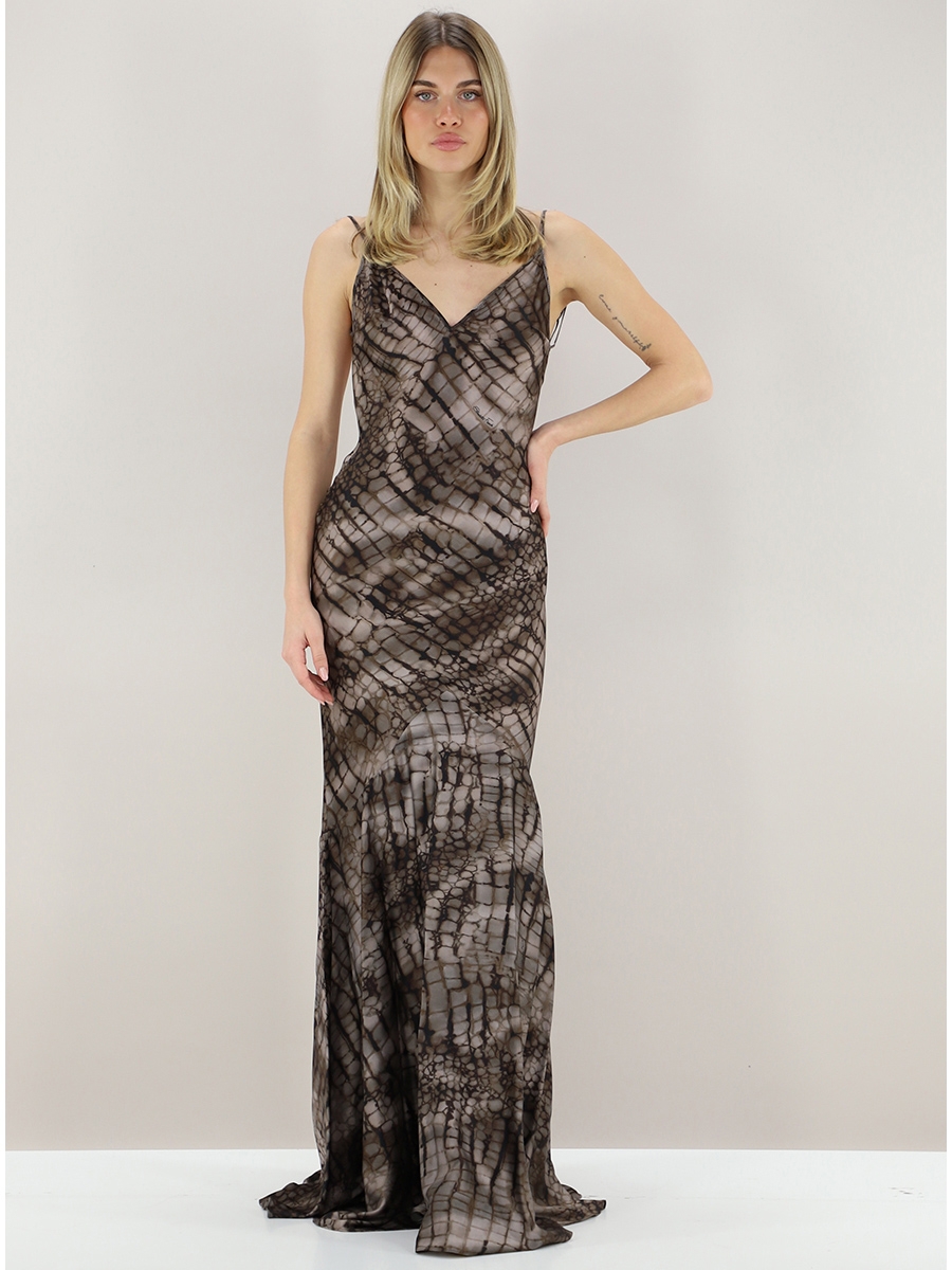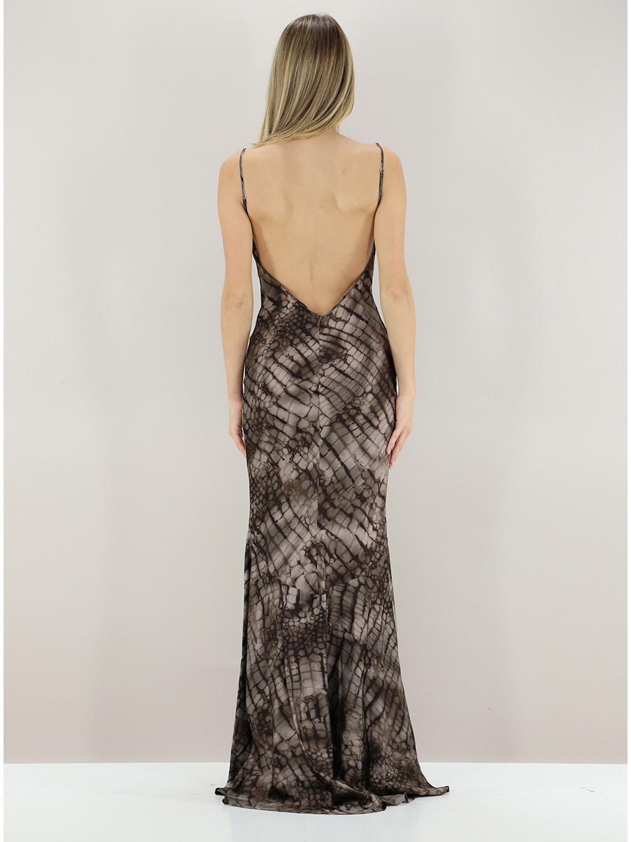 Приталенное вечернее платье из атласа стретч. Модель на тонких бретельках с открытой спинкой. Изюминку в изделие вносит сплошной принт под кожу крокодила, навеянный природными мотивами и формами. Клиньевая юбка создаёт изящный объём внизу нового сезона Элизабетта Франчи весна-лето 2026.