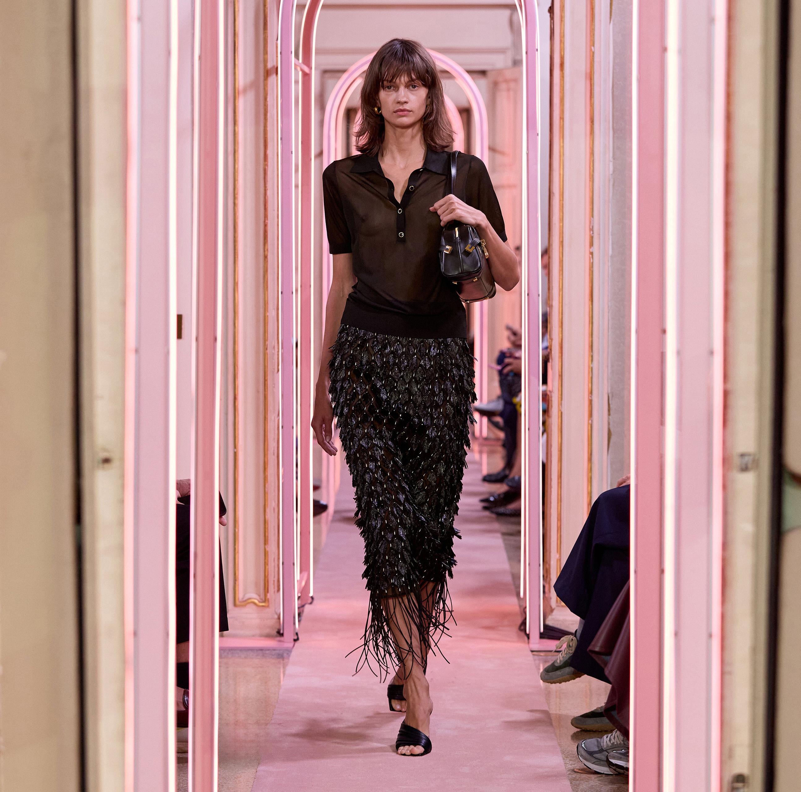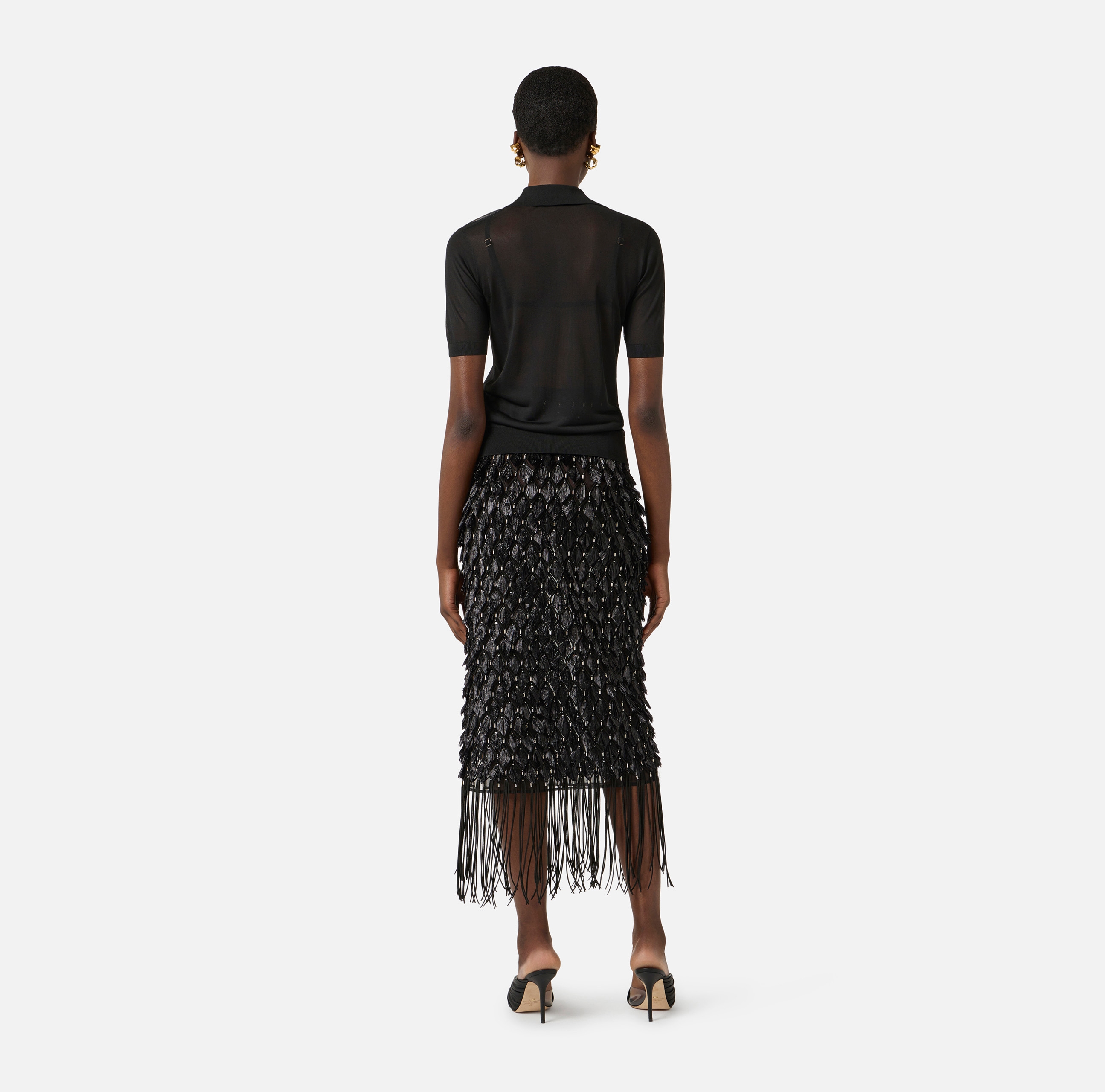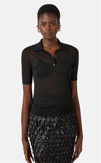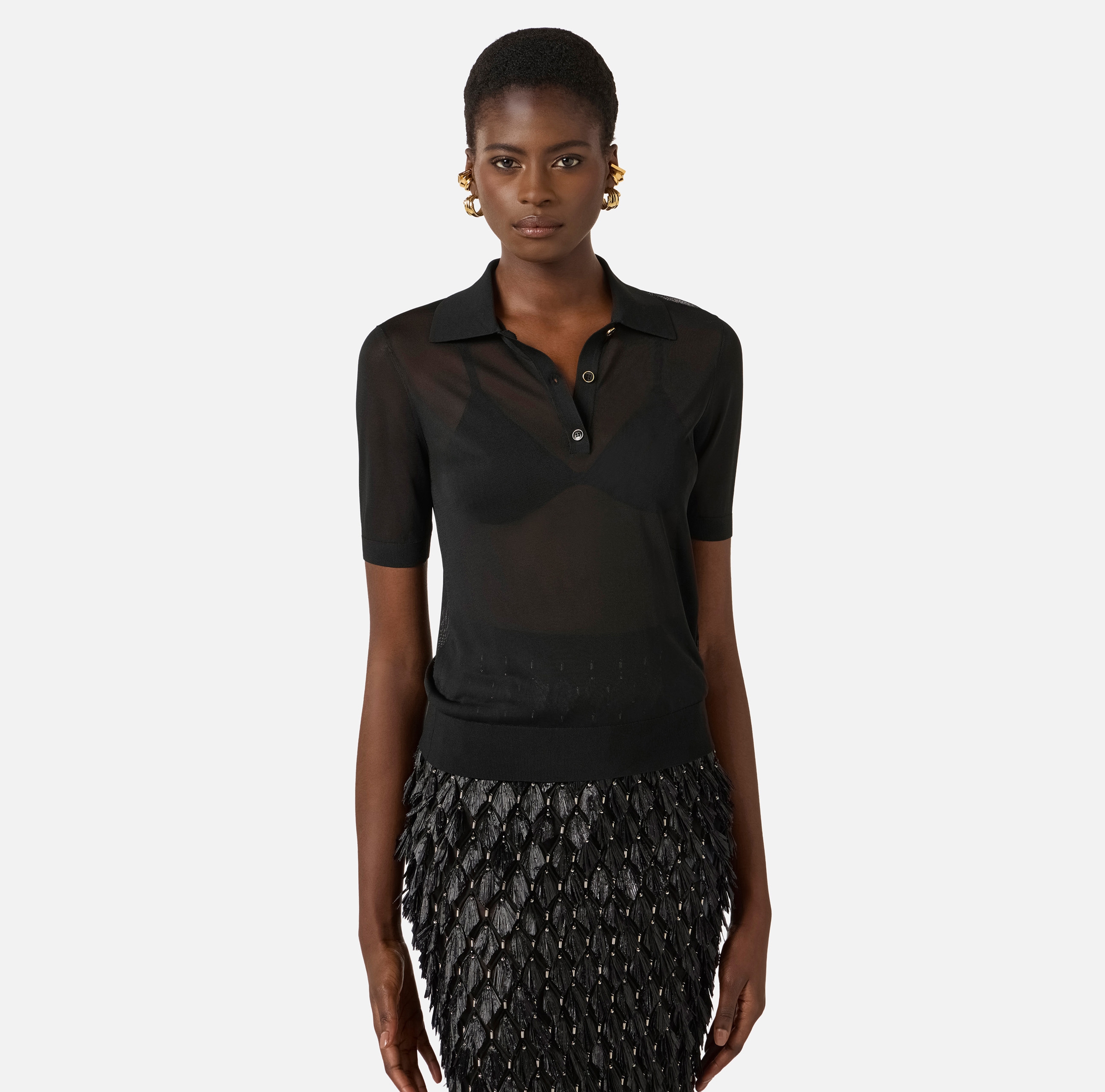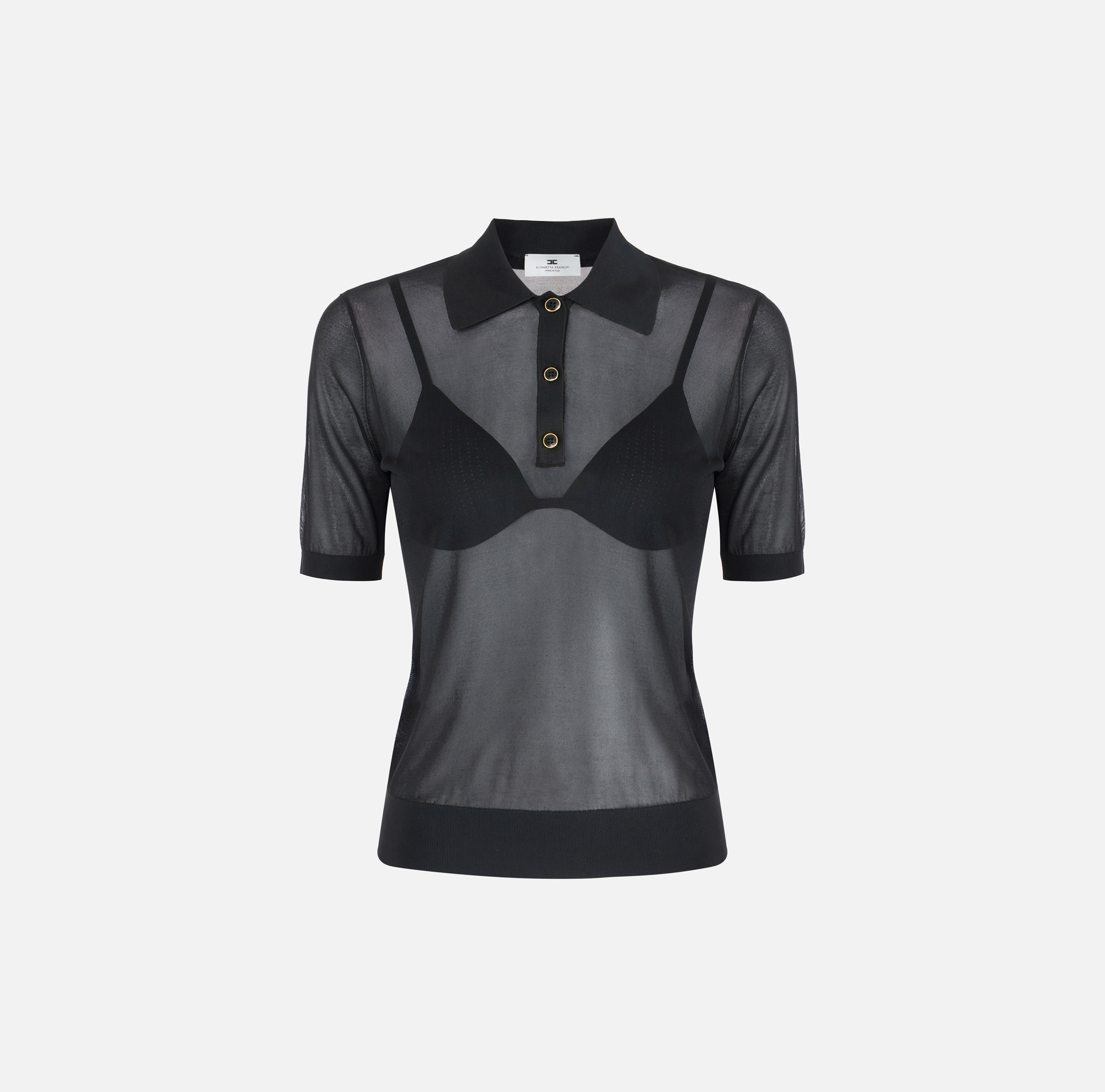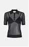 Поло из нейлона с короткими рукавами. Прозрачная текстура материала гармонично контрастирует с воротником и бюстгальтером с треугольным чашками в тон с ажурным мотивом. Кайма в резинку вносит ритмичную нотку в изделие, нового сезона Элизабетта Франчи весна-лето 2026