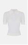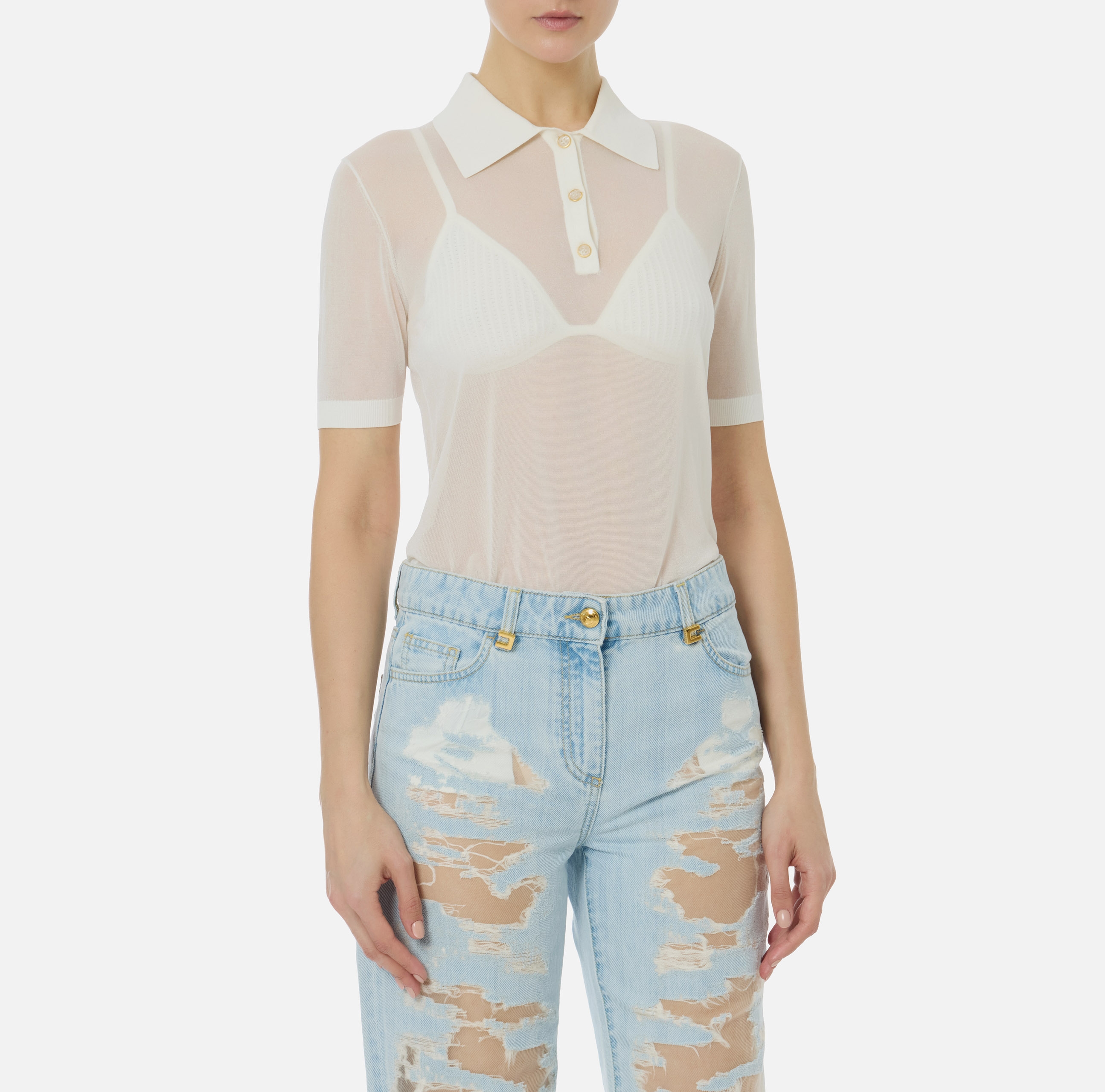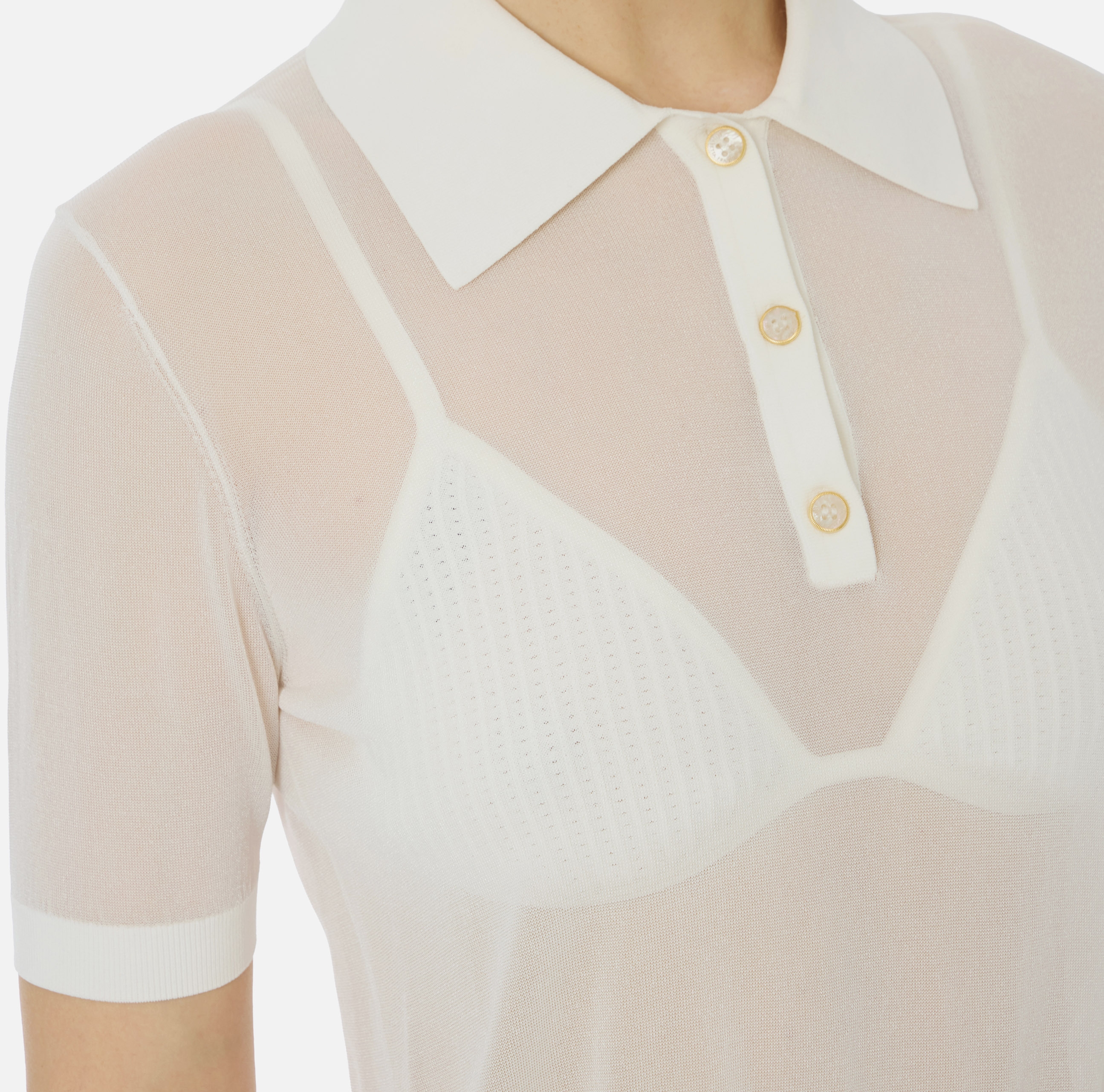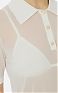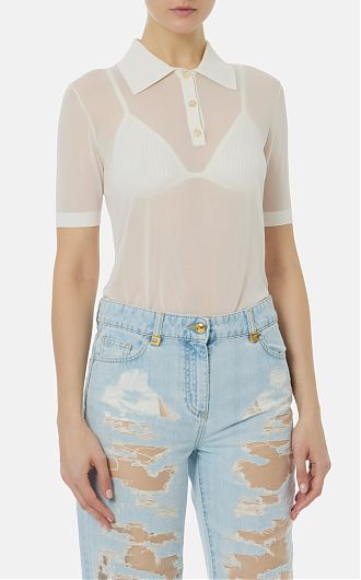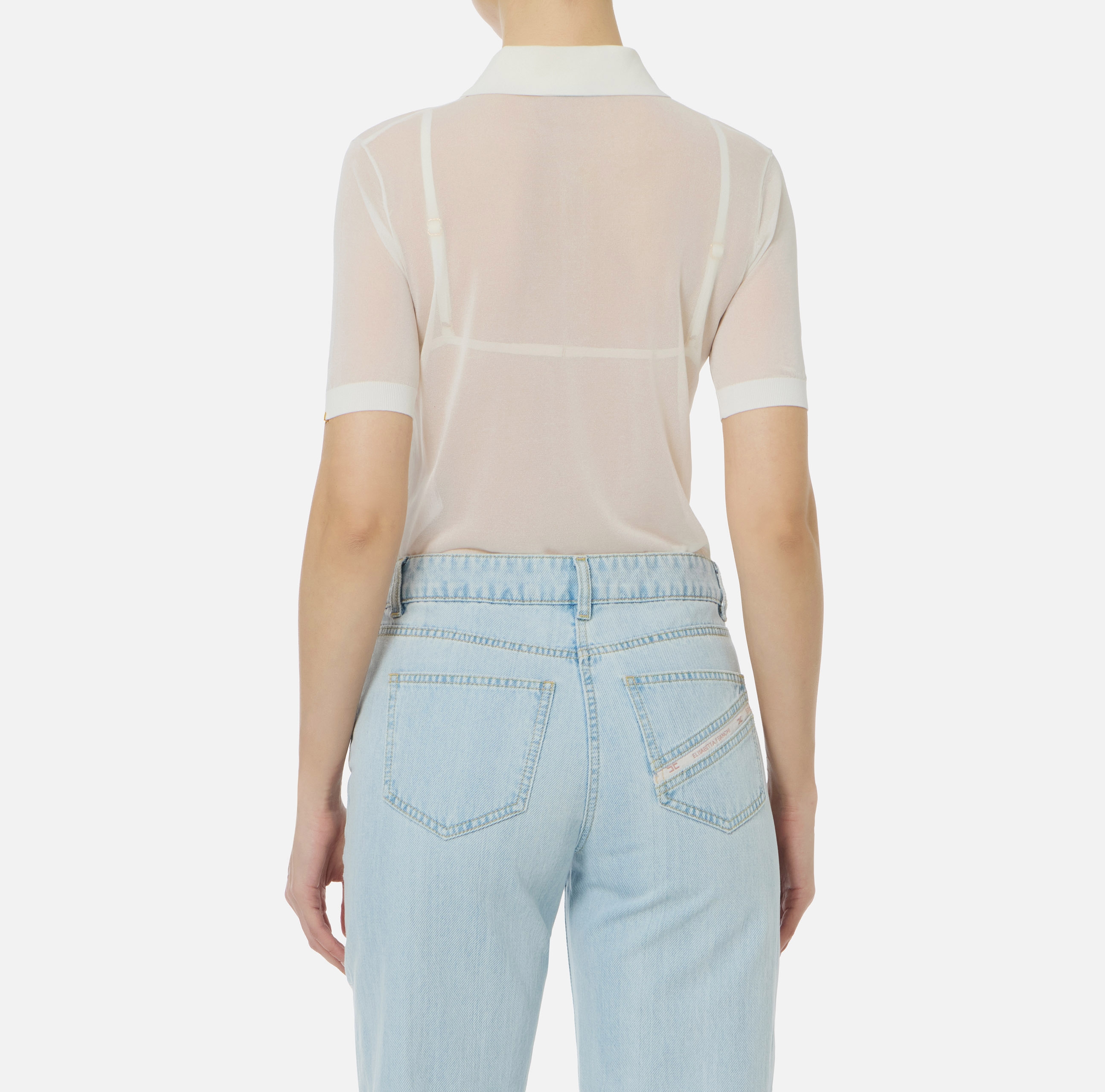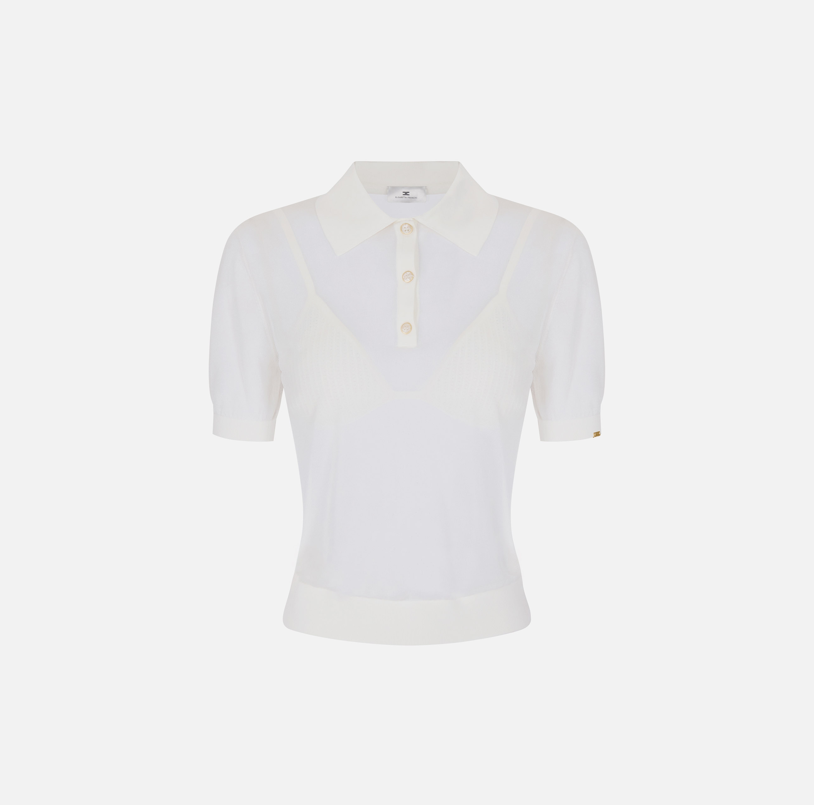 Поло из нейлона с короткими рукавами. Прозрачная текстура материала гармонично контрастирует с воротником и бюстгальтером с треугольным чашками в тон с ажурным мотивом. Кайма в резинку вносит ритмичную нотку в изделие, нового сезона Элизабетта Франчи весна-лето 2026