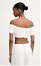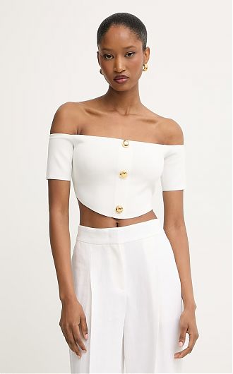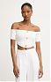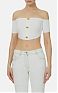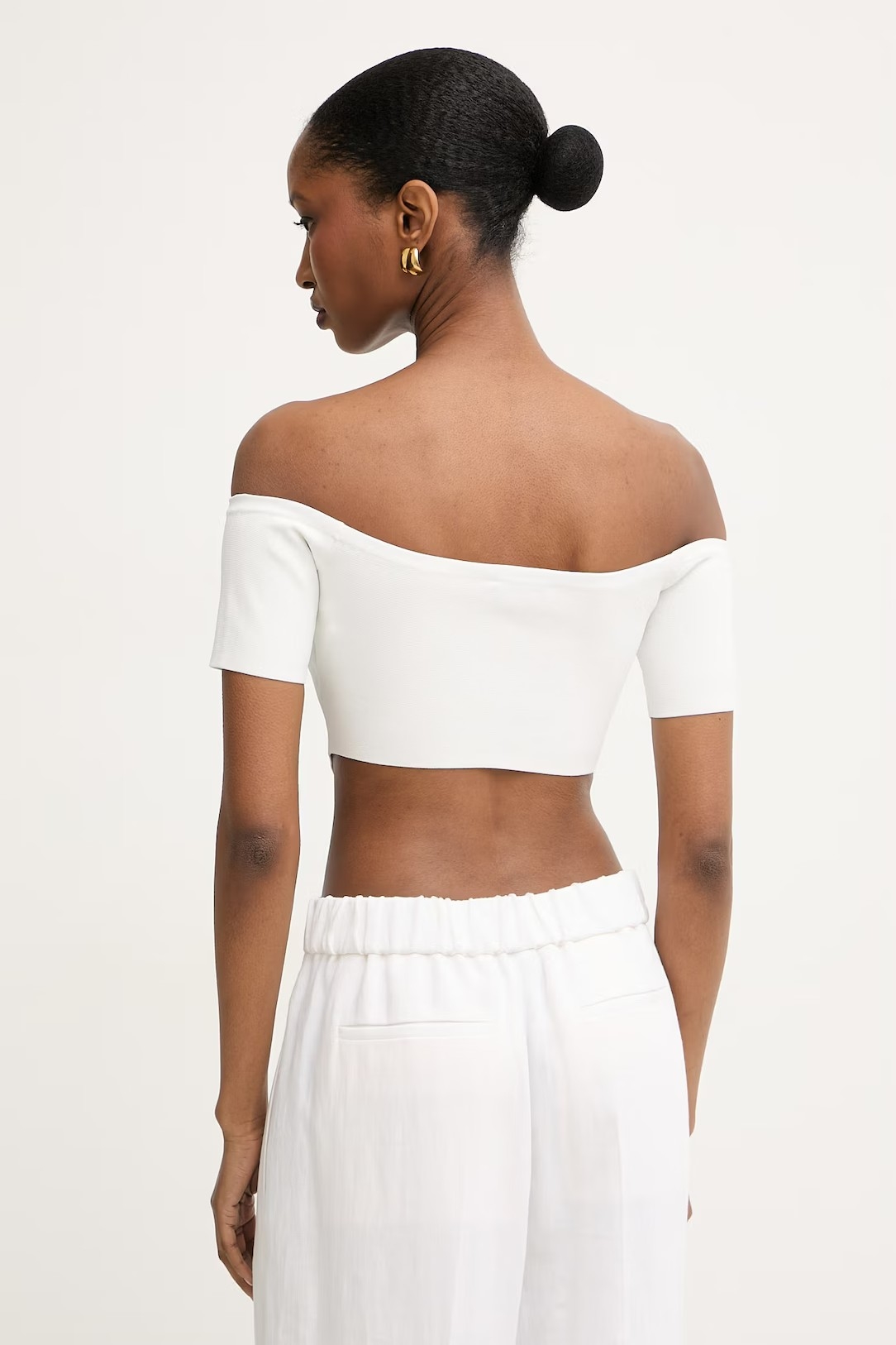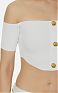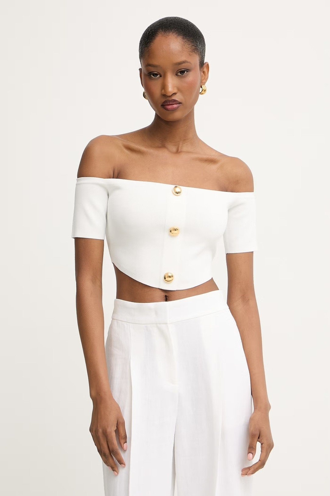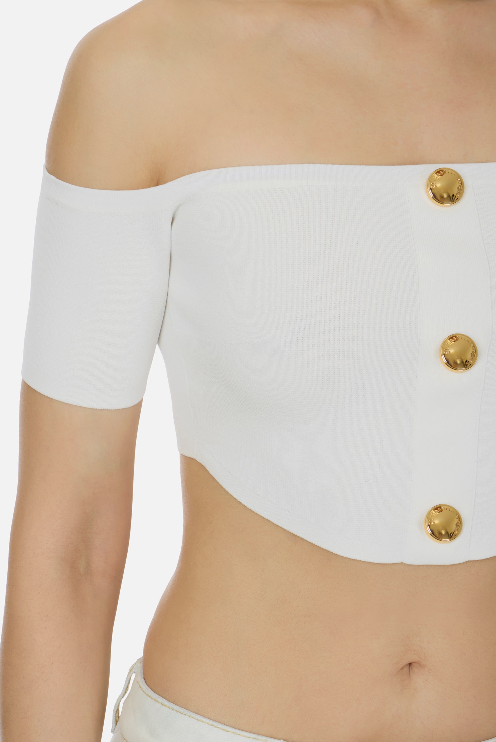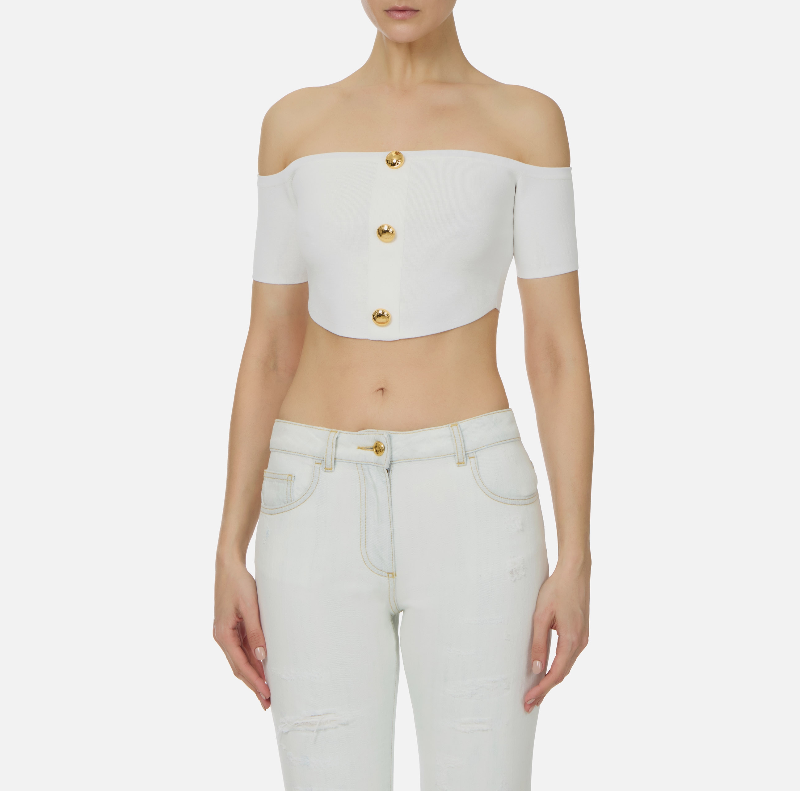 Топ из трикотажа. Кроп-топ с короткими рукавами и вырезом «лодочкой», открывающим плечи. Блестящий акцент добавляют пуговицы из золотистого металла, нового сезона Элизабетта Франчи весна-лето 2026