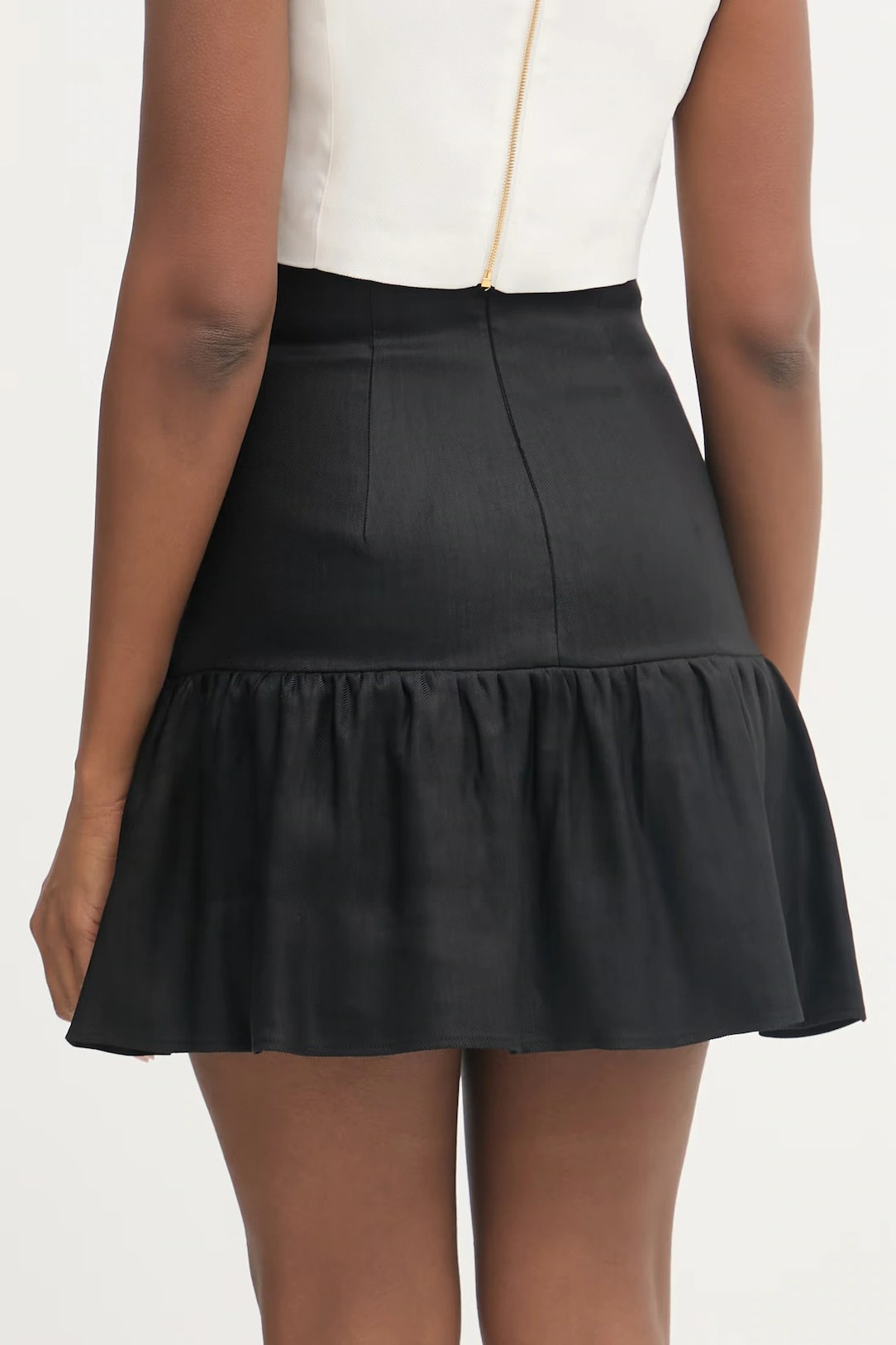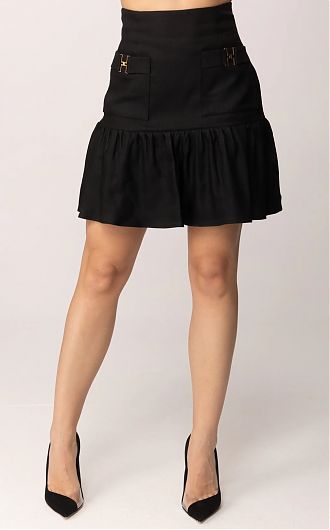 Юбка из смесового льна. Модель высокой посадки плотно сидит на бёдрах. Пущенная по подолу оборка создаёт эффект движения. Накладные карманы украшены блестящими деталями в виде роскошных шлёвок с логотипом из золотистого металла, нового сезона Элизабетта Франчи весна-лето 2026