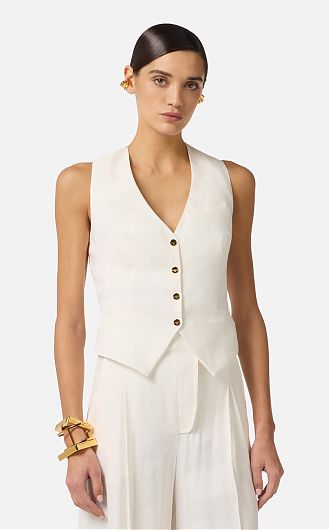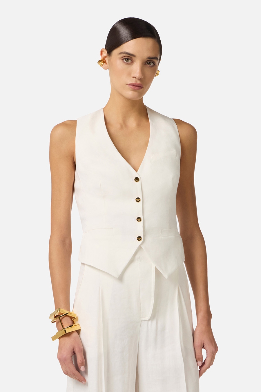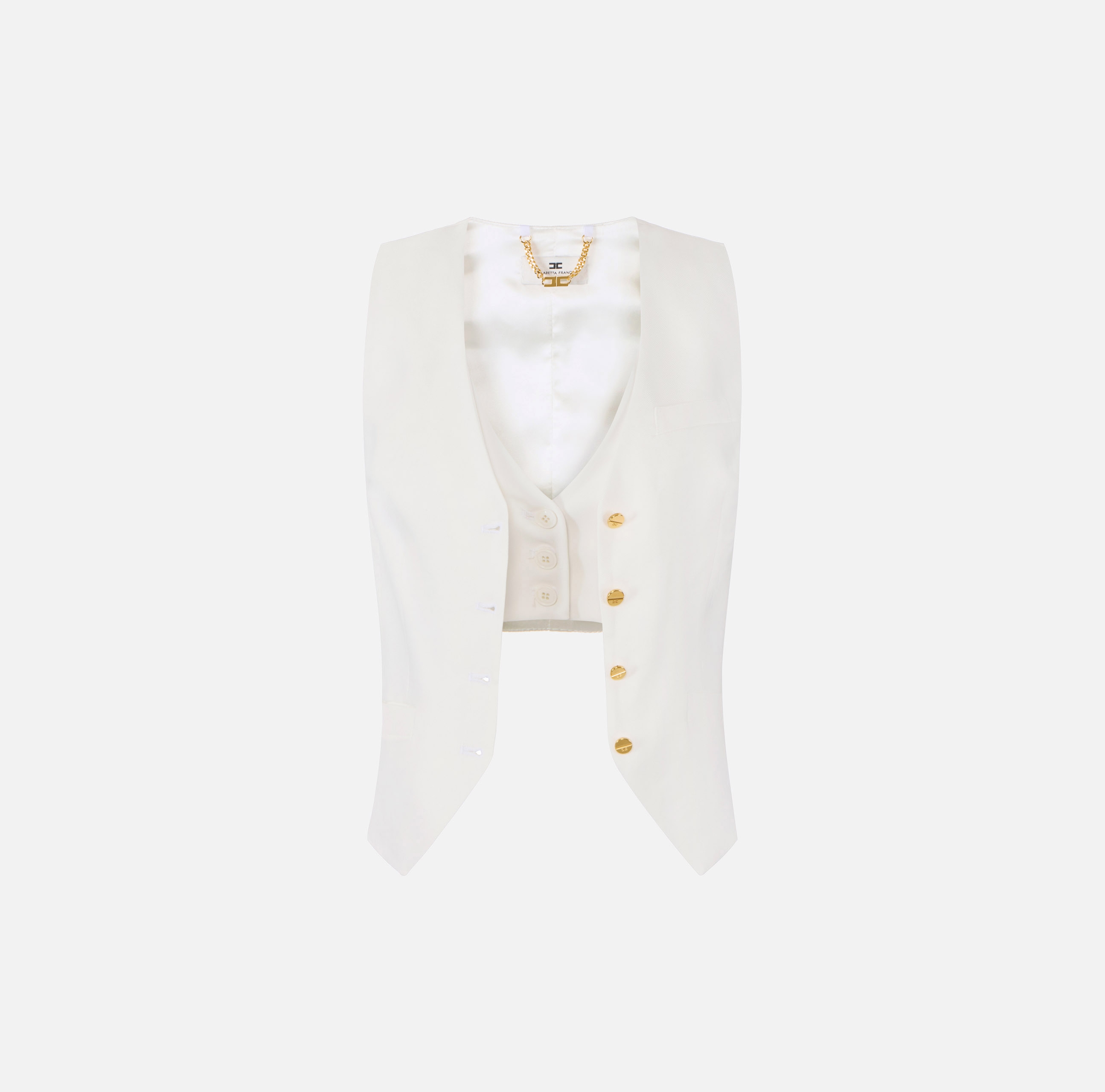 Жилет из льна. Модель характеризуется асимметричными вытачками и двойным жилетом из крепа. Ремешки с кольцом на спинке и пуговицы из золотистого металла с блеском завершают дизайн изделия, нового сезона Элизабетта Франчи весна-лето 2026