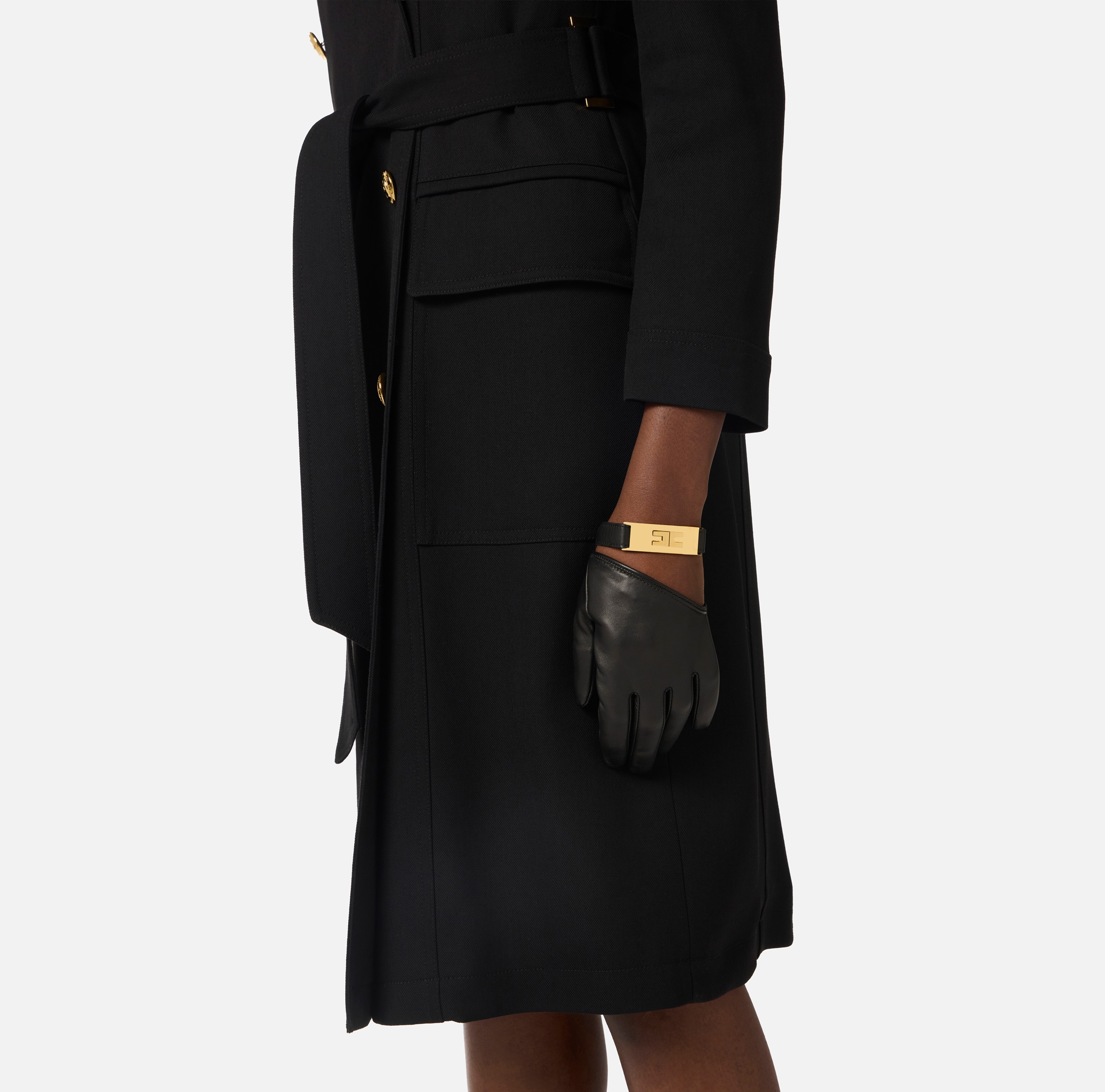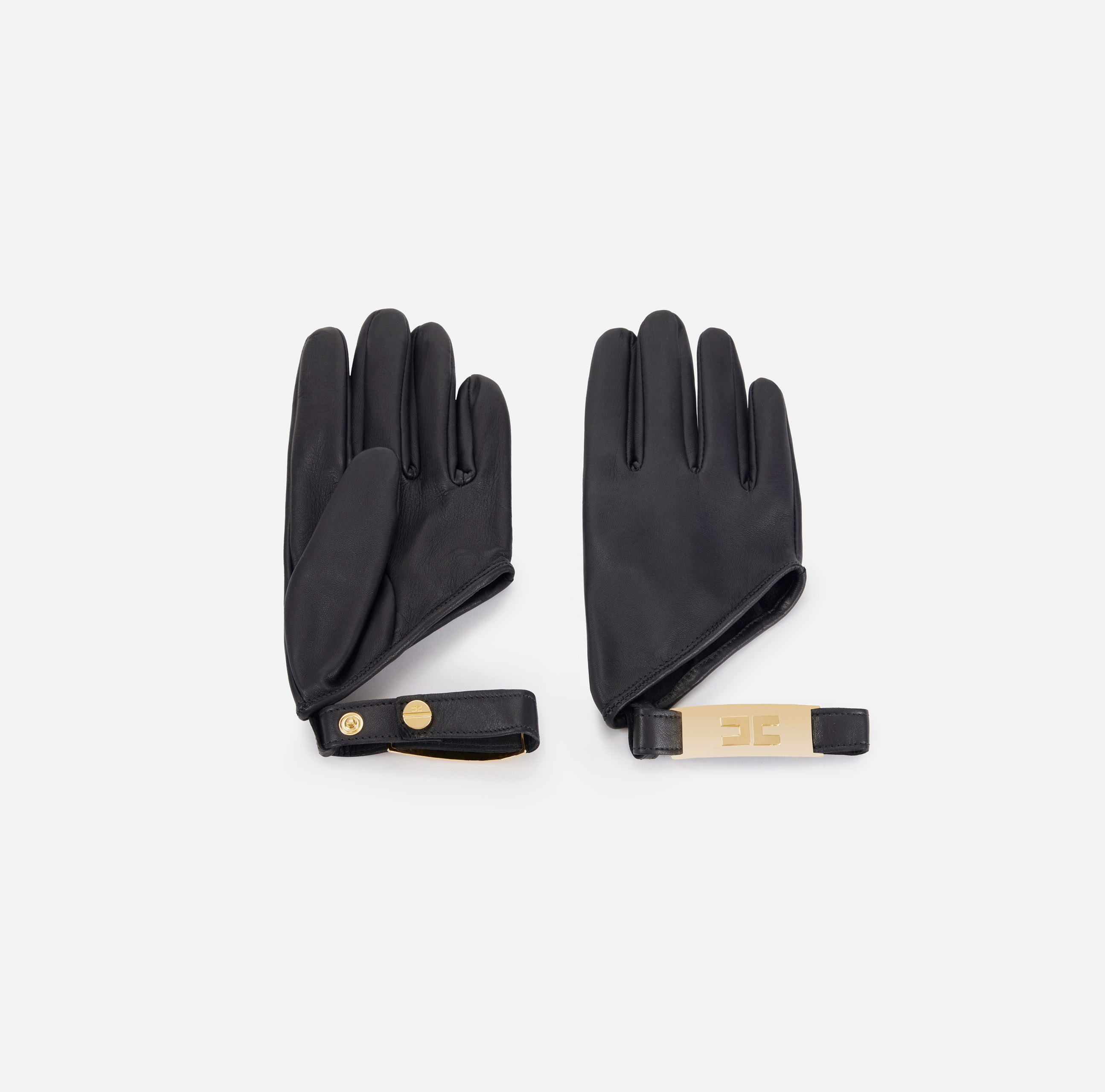 Перчатки из кожи наппа. Ремешки-манжеты, украшенные пластинкой из золотистого металла с текстурной отделкой, эффектно огибают запястья. Застёжка на кнопки, нового сезона Элизабетта Франчи весна-лето 2026.